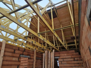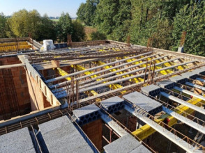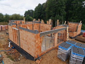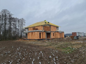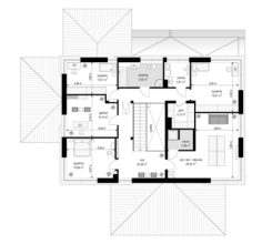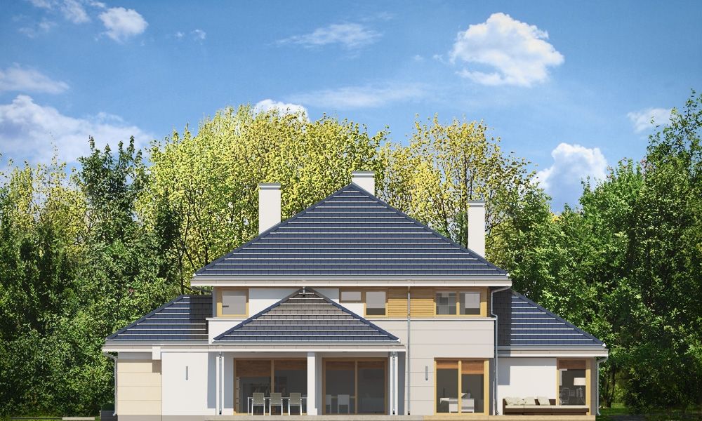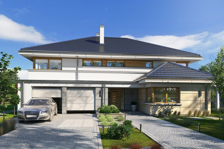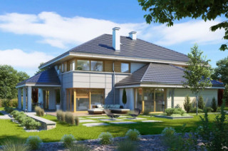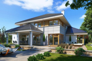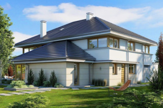 Projekt domu Willa komfortowa jest siostrzanym projektem naszego popularnego projektu „Willa z basenem”. Różni się jednak od swojego protoplasty przede wszystkim tym, że nie ma części basenowej. Projekt domu Willa komfortowa jest wygodną rezydencją dla dwu- lub trzypokoleniowej rodziny. Na piętrze mamy pięć sypialni, a na parterze mamy apartament rodziców, oraz dodatkowe osobne mieszkanko - dla seniorów, lub niani czy też gosposi mieszkającej w domu. Naprawdę wnętrze jest bardzo obszerne i można je na wiele sposobów zagospodarować. Dodatkowe mieszkanie może też być biurem, gabinetem czy przydomową firmą. Architektura domu: budynek jest piętrowy, jego główną bryłę przykrywa czterospadowy dach. Do głównej bryły domu dobudowane są parterowe dobudówki. Elewacje podzielone są na poziome pasy wykończone różnymi materiałami - kamieniem i tynkiem. Okna, przeważnie narożne podkreślają nowoczesny willowy styl. Całość tworzy bardzo atrakcyjną, reprezentacyjną rezydencję miejską. Prawdziwą siedzibę. Do domu wchodzimy przez szerokie drzwi wejściowe z naświetlami, obserwowani z narożnego okna w kuchni do przedsionka i dalej do holu. Hol z reprezentacyjnymi schodami łączy się tutaj z pięknym salonem połączonym z jadalnią. Z salonu przez narożne przeszklenia rozpościera się widok na otaczające tarasy i ogród. Kuchnia jest nieco oddzielona od reszty domu - może być zamknięta przesuwnymi chowanymi drzwiami. Z jadalni przechodzimy do pięknego ogrodowego zadaszonego tarasu. Z drugiej strony domu mamy część garażowo-gospodarczą z podwójnym garażem i kotłownią, dodatkowy lokal – mieszkanie, oraz apartament rodziców z łazienką i podwójną garderoba. Na piętrze przewidziano aż pięć pokoi, dwie łazienki i garderobę. Hol na piętrze jest połączony z holem na parterze pustką obok schodów. To dodaje wnętrzu sznytu i reprezentacyjnego wyglądu i poczucia dużej przestrzeni. Projekt domu Willa komfortowa do świetna propozycja dla Inwestorów, którzy potrzebują rozbudowanego programu użytkowego i wielu pomieszczeń i - co tu dużo mówić – dla szczęściarzy, którzy mogą sobie pozwolić na duży dom. Jeśli szukają Państwo domu o powierzchni powyżej 300 m², to nasz projekt może być dobrym wyborem. Budynek ma w sumie dość prostą bryłę, nie ma bardzo skomplikowanej konstrukcji, jest dobrze ocieplony, ma nowoczesne instalacje. Będzie raczej nietrudny z budowie i dość niedrogi w późniejszej eksploatacji. Zapraszamy !
