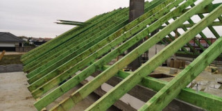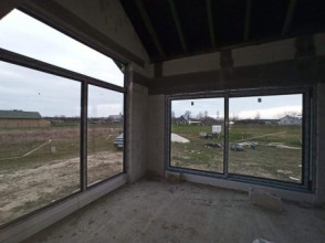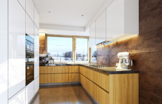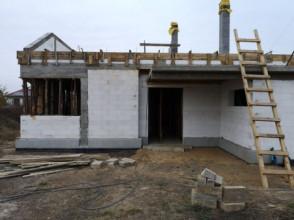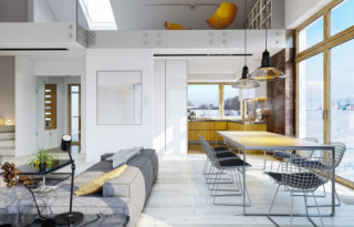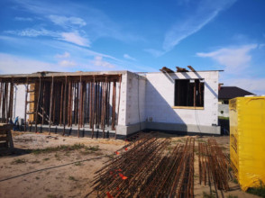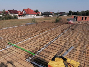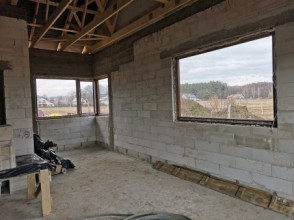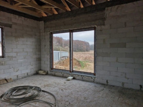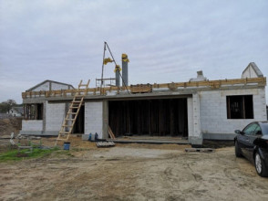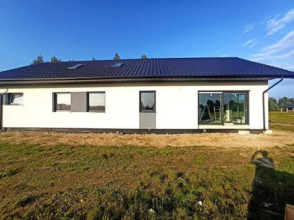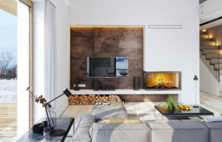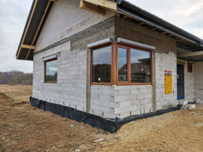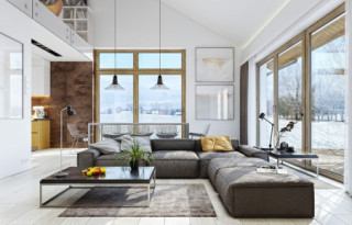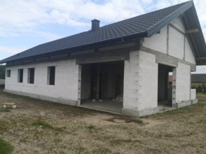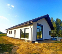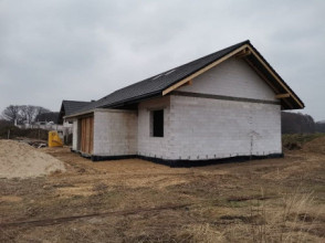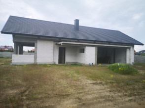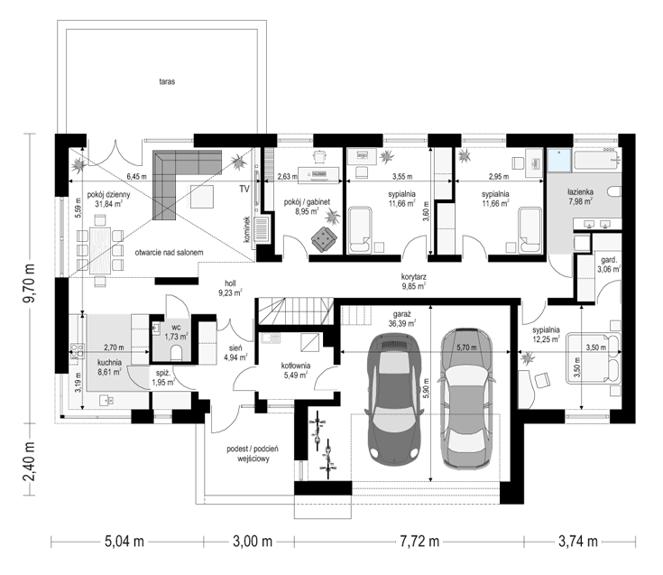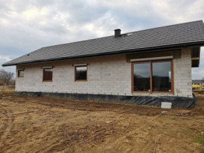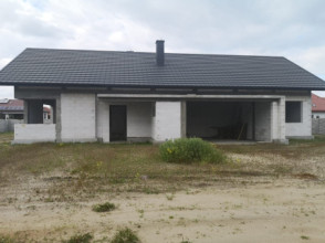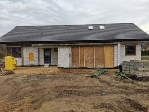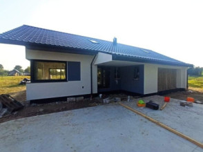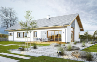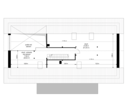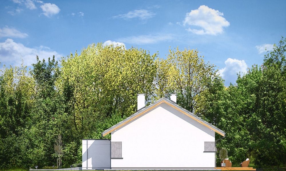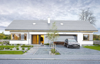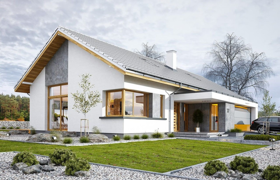 Projekt domu Wymarzony 5 czyli kolejny projekt z serii domów „Wymarzonych” z naszej pracowni. Budynek jest parterowy z poddaszem do zagospodarowania, zbudowany na planie prostokąta, z wystającą na froncie częścią garażową, przykryty dwuspadowym dachem o kącie nachylenia 30 stopni. Projekt domu Wymarzony 5 ma nowoczesną stylistykę i łączy tradycyjną bryłę z nowoczesnymi materiałami wykończeniowymi i detalami. Połączenie tynkowanych fragmentów ścian z okładzinami imitującymi beton, oraz szarą lub grafitową dachówką dają elegancki i reprezentacyjny wygląd budynku. Głównymi detalami stylistycznymi są: wystający garaż, podcień wejściowy i reprezentacyjne drzwi frontowe z naświetlami. W szczycie i z tyłu domu salon zdobią duże przeszklenia otwierające wnętrze na otaczający ogród. Wnętrze: oryginalna lokalizacja garażu, w centralnej części bryły, ułatwia komunikację między garażem, przedsionkiem i kotłownią, co jest rzadko spotykane w domach parterowych o prostokątnym kształcie. Garaż jest w idealnym miejscu - przy wejściu, blisko holu, kuchni i spiżarni. Z przedsionka wchodzimy do holu i na wprost do pokoju dziennego. Salon doświetlony jest z dwóch stron - od ogrodu szerokimi drzwiami tarasowymi, oraz z szczycie budynku podwyższonym oknem z naświetlem wpuszczającym dużo światła i będącym atrakcją przestrzeni dziennej. Dodatkową atrakcją jest oczywiście pustka nad salonem z antresolą na poddaszu. Z drugiej strony domu mamy cztery pokoje, łazienkę i garderobę. Nad parterem zaprojektowano poddasze, z antresolą nad salonem powiększającą jego przestrzeń, oraz dodatkową powierzchnię poddasza, która może pozostać strychem nieużytkowym (magazynem domowym), lub może być zagospodarowana na pokoje użytkowe - według życzenia i potrzeb właścicieli. Projekt domu Wymarzony 5 to komfortowa, wygodna i nowoczesna willa dla cztero-sześcioosobowej rodziny - funkcjonalna i praktyczna. Budynek jest energooszczędny, ma prostą konstrukcję, będzie łatwy w budowie i tani w utrzymaniu. Zapraszamy do zapoznania się z pełną ofertą pracowni MG Projekt tej serii: Wymarzony, Wymarzony 2, Wymarzony 3, Wymarzony 4, Wymarzony 6, Wymarzony 7, Wymarzony 8, Wymarzony 9, Wymarzony 10, Wymarzony 11.