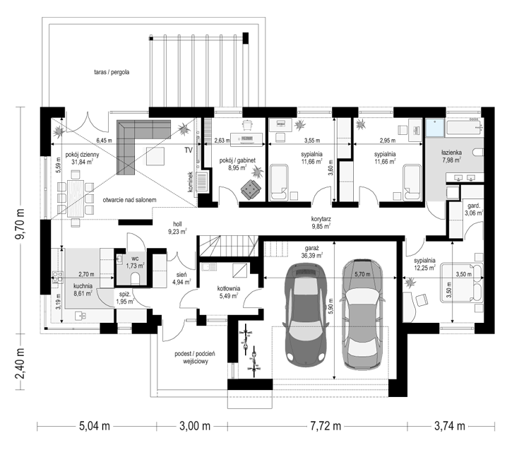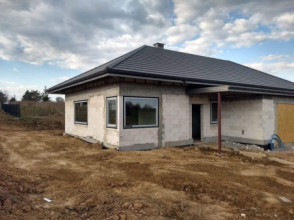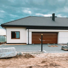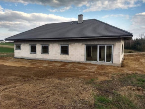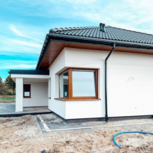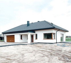 Projekt domu Wymarzony 6 to kolejny projekt z serii domów „Wymarzonych” z naszej pracowni. Dom parterowy, z poddaszem do zagospodarowania, zbudowany na planie prostokąta, z wystającą na froncie częścią garażową, przykryty czterospadowym dachem o kącie nachylenia 30 stopni. Projekt domu Wymarzony 6 ma nowoczesną stylistykę i łączy tradycyjną bryłę z klasycznym dachem, z nowoczesnymi materiałami wykończeniowymi i detalami. Połączenie białych tynkowanych ścian z okładzinami imitującymi beton, oraz szarą lub grafitową dachówką dają elegancki i reprezentacyjny wygląd budynku. Dom mimo niewielkiej powierzchni sprawia wrażenie bardzo komfortowego i większego niż jest w rzeczywistości. Głównymi detalami stylistycznymi projektu są: wystające garaż i podcień wejściowy,oraz reprezentacyjne drzwi frontowe z naświetlami. Od strony ogrodowej mamy duże przeszklenia otwierające salon na taras i ogród, oraz pergolę przykrywającą część tarasu. Wnętrze :inna niż przeważnie lokalizacja garażu, w centralnej części bryły, ułatwia komunikację między garażem, przedsionkiem i kotłownią, co jest rzadko spotykane w domach parterowych o prostokątnym kształcie. Garaż jest w świetnym miejscu - przy wejściu, blisko holu, kuchni i spiżarni. Z przedsionka wchodzimy do holu i na wprost do pokoju dziennego. Salon doświetlony jest z dwóch stron - od ogrodu szerokimi drzwiami tarasowymi, oraz od szczytu budynku. Atrakcją salonu jest pustka nad salonem z antresolą na poddaszu, powiększająca przestrzeń dzienną wizualnie. Z drugiej strony domu mamy cztery pokoje, łazienkę i garderobę. Nad parterem zaprojektowano poddasze, z antresolą nad salonem powiększającą jego przestrzeń, oraz dodatkową powierzchnię poddasza, która może pozostać strychem nieużytkowym (magazynem domowym), lub może być zagospodarowana na pokoje użytkowe - według życzenia i potrzeb właścicieli. Projekt domu Wymarzony 6 to komfortowa, wygodna willa dla cztero- sześcioosobowej rodziny - funkcjonalna i praktyczna. Budynek jest energooszczędny, ma prostą konstrukcję, będzie łatwy w budowie i tani w utrzymaniu. Zapraszamy do zapoznania się z pełną ofertą pracowni MG Projekt tej serii: Wymarzony, Wymarzony 2, Wymarzony 3, Wymarzony 4, Wymarzony 5, Wymarzony 7, Wymarzony 8, Wymarzony 9, Wymarzony 10, Wymarzony 11.