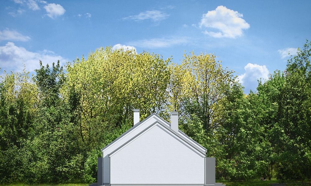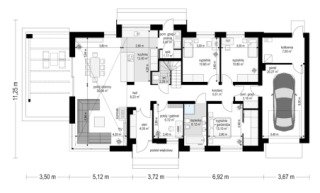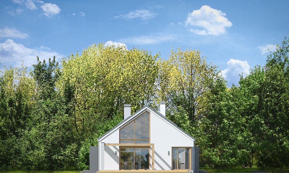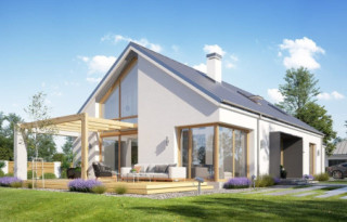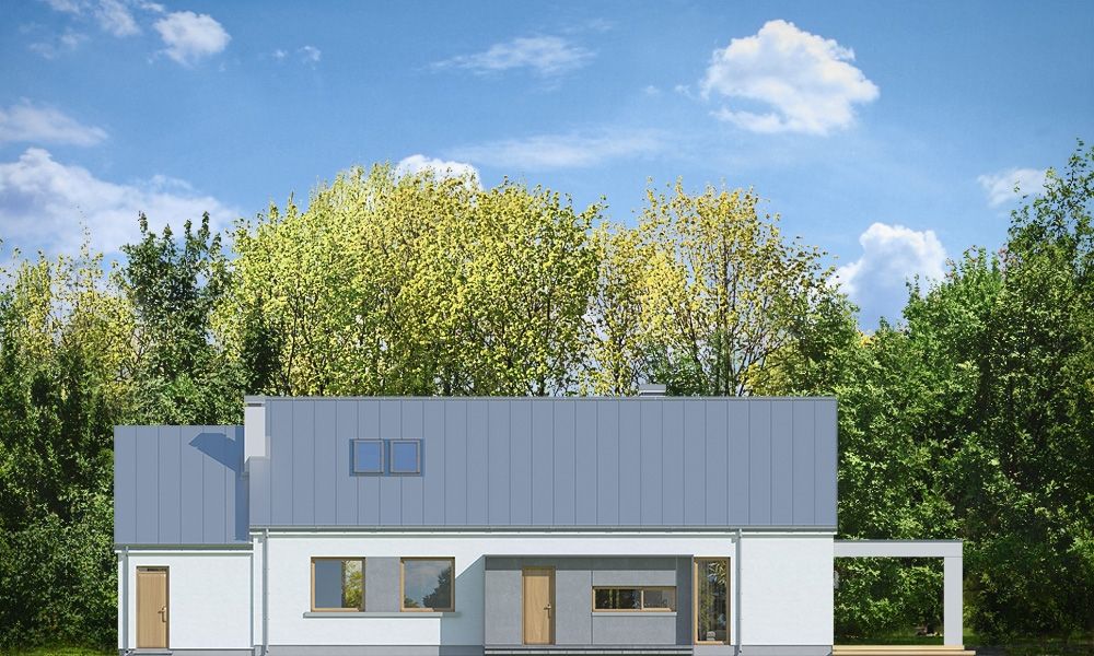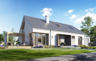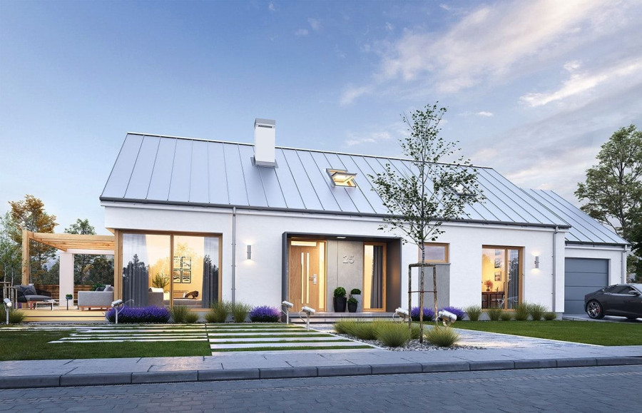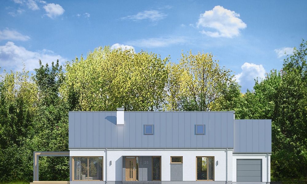 Projekt domu Wymarzony 8 to kolejny dom z serii projektów „Wymarzonych” z naszej pracowni. Budynek został zaprojektowany w modnej stylistyce „domu-stodoły”. Dom jest parterowy z poddaszem. Przykryty został dwuspadowym dachem o kącie nachylenia 35 stopni. Dach nie ma okapów, bryła jest maksymalnie prosta, nowoczesna, z dostawionymi od frontu i tyłu pudełkowymi zadaszeniami kryjącymi wejście i wykusz kuchni. W projekcie zastosowano ciekawe detale i materiały uatrakcyjniające wygląd zewnętrzny. Połączenie dachu krytego blachą na rąbek stojący, białych ścian, szarych okładzin i drewnianych ram stolarki okiennej dają świetny efekt wizualny. Dom Wymarzony 8 jest nowoczesny, prosty, a zarazem elegancki i reprezentacyjny. Głównym detalem wyróżniającym elewację frontową jest część wejściowa, z podestem, ciekawym pudełkowym zadaszeniem i drzwiami wejściowymi z naświetlami. Od strony elewacji tylnej zabieg ten powtórzono w wykuszu kuchni. Niewątpliwie najciekawszy jest szczyt domu z oknem biegnącym przez całą wysokość elewacji, które doświetla salon z pustką i antresolą, otwierając wnętrze na taras z pergolą i ogród. Dom zaprojektowano w taki sposób, aby salon miał doświetlenie z trzech stron budynku, co pozwala lokalizować go na niekorzystnej działce - z wjazdem od południa, czy z ogrodem z boku. Projektując wnętrze staraliśmy się sprostać zasadniczemu zadaniu - zmieścić wygodne cztery pokoje + salon, oraz wszystkie potrzebne pomieszczenia dodatkowe. Do domu wchodzimy wygodnym przedsionkiem wprost do części dziennej, z salonem, jadalnią i częściowo zamkniętą półwyspem kuchnią. Kuchnia połączona jest ze spiżarką, oraz pralnią z wyjściem gospodarczym na tył domu. Z drugiej strony domu mamy trzy sypialnie, w tym sypialnię rodziców z garderoba, łazienkę i dodatkowy pokój – gabinet lub extra sypialnię. Przez podwójne drzwi i dodatkowy korytarz dom łączy się z garażem i kotłownią. Nad parterem zaprojektowano poddasze, składające się z pustki nad salonem, następnie antresoli ze schodami będącej przedłużeniem salonu na dole, oraz z dodatkowej przestrzeni strychu-poddasza, którą można pozostawić jako strych (magazyn), albo zamienić na dodatkowe pokoje użytkowe - wedle życzenia właściciela. Projekt domu Wymarzony 8 to komfortowy, wygodny dom o nowoczesnej i atrakcyjnej architekturze, przeznaczony dla cztero- pięcioosobowej rodziny. Budynek jest energooszczędny, ma prostą konstrukcję, będzie łatwy w budowie i tani w utrzymaniu. Zapraszamy do zapoznania się z pełną ofertą pracowni MG Projekt tej serii: Wymarzony, Wymarzony 2, Wymarzony 3, Wymarzony 4, Wymarzony 5, Wymarzony 6, Wymarzony 7, Wymarzony 9, Wymarzony 10, Wymarzony 11.