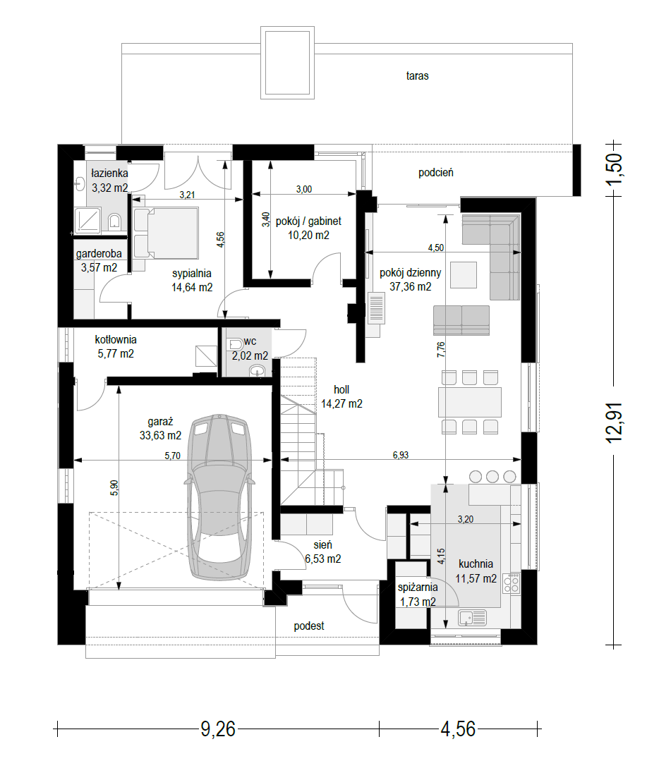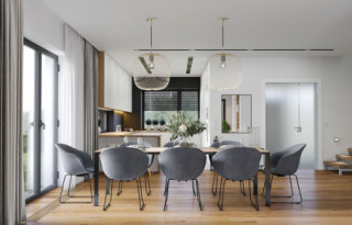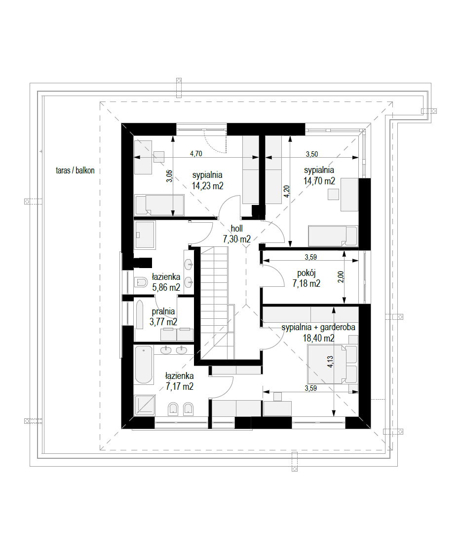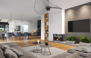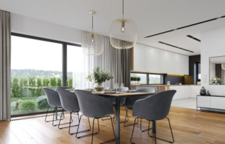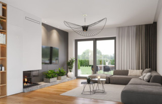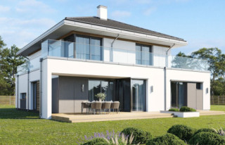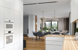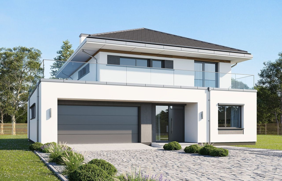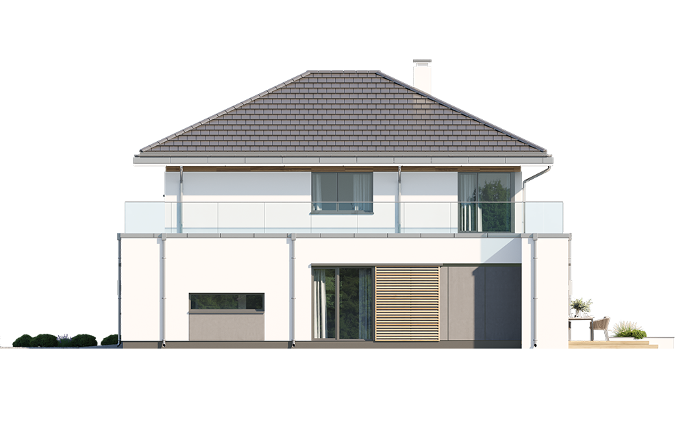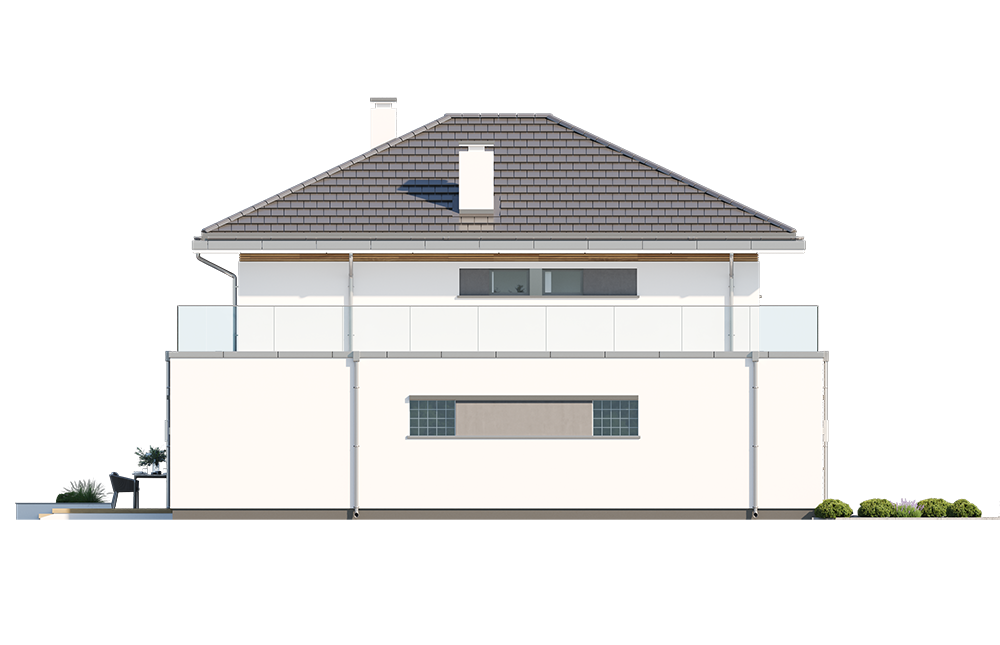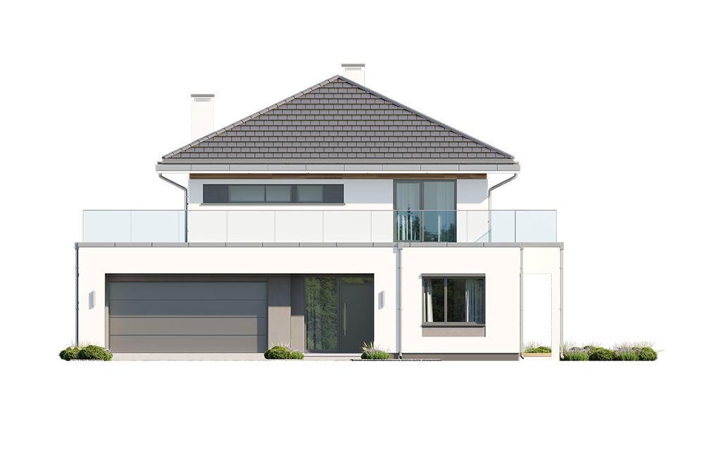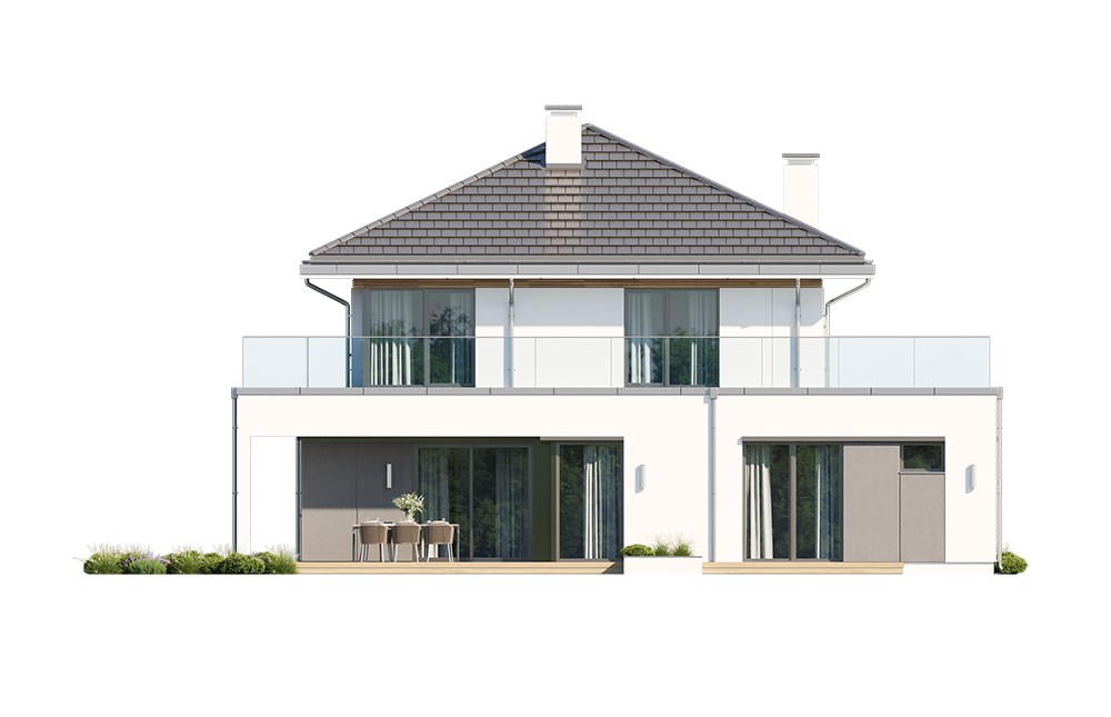 Wariant projektu ze zlikwidowaną pustką nad jadalnią i stworzonym nowym pomieszczeniem w tym miejscu. Dodane nowe okna. Zmieniony dach płaski na taras.