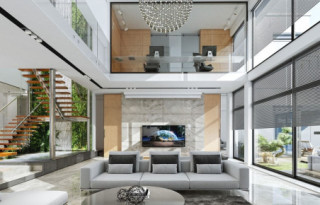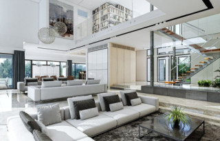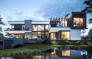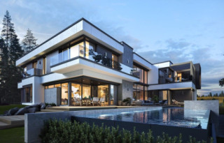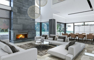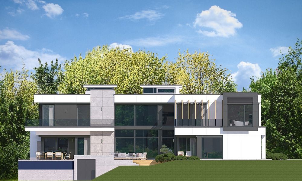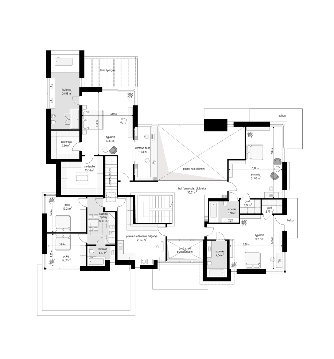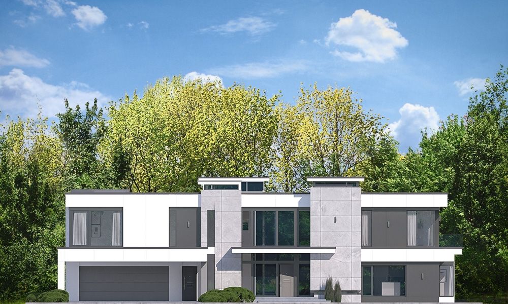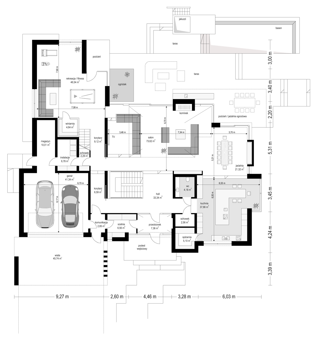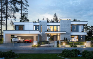 Projekt domu Rezydencja Floryda 2 to kolejny luksusowy dom z serii: Willa i Rezydencja Floryda. Zaprojektowaliśmy superkomfortową willę o nowoczesnej architekturze, z płaskimi dachami i dużymi przeszklonymi ścianami łączącymi reprezentacyjne wnętrze z ogrodem. Ideą przewodnią kształtowania bryły oraz wnętrza budynku jest przenikanie się prostopadłościennych ścian i poziomych płyt z otwarciami i przeszkleniami, tworzące grę świateł i kadrujących się widoków wnętrza i otoczenia. Dzięki takiemu założeniu budynek jest bardziej interesujący, mniej monotonny. Jednocześnie całość architektury zamknięta jest w siatce konsekwentnie powtarzających się detali, nadając całej strukturze odpowiedni rytm i porządek. Rezydencja Floryda 2, choć ma bardzo nowoczesny styl, nie jest przesadnie ekstrawagancki. Architektura budynku może z powodzeniem być dobrym tłem zarówno dla nowoczesnego wnętrza, jak i bardziej eklektycznego - przełamanego antykami czy aranżacją w stylu glamour. Spokojny i stonowany styl domu z pewnością wytrzyma próbę czasu. Do domu Rezydencja Floryda 2 wchodzimy przez przeszklony dwupiętrowy westybul do holu, nad którym piętro tworzy most – antresolę między dwiema pustkami: salonu i przedsionka, oraz frontową i ogrodową przeszkloną elewacją. Tak ukształtowane wnętrze dzieli budynek na pół dwukondygnacyjnym otwartym wnętrzem dziennym. Z prawej strony na parterze mamy dużą rodzinną kuchnię, oraz jadalnię, a na piętrze sypialnie dziecięce. Z lewej strony rezydencji mamy część gospodarczo-techniczną, oraz rekreacyjno-fitnesową, a na piętrze apartament państwa domu, oraz osobne mieszkanie z oddzielnym kameralnym dostępem - dla obsługi domu, bądź dla gości. Centralny salon willi łączy się z kilkoma innymi wnętrzami na parterze i piętrze, tworząc naprawdę ogromną, swobodną przestrzeń do codziennego życia. Mamy tutaj dwa zestawy mebli wypoczynkowych - przy kominku i przy ścianie multimedialnej. Salon łączy się z jadalnią i kuchnią, holem ozdobionym monumentalnymi schodami, opartymi o kamienno – wodną ścianę-wodospad ze zbiornikiem wody u podnóża schodów (ściana wodna i zbiornik są naturalnym klimatyzatorem wnętrza budynku). Salon łączy się również z holem piętra (będący domową biblioteką), oraz z gabinetem - przez imponującą szklaną ścianę. Salon otwiera się również na ogród i zróżnicowane wysokościowo rozbudowane tarasy, a jacuzzi i basenem. Na piętrze apartamenty rodziców i dzieci mają własne łazienki i garderoby. W sypialni master przewidziano garderoby dla niego i dla niej. Rezydencja Floryda 2 to w stu procentach luksusowy dom, spełnienie snu o prawdziwie komfortowym i wygodnym życiu. Rezydencja Floryda 2 to wizytówka właścicieli potwierdzająca ich wysoki status i dobry smak. Już zazdrościmy i podziwiamy szczęśliwców, którzy mogą sobie pozwolić na budowę tego cacka. Zapraszamy do zapoznania się z pełną ofertą pracowni MG Projekt: projekt Rezydencja Floryda, projekt Willa Floryda, projekt domu Willa Floryda 2, projekt Willa Floryda 3, projekt domu Willa Floryda 4, projekt domu Willa Floryda 5, projekt domu Willa Floryda 6, projekt domu Willa Floryda 7, projekt domu Willa Floryda 8.