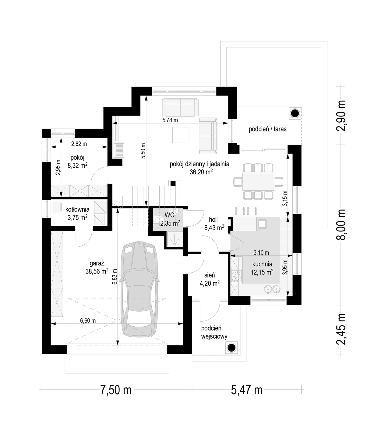Wariant domku w wersji z dodatkowym pomieszczeniem, pralnią i powiększonym garażem o 1 m. Zapraszamy do zapoznania się z pełną ofertą pracowni MG Projekt: https://www.mgprojekt.com.pl/willa-diamentowa, https://www.mgprojekt.com.pl/willa-diamentowa-wariant-b, https://www.mgprojekt.com.pl/willa-diamentowa-wariant-c, https://www.mgprojekt.com.pl/willa-diamentowa-wariant-b.