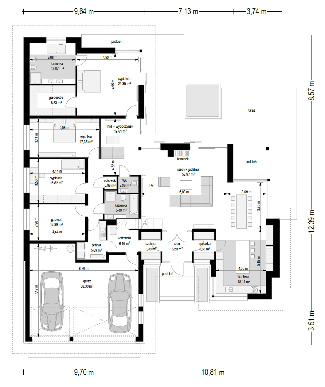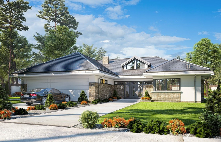 Wariant projektu z poszerzonym garażem i sypialnią rodziców.