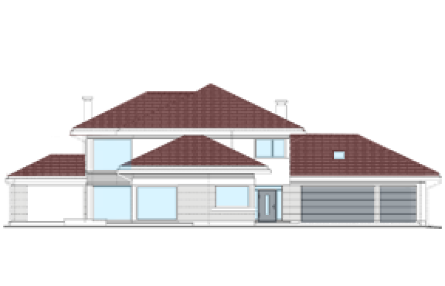 Wariant projektu z powiększonym garażem do trzech stanowisk, zmienioną lokalizacją kotłowni i komina, zmnieszoną wysokością salonu, z wyrównanym poziomem podłogi, powiększonym zadaszeniem tarasu oraz zmienionym układem pomieszczeń i okien.
