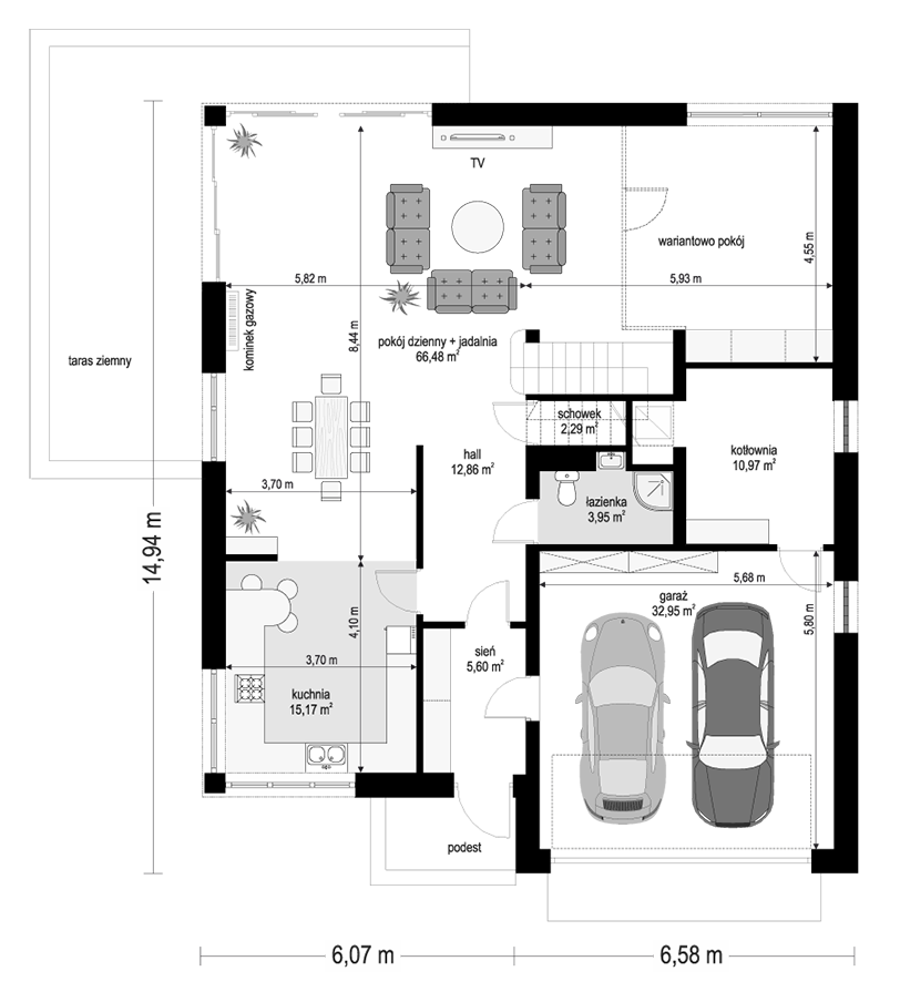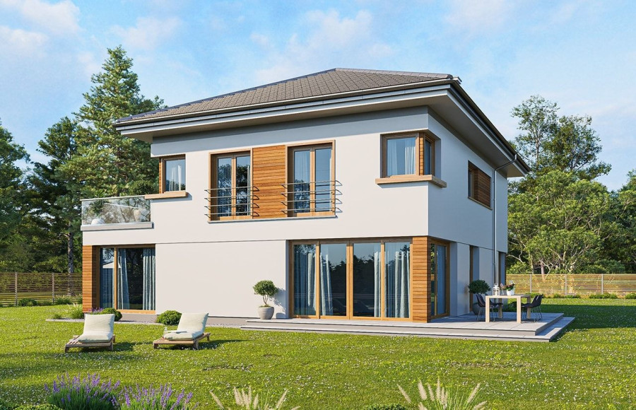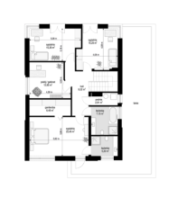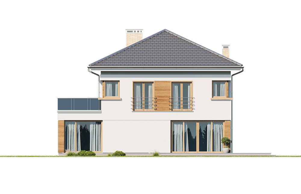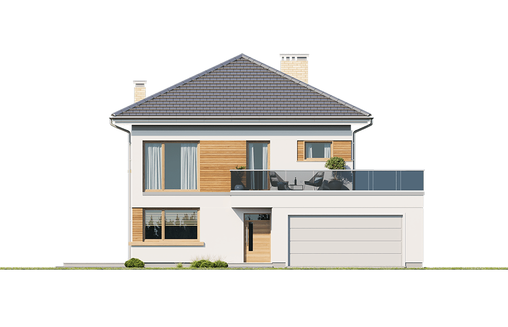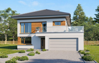 Wariant F jest przeróbką Kasjopei 3 wariant E z następującymi zmianami: likwidacja podcienia tarasowego, likwidacja gabinetu na parterze i powiększenie salonu, likwidacja skośnego dachu nad garażem na rzecz tarasu nad garażem i salonem, powiększenie sieni, likwidacja loggi na piętrze, likwidacja balkonu.