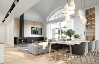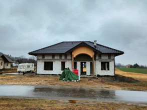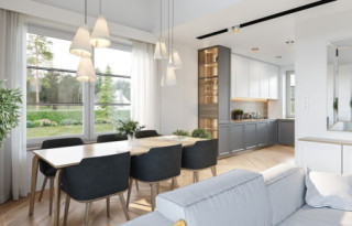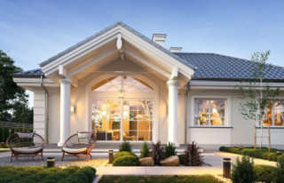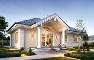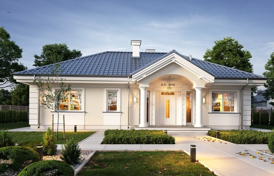 Projekt domu Willa Rodzinna 2 to projekt z serii „willi Rodzinnych”. Jest to wygodny parterowy dom dla 4- 5-osobowej rodziny, z czterema sypialniami, nawiązujący swoją architekturą i stylem do dworkowej architektury 20 wieku. Budynek został zaprojektowany na planie prostokąta, przykryty czterospadowym dachem i urozmaicony dwoma poprzecznymi zadaszeniami. Front domu ozdabia elegancji portyk wejściowy wsparty na dwóch kolumnach, z piękną owalną kolebką i reprezentacyjnymi drzwiami frontowymi z bocznymi naświetlami. Od strony ogrodu elewacja tylna urozmaicona jest zadaszeniem tarasu na kolumnach, z ciekawym belkowaniem, stanowiące oprawę dla pięknego wysokiego przeszklenia salonu z łukowym naświetlem wpuszczającym światło do salonu z otwartym wysokim sufitem. Proporcje bryły, zastosowane materiały i detale tworzą elegancką wysokiej jakości architekturę i stanowią doskonałą oprawę dla komfortu życia w parterowym domu - blisko ogrodu. Oryginalna architektura wyróżnia ten „Willę Rodzinną 2” spośród innych porterówek o podobnej wielkości i funkcjonalności. Na gościach z pewnością duże wrażenie zrobi zarówno reprezentacyjne wejście, jak i pustka nad salonem i ogromne przeszklenia otwierające wnętrze pokoju dziennego na ogród. Wnętrze budynku podzielono na część dzienną - z salonem, holem i kuchnią, oraz część nocną. W domu przewidziano aż cztery pokoje sypialne – rzadkość w tego rodzaju projektach. Można oczywiście podzielić je inaczej - na przykład na 3 pokoje, lub jeden z nich przeznaczyć na domowe biuro. Kotłownia dostępna z przedsionka może być zasilana kotłem gazowym lub pompą ciepła, ale też i kotłem na paliwo stałe – stosownie do wyboru Inwestora. Blisko 40-metrowa przestrzeń dzienna z kuchnią, kącikiem jadalnym i wypoczynkowym ze ścianą telewizyjno-kominkową stanowi centrum domu. Otwarty sufit nad salonem dodaje wrażenie przestrzeni wnętrza i uatrakcyjnia je. „Willa Rodzinna 2” to doskonała propozycja dla osób planujących budowę wygodnego i funkcjonalnego parterowego domu, energooszczędnego i niedrogiego w późniejszej eksploatacji. Jednocześnie domu będącego spełnieniem marzenia o własnym małym dworku, które tak wielu z nas skrywa głęboko w sercu. Zapraszamy - spełnijcie swoje marzenie!