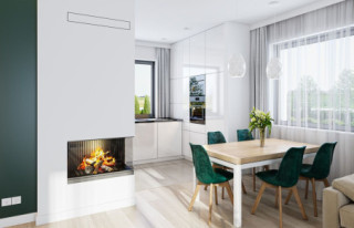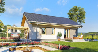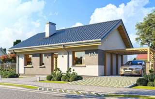 Projekt domu Kasia 2 to projekt prostego bezpretensjonalnego domu – energooszczędnego, niedrogiego w budowie i późniejszym utrzymaniu - w sam raz dla 3-osobowej rodziny, która chce żyć wygodnie i komfortowo, ale nie chce zadłużać się na całe życie inwestując w drogi dom. Seria domków „Kasia” to doskonała propozycja dla pragmatycznie myślących osób, planujących budowę łatwą, szybką i nieskomplikowaną. Budynek zaprojektowano jako parterowy, założony na planie prostokąta o wymiarach 11x8 m, przykryty dwuspadowym dachem. Zasadniczą podstawową bryłę domu można - w zależności od wybranej wersji wariantowej „Kasi” - wzbogacić o : wiatę garażową, garaż, zadaszenie nad tarasem ogrodowym, czy też strych nad parterem o funkcji magazynu, lub poddasza do zagospodarowania w razie potrzeby. Dom ma prostą i nowoczesną architekturę, a zarazem przytulny i sympatyczny wygląd - aż ma się ochotę w nim zamieszkać. Do wnętrza prowadzą nas drzwi wejściowe z naświetlem, do przedsionka z szafami. Stąd przechodzimy do przedpokoju, a dalej do salonu z kuchnią, oraz sypialni, łazienki i wc. Z przedsionka jest też dostęp do kotłowni, w której można umieścić zarówno kocioł c.o. na gaz, jak i pompę ciepła powietrze –woda, albo niewielki kocioł na paliwo stałe - w zależności od wyboru systemu ogrzewania. W salonie mamy wolną ścianę telewizyjną i kominek narożny na osobnej ścianie - obok kotłowni dzięki czemu w domu jest tylko jeden zespół kominowy. W domu zaprojektowano osobno łazienkę i wc - wygodne rzadko spotykane rozwiązanie w niewielkich domach. W łazience mamy dużo miejsca na prysznic, oraz pralkę i suszarkę. W budynku przewidziano wentylację mechaniczną z rekuperacją w standardzie. Można rozważyć dokupienie instalacji paneli fotowoltaicznych - kształt dachu na to pozwala. Konstrukcja „Kasi” jest bardzo prosta - prościej się nie da : mamy tutaj tylko ściany zewnętrzne jako konstrukcyjne, a nad ścianami wiązary dachowe, stanowiące konstrukcję stropu i dachu. Posiadamy wersję wariantową z otwartym sufitem nad salonem aż do dachu, dzięki czemu wnętrze salonu powiększa się. „Kasia” to projekt energooszczędny, z bardzo dobrymi ociepleniami przegród, z nowoczesnymi instalacjami, tani w budowie i późniejszym utrzymaniu. Zapraszamy do zapoznania się także z projektami domków: Kasia, Kasia 3, Kasia 4, Kasia 5, Kasia 6, Kasia 7!