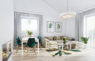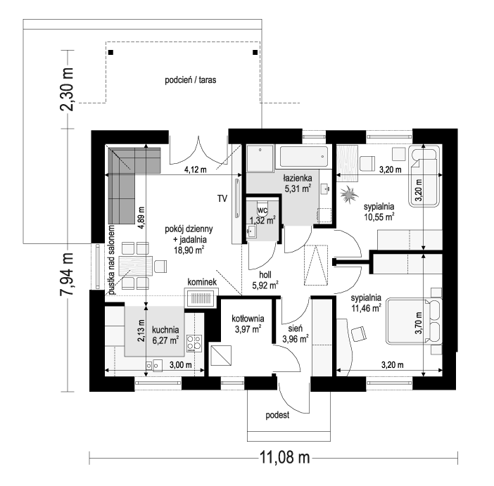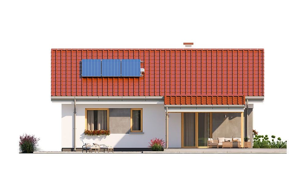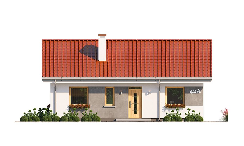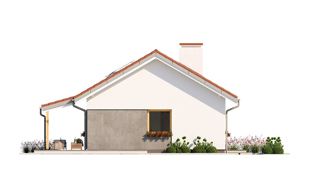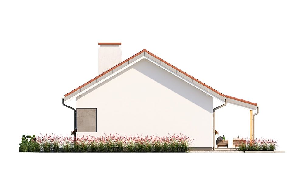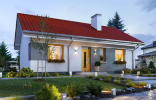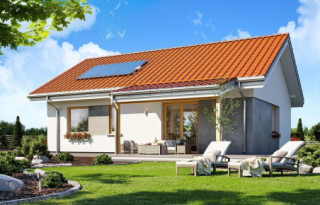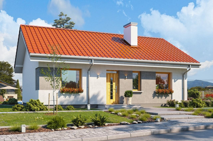 Projekt domu Kasia 3 to projekt prostego bezpretensjonalnego domu – energooszczędnego, niedrogiego w budowie i późniejszym utrzymaniu - w sam raz dla 3-osobowej rodziny, która chce żyć wygodnie i komfortowo, ale nie chce zadłużać się na całe życie inwestując w drogi dom. Seria domków „Kasia” to doskonała propozycja dla pragmatycznie myślących osób, planujących budowę łatwą, szybką i nieskomplikowaną. Budynek zaprojektowano jako parterowy, założony na planie prostokąta o wymiarach 11x8 m, przykryty dwuspadowym dachem. Zasadniczą podstawową bryłę domu można - w zależności od wybranej wersji wariantowej „Kasi” - wzbogacić o : wiatę garażową, garaż, zadaszenie nad tarasem ogrodowym, czy też strych nad parterem o funkcji magazynu, lub poddasza do zagospodarowania w razie potrzeby. Dom ma prostą i nowoczesną architekturę, a zarazem przytulny i sympatyczny wygląd - aż ma się ochotę w nim zamieszkać. Do wnętrza prowadzą nas drzwi wejściowe z naświetlem, do przedsionka z szafami. Stąd przechodzimy do przedpokoju, a dalej do salonu z kuchnią, oraz sypialni, łazienki i wc. Z przedsionka jest też dostęp do kotłowni, w której można umieścić zarówno kocioł c.o. na gaz, jak i pompę ciepła powietrze –woda, albo niewielki kocioł na paliwo stałe - w zależności od wyboru systemu ogrzewania. W salonie mamy wolną ścianę telewizyjną i kominek narożny na osobnej ścianie - obok kotłowni dzięki czemu w domu jest tylko jeden zespół kominowy. W domu zaprojektowano osobno łazienkę i wc - wygodne rzadko spotykane rozwiązanie w niewielkich domach. W łazience mamy dużo miejsca na prysznic, oraz pralkę i suszarkę. W budynku przewidziano wentylację mechaniczną z rekuperacją w standardzie. Można rozważyć dokupienie instalacji paneli fotowoltaicznych - kształt dachu na to pozwala. Konstrukcja „Kasi” jest bardzo prosta - prościej się nie da: mamy tutaj tylko ściany zewnętrzne jako konstrukcyjne, a nad ścianami wiązary dachowe, stanowiące konstrukcję stropu i dachu. Posiadamy wersję wariantową z otwartym sufitem nad salonem aż do dachu, dzięki czemu wnętrze salonu powiększa się. „Kasia” to projekt energooszczędny, z bardzo dobrymi ociepleniami przegród, z nowoczesnymi instalacjami, tani w budowie i późniejszym utrzymaniu. Zapraszamy do zapoznania się także z projektami domków: Kasia, Kasia 2, Kasia 4, Kasia 5, Kasia 6, Kasia 7 !