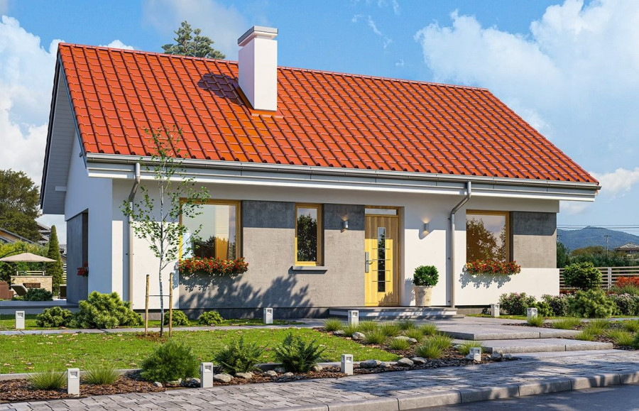 Projekt domu Kasia 5 to projekt prostego bezpretensjonalnego domu – energooszczędnego, niedrogiego w budowie i późniejszym utrzymaniu - w sam raz dla 4-5 osobowej rodziny, która chce żyć wygodnie i komfortowo, ale nie chce zadłużać się na całe życie inwestując w drogi dom. Seria domków „ Kasia ” to doskonała propozycja dla pragmatycznie myślących osób, planujących budowę łatwą, szybką i nieskomplikowaną. Budynek zaprojektowano jako parterowy, założony na planie prostokąta o wymiarach 11x8 m, przykryty dwuspadowym dachem. Zasadniczą podstawową bryłę domu można - w zależności od wybranej wersji wariantowej „Kasi” - wzbogacić o: wiatę garażową, garaż, zadaszenie nad tarasem ogrodowym, czy też strych nad parterem o funkcji magazynu, lub poddasza do zagospodarowania w razie potrzeby. Dom ma prostą i nowoczesną architekturę, a zarazem przytulny i sympatyczny wygląd - aż ma się ochotę w nim zamieszkać. Do wnętrza prowadzą nas drzwi wejściowe z naświetlem, do przedsionka z szafami. Stąd przechodzimy do przedpokoju, a dalej do salonu z kuchnią, oraz sypialni, łazienki i wc. Z przedsionka jest też dostęp do kotłowni, w której można umieścić zarówno kocioł c.o. na gaz, jak i pompę ciepła powietrze –woda, albo niewielki kocioł na paliwo stałe - w zależności od wyboru systemu ogrzewania. W salonie mamy wolną ścianę telewizyjną i kominek narożny na osobnej ścianie - obok kotłowni dzięki czemu w domu jest tylko jeden zespół kominowy. W domu zaprojektowano osobno łazienkę i wc - wygodne rzadko spotykane rozwiązanie w niewielkich domach. W łazience mamy dużo miejsca na prysznic, oraz pralkę i suszarkę. W budynku przewidziano wentylację mechaniczną z rekuperacją w standardzie. Można rozważyć dokupienie instalacji paneli fotowoltaicznych - kształt dachu na to pozwala. Konstrukcja „Kasi” jest bardzo prosta - prościej się nie da: mamy tutaj tylko ściany zewnętrzne jako konstrukcyjne, a nad ścianami wiązary dachowe, stanowiące konstrukcję stropu i dachu. Posiadamy wersję wariantową z otwartym sufitem nad salonem aż do dachu, dzięki czemu wnętrze salonu powiększa się. „Kasia” to projekt energooszczędny, z bardzo dobrymi ociepleniami przegród, z nowoczesnymi instalacjami, tani w budowie i późniejszym utrzymaniu. Zapraszamy do zapoznania się także z projektami domków: Kasia, Kasia 2, Kasia 3, Kasia 4, Kasia 6, Kasia 7 !