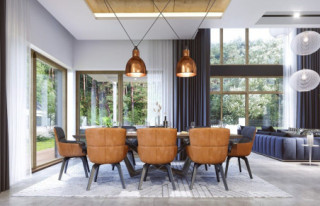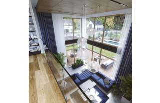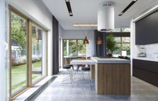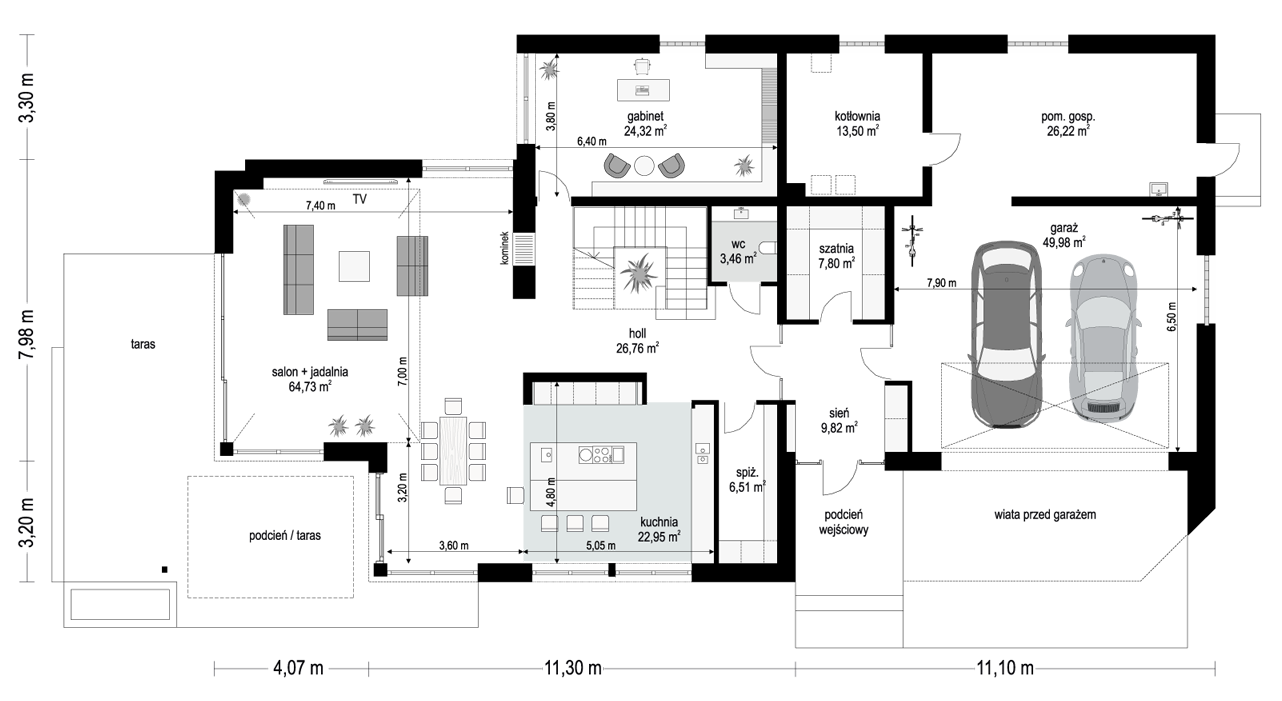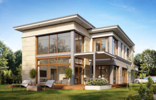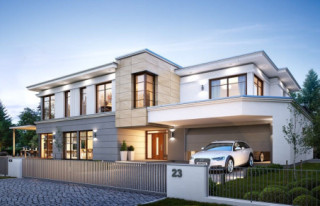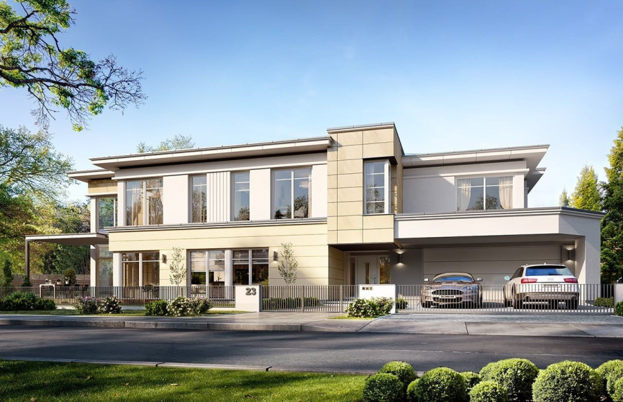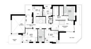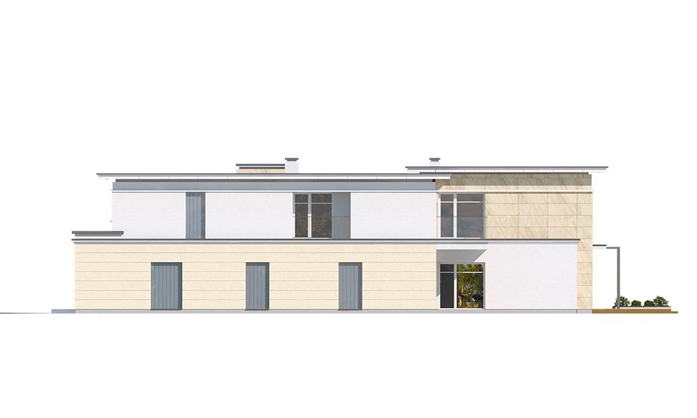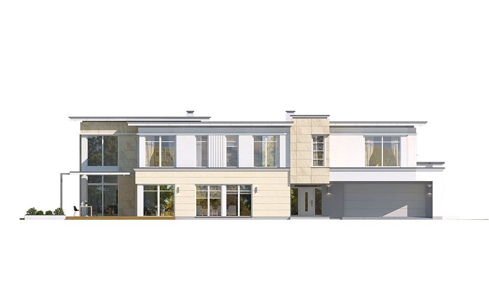 Projekt domu Willa Moderna 2 to elegancka miejska willa dedykowana na płytką działkę z ogrodem z boku domu, z niekorzystnym ustawieniem parceli względem słońca – z wjazdem do budynku od strony południowej lub wschodniej (w przypadku odbicia lustrzanego projektu - zachodniej). Architektura domu Willa Moderna Projekt Willa Moderna 2 to dwukondygnacyjny jednopiętrowy dom przykryty płaskim dachem, składający się z kilku przenikających się wzajemnie brył części głównej domu i dobudowanych po bokach części garażowej i dwukondygnacyjnego salonu. W osi wejścia do domu zaprojektowano pionową dominantę w postaci podwieszonego wykusza, akcentującą drzwi wejściowe. Architektura budynku Willa Moderna 2 utrzymana jest w modernistycznym stylu przywołującym wspomnienie miejskich rezydencji z lat 30. dwudziestego wieku. W projekcie domu Willa Moderna 2 zastosowano ciekawe detale i wykorzystano nowoczesne dobrej jakości materiały wykończeniowe. Elewacje Willi Moderna 2 podzielono na poziome pasy przeplecione rytmicznym układem dużych okien. Dodatkowym akcentem fasady budynku są gzymsy pod oknami piętra, oraz gzymsy okapowe dachu. Całość sylwetki domu Willa Moderna 2 jest spójna, lekka i elegancka. Wejście Willi Moderna 2 zaakcentowano wiszącym nad drzwiami pionowym wykuszem wykończonym płytami z piaskowca. Od strony elewacji bocznej - ogrodowej projektu Willa Moderna 2 zaprojektowano prostopadłościenną bryłę dwukondygnacyjnego salonu, z dużym narożnym przeszkleniem otwierającym salon na ogród i taras. Elementy domu takie jak: wiata przed garażem połączona z podcieniem wejściowym, taras z sypialni master nad częścią garażową, czy oryginalne zadaszenie nad tarasem ogrodowym, dodatkowo urozmaicają architekturę zewnętrzną Willi Moderna 2. Willa Moderna 2 wnętrze Wnętrze rezydencji Willa Moderna 2 zaprojektowano z podziałem jednoprzestrzenną część dzienną na parterze i sypialnie na piętrze. Do Willi Moderna 2 wchodzimy przez okazałe drzwi z szerokimi bocznymi naświetlami do bardzo obszernego 10-metrowego przedsionka. Obok do dyspozycji domowników jest duża szatnia i przejście do części garażowo-gospodarczej. Z przedsionka projektu Willa Moderna 2 szerokim przejściem przechodzimy do holu domostwa, w którym centralne miejsce zajmują komfortowe, efektowne schody z szeroką pustką w środku zabiegu schodów. Z holu projektu Willa Moderna 2 przenosimy się do jeszcze ciekawszego wnętrza salonu, którego duży fragment ma wysokość dwóch kondygnacji i piękne przeszklenie otwierające wnętrze na otaczający dom Willa Moderna 2 ogród. W projekcie domu Willa Moderna 2 od frontu zaprojektowano wygodną kuchnię z wyspą, ładną spiżarnię, oraz jadalnię. W pokoju dziennym znajdziemy ścianę rozrywkowo – telewizyjną, w której bez problemu zainstalujemy dowolnej wielkości telewizor lub ekran. Od strony holu wkomponowano we wnętrze budynku minimalistyczny trójstronny kominek, widoczny z wielu miejsc domu. Za schodami projektu Willa Moderna 2 przewidziano dodatkowy przestronny gabinet - biuro domowe. Na piętrze budynku Willa Moderna 2 zaprojektowano pokoje sypialne z łazienkami, oraz oddzieloną akustycznie antresolę – bibliotekę nad pustką salonu, stanowiąca jego przedłużenie i dopełnienie. Od frontu mamy dwie duże sypialnie dziecięce z łazienką, za schodami zaprojektowano sypialnię gościnną z własną łazienką, oraz pralnię-suszarnię z własnym balkonem -na tyle dużą aby pełnić też rolę pomieszczenia gospodarczo-pomocniczego. Nad częścią garażową projektu Willa Moderna 2 mieści się oddzielny luksusowy apartament Państwa domu, z dużą sypialnią, podwójną garderobą - Pana i Pani domu, oraz piękną łazienką. Apartament łączy się z dużym tarasem na dachu. Projekt domu Willa Moderna 2 to propozycja dla Klientów, dysponujących środkami, gustem i wizją posiadania prawdziwej miejskiej willi. Projekt Willa Moderna 2 jest budynkiem dla osób planujących budowę dużego, wygodnego domu, mających już doświadczenia z mniejszymi wnętrzami i stawiających tym razem, przy kolejnej budowie na prawdziwy komfort i wygodę, gotowych zainwestować w komfortową oprawę swojego domostwa do codziennego życia. W projekcie Willa Moderna 2 zastosowano nowoczesne rozwiązania materiałowe i technologicznie, czyniące budynek energooszczędnym i łatwym w przyszłej eksploatacji. Projekt Willa Moderna 2 można zamówić również w wersji odbicia lustrzanego z garażem po lewej stronie. Zapraszamy także do zapoznania się z projektem Willa Moderna 1.
