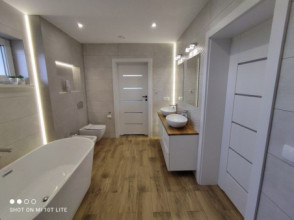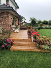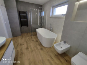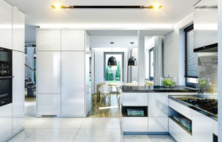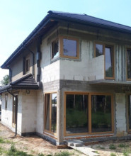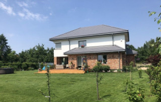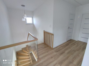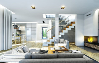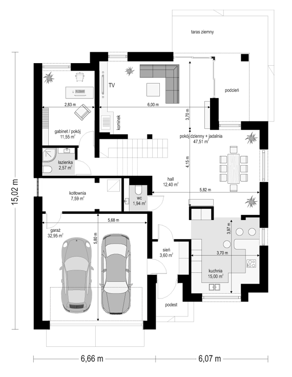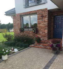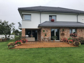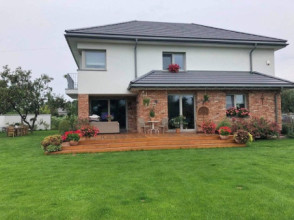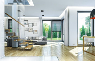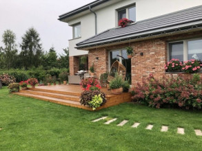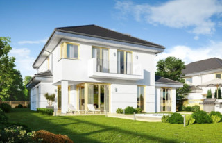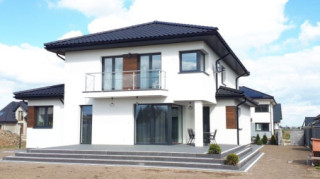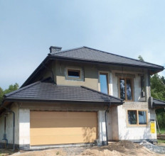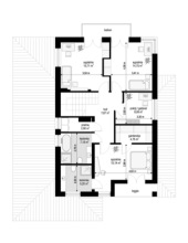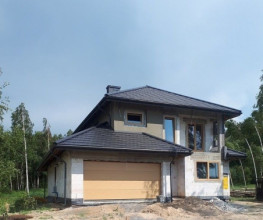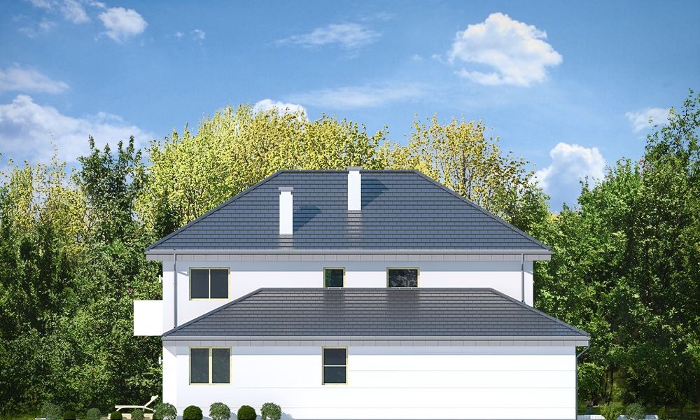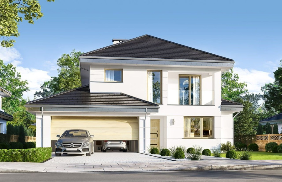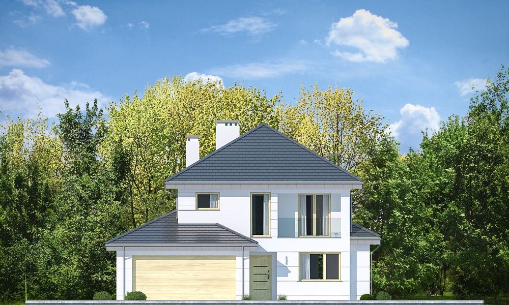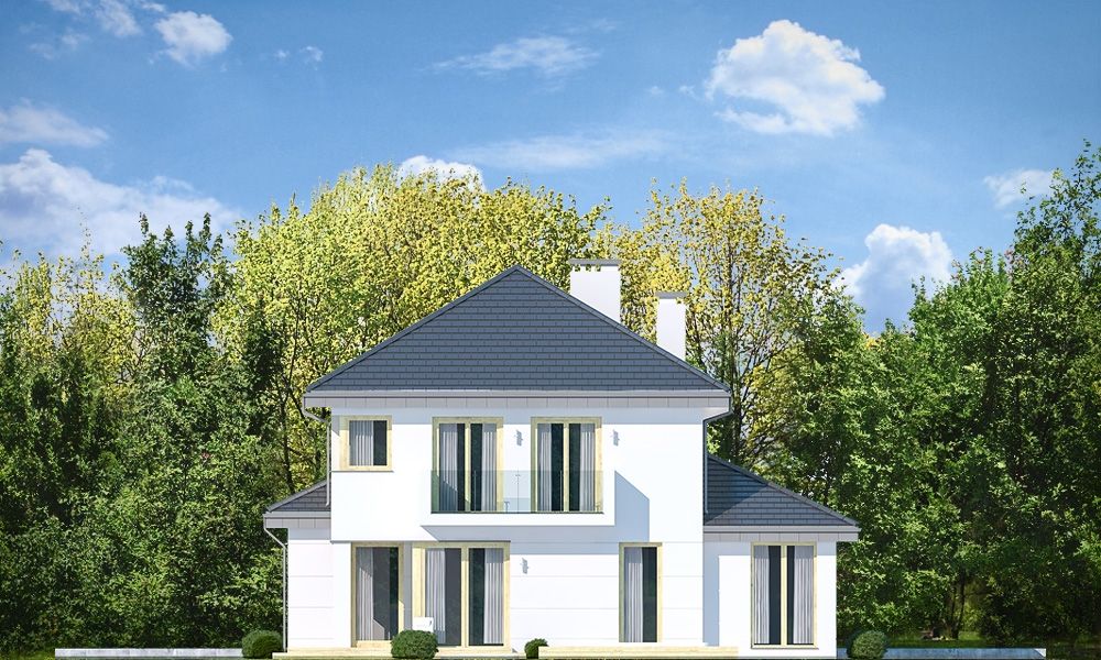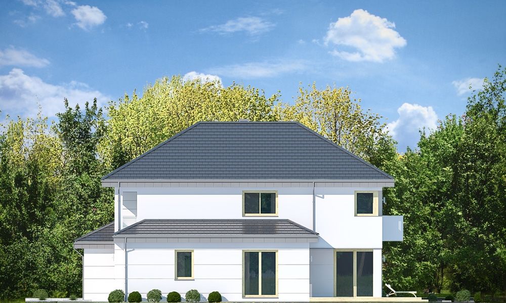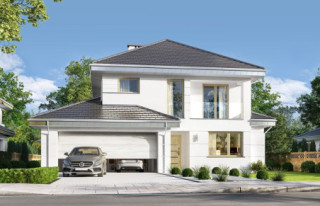 Projekt domu Kasjopea 7 B jest wersją wariantową popularnego projektu Kasjopea 7 z wyższym kątem nachylenia dachu, co może być ułatwieniem dla Inwestorów, na których działkach warunki urbanistyczne nakazują budowę domu z wyższym dachem. Projekt domu Kasjopea 7 B jest energooszczędny, zastosowano w nim najnowsze materiały i instalacje. Budynek ma dość prostą konstrukcję - będzie łatwy i szybki w budowie. Dzięki zwartej bryle i dobrym izolacjom będzie też tani w późniejszej eksploatacji. Jego prostokątna piętrowa bryła przykryta jest czterospadowym dachem. Do głównej bryły dobudowana jest parterowa część nad garażem i dodatkowym pokojem przekryta trzyspadowym dachem. Elewacje domu podzielono na poziome pasy. Ściany parteru są boniowane - ściany piętra tynkowane na gładko. Duże przeszklenia, loggia, podcienie, balkon - stanowią elementy ozdobne urozmaicające zewnętrzną sylwetkę budynku. Zastosowane nowoczesne materiały w stonowanych kolorach tworzą elegancki, powściągliwy efekt. Dom, jako podmiejska willa, doskonale wpasuje się w otoczenie innych zabudowań. Wnętrze budynku podzielono na następujące części: przestrzeń dzienną i gospodarczo garażową na parterze, oraz sypialnie na piętrze. Do domu wchodzimy przez przedsionek połączony z garażem i przechodzimy na wprost do połączonej otwartej powierzchni holu, salonu z jadalnią i kuchni. Salon i jadalnia otwierają się dużymi przeszkleniami na częściowo zadaszony taras, oraz ogród. Wygodna kuchnia z kącikiem na szybkie posiłki jest częściowo wizualne oddzielona od reszty wnętrza. Reprezentacyjne schody stanowią ozdobę wnętrza domu. Za schodami niewielkim korytarzem przechodzimy do dodatkowego pokoju (gabinet, lub sypialnia gościnna) i łazienki. Z kolei z dwustanowiskowego garażu przechodzimy do kotłowni. Na piętrze do dyspozycji mamy cztery pokoje, w tym: apartament rodziców, z własną łazienką, garderobą i tarasem, oraz trzy sypialnie dzieci (jedna mniejsza) z łazienką i pralnią dostępną z holu. Nad piętrem mamy jeszcze do dyspozycji spory strych - dodatkową przestrzeń magazynową domu. Projekt dostępny jest w odbiciu lustrzanym oraz kilku wersjach. Zachęcamy też do sprawdzenia innych projektów tej serii: projekt domu Kasjopea) i jej wersja odświeżona (projekt domu Kasjopea 8), bliźniak (projekt domu Kasjopea 2), ze zmienionym układem pomieszczeń (projekt domu Kasjopea 3), pomniejszona (projekt domu Kasjopea 4), komfortowa (projekt domu Kasjopea 5), największa (projekt domu Kasjopea 6) i z nowocześniejszą architekturą (projekt domu Kasjopea 7).