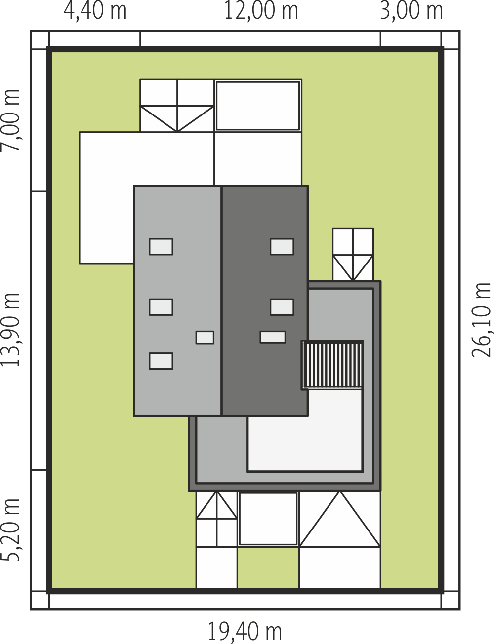 Dom o nowoczesnej architekturze i prostej konstrukcji, przeznaczony na wąską działkę, z wbudowanym garażem, dla rodziny 3-5 osobowej.