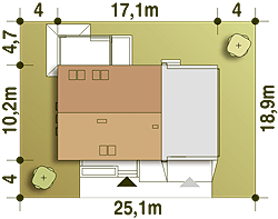 Projekt domu szeregowego stworzony z myślą o maksymalnym dopasowaniu arażnacji wnętrza dla potrzeb mieszkańców. Parter występuje w trzech wariantach: wbudowany garaż, zamiast garażu – powiększona kuchnia i jadalnią lub z dodatkową sypialnią lub gabinetem.