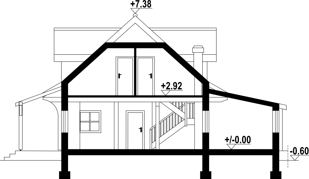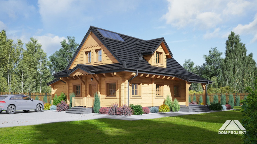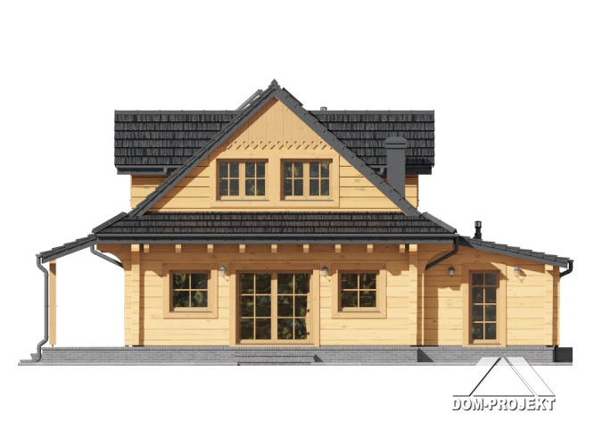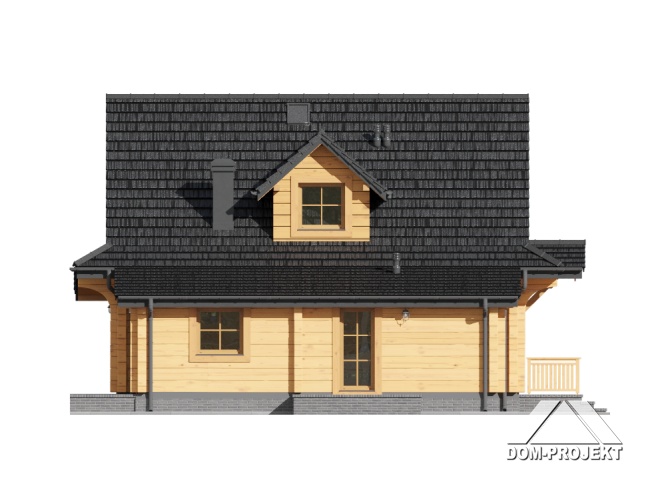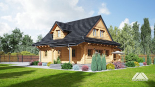 Dom z bali. Duży salon z kominkiem, wyjściem na taras i przejściem do kuchni. Pokój, łazienka, wiatrołap, komunikacja, pomieszczenie gospodarcze. Z łazienki przejście do pomieszczenia rekreacyjnego z sauną. Na poddaszu trzy pokoje, łazienka, komunikacja. Zwarta bryła budynku i dach dwuspadowy sprzyjają szybkiej i taniej budowie i niskim kosztom eksploatacji.