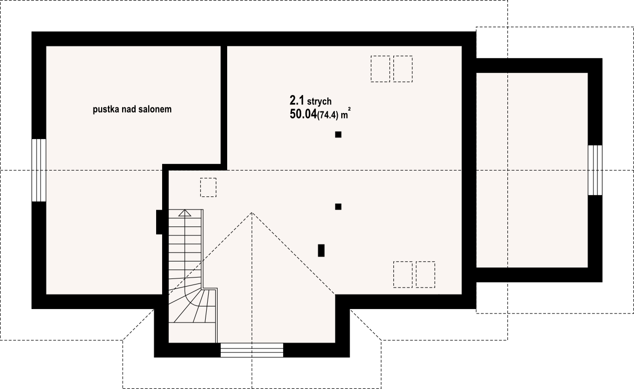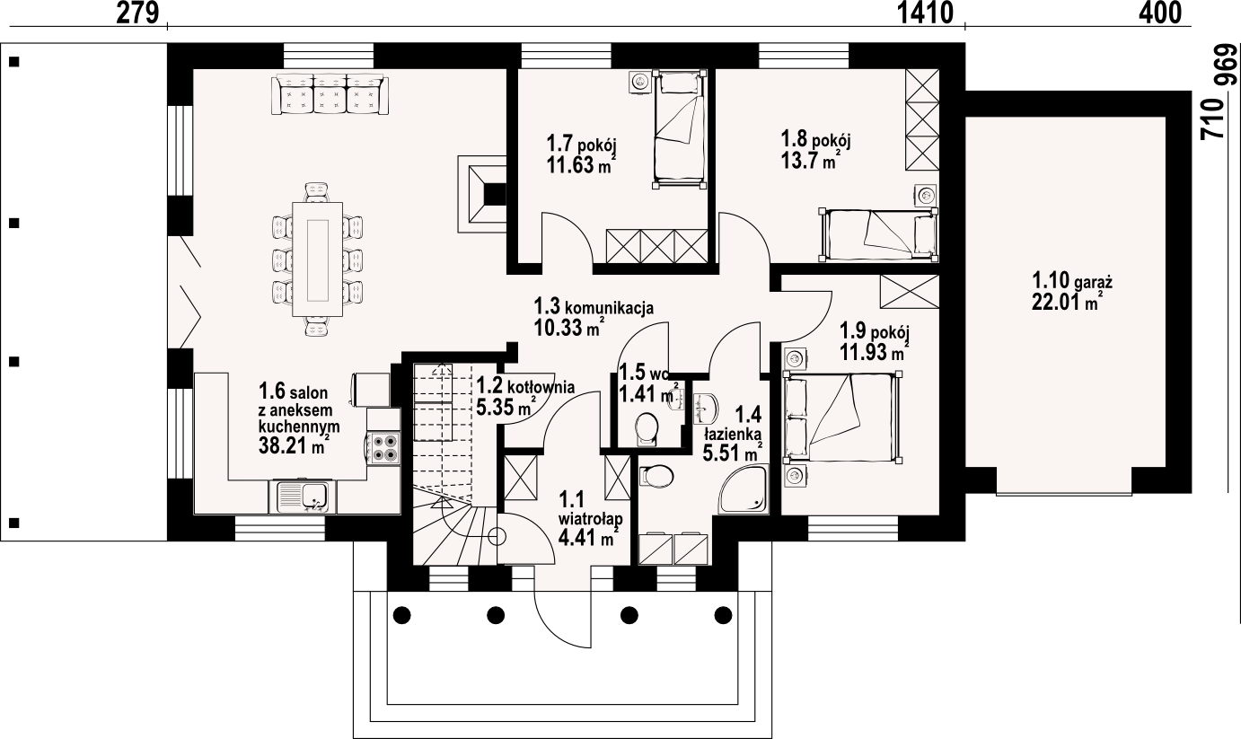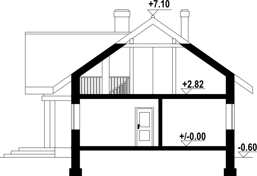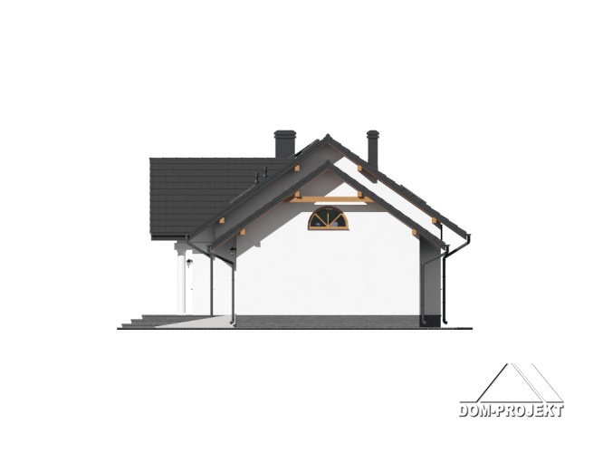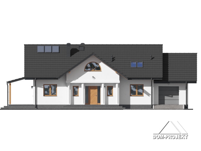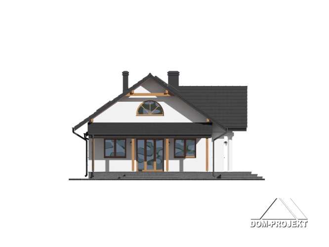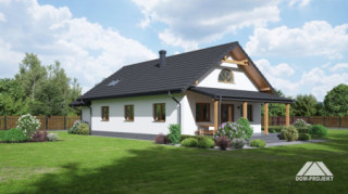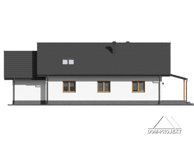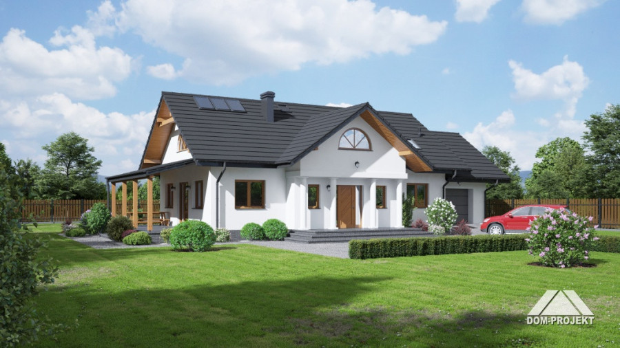 Dom parterowy. Duży salon z aneksem kuchennym, kominkiem i wyjściami na zadaszony taras. Trzy pokoje, łazienka, wc, kotłownia, komunikacja, wiatrołap i garaż. Nad salonem otwarta przestrzeń. Wyjście na poddasze schodami. Na poddaszu strych.