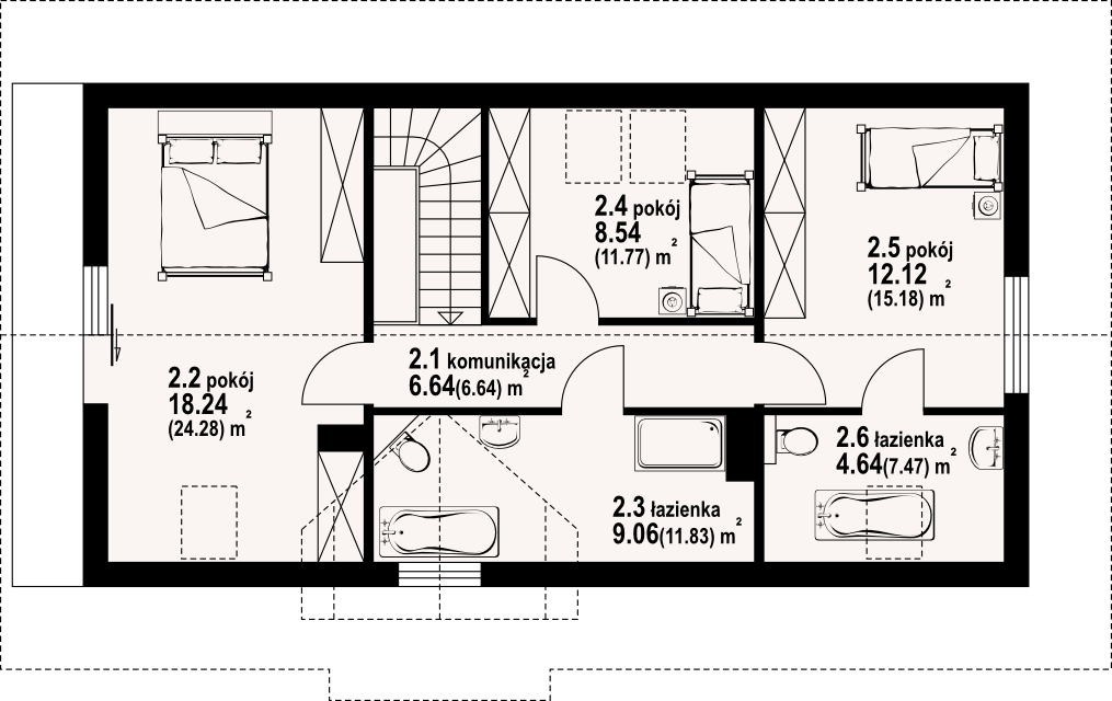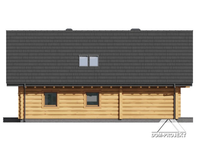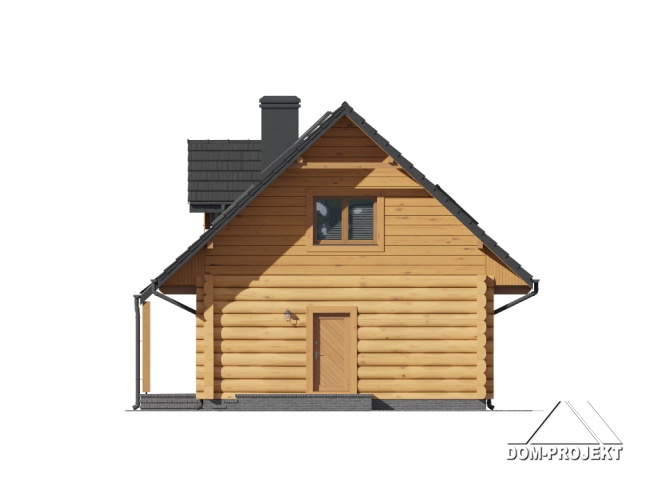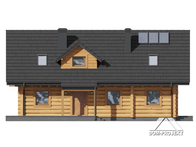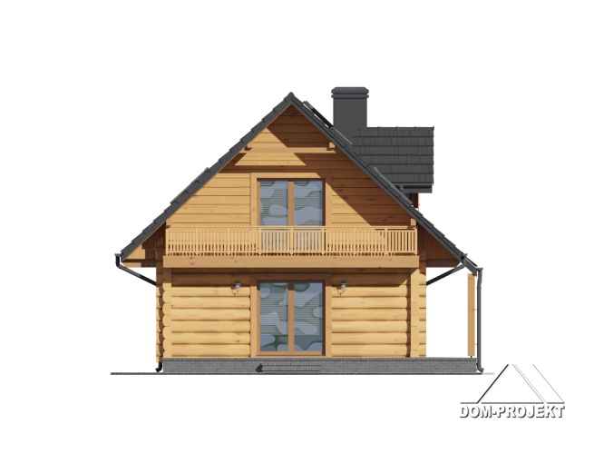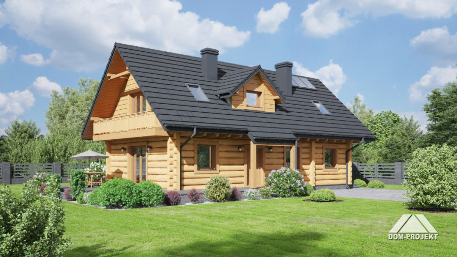 Dom z bali drewnianych. Duży salon z aneksem kuchennym, kominkiem, wyjściem na taras i schodami na poddasze. Dwa pokoje, dwie łazienki, dwa wiatrołapy. Na poddaszu trzy pokoje, dwie łazienki, balkon i komunikacja. Zwarta bryła budynku i dach dwuspadowy sprzyjają szybkiej i taniej budowie i niskim kosztom eksploatacji.
