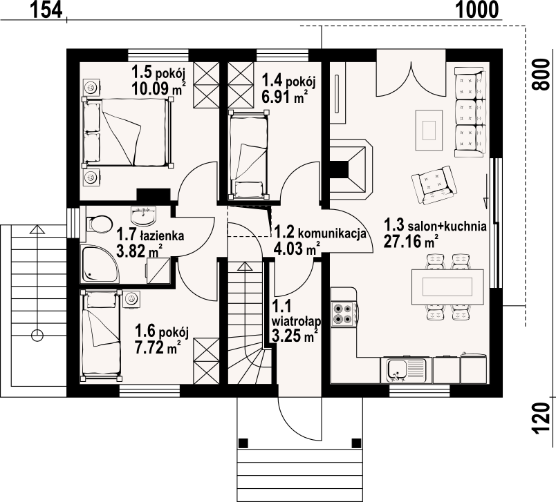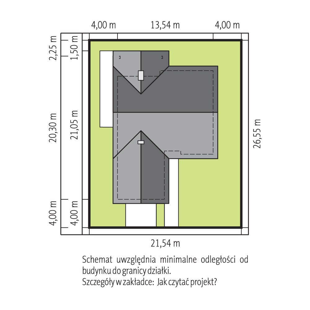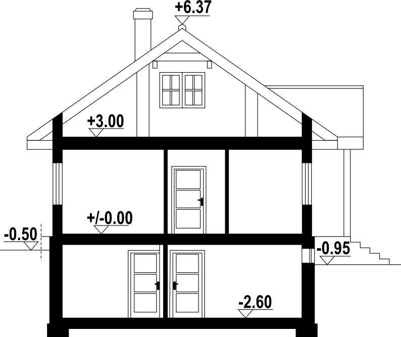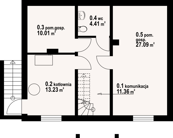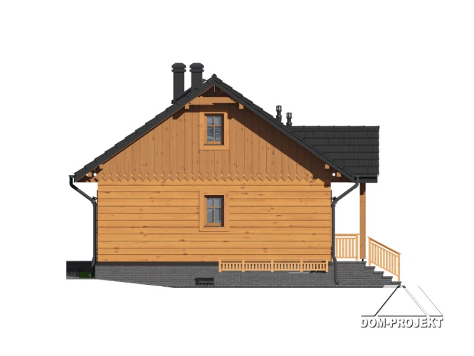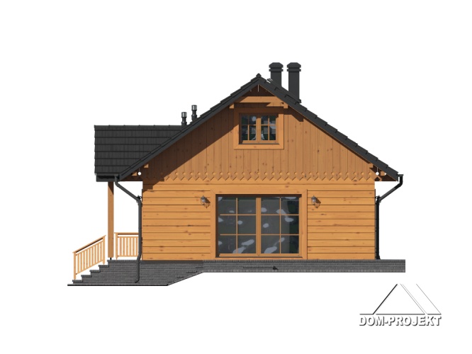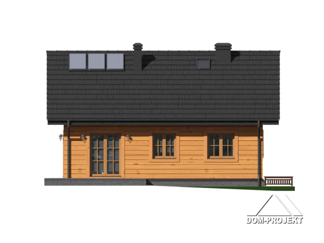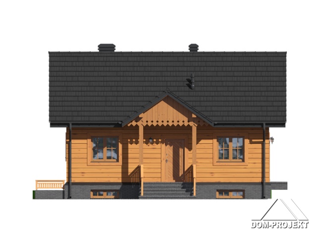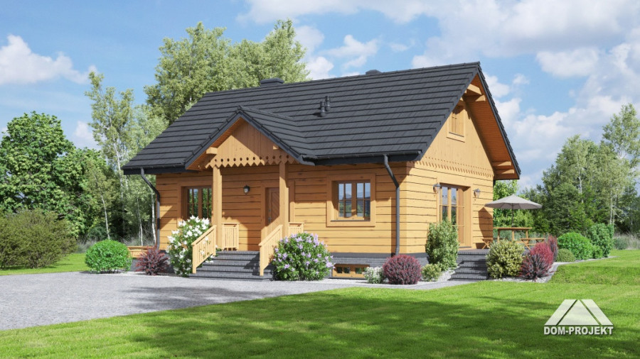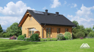 Dom parterowy w konstrukcji szkieletu drewnianego. Podpiwniczony. Na parterze duży salon z aneksem kuchennym, kominkiem i wyjściem na taras. Trzy pokoje, łazienka, wiatrołap i komunikacja. Wyjście na nieużytkowe poddasze schodami strychowymi rozkładanymi. W piwnicach: kotłownia, wc, dwa pomieszczenia gospodarcze i schody na poddasze.