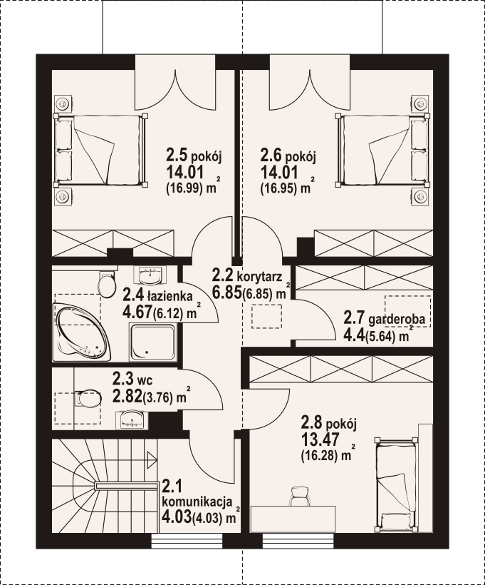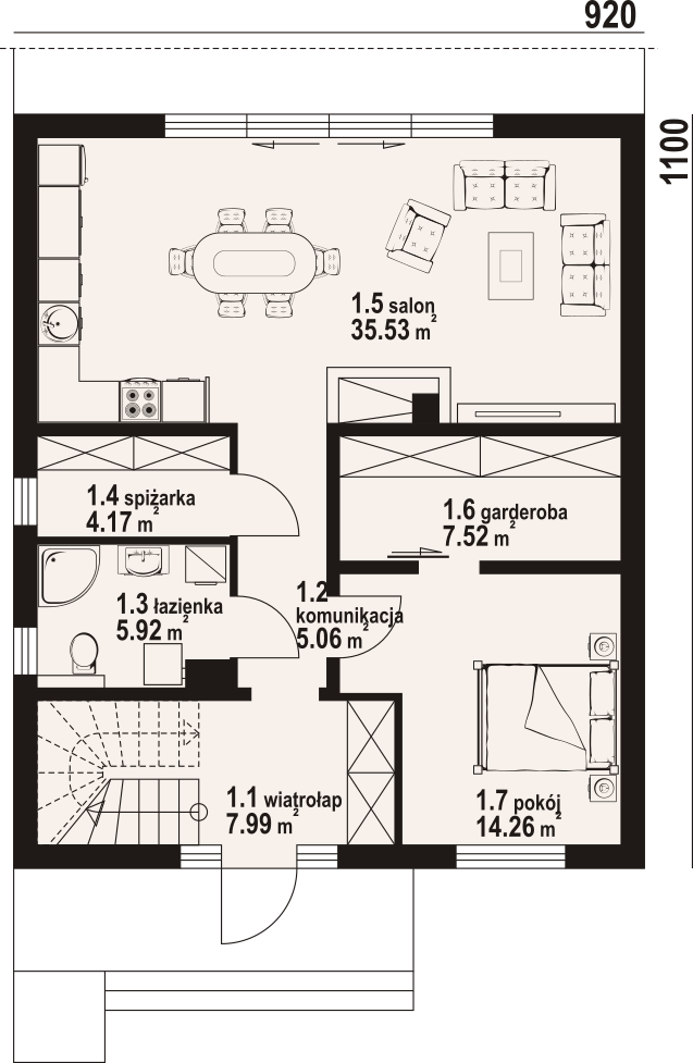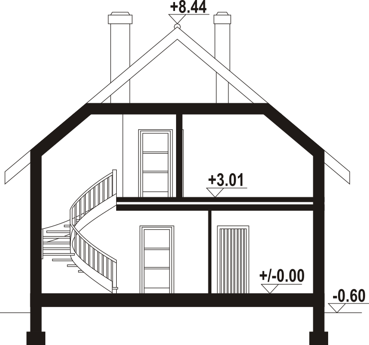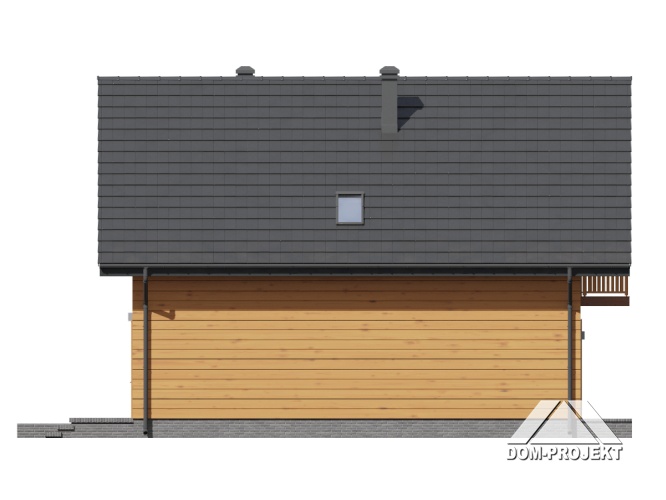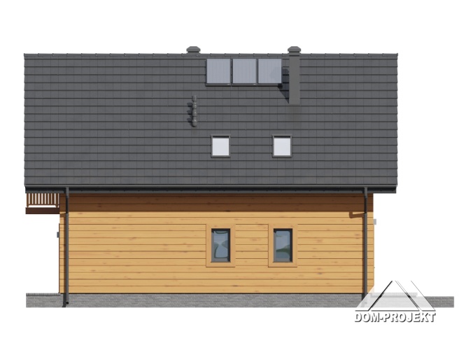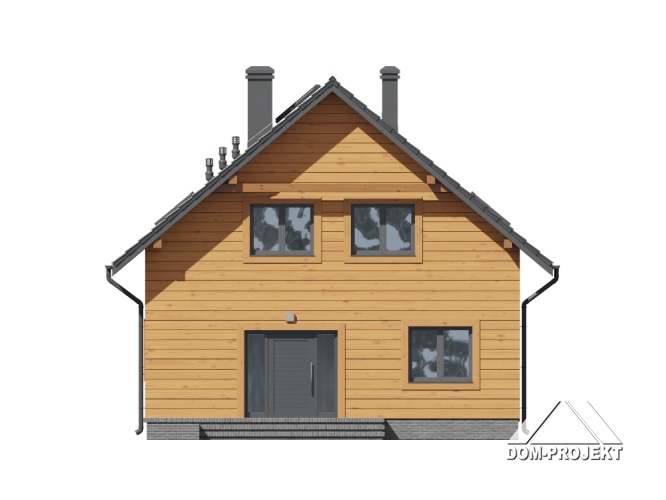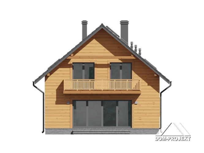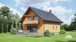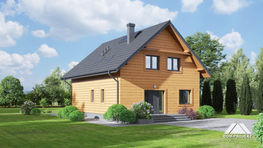Dom w konstrukcji szkieletu drewnianego. Duży salon z aneksem kuchennym, kominkiem i wyjściem na taras. Pokój, garderoba, spiżarka, łazienka, komunikacja i wiatrołap. Na poddaszu trzy pokoje, łazienka, garderoba, wc, korytarz i balkon. Zwarta bryła budynku i dach dwuspadowy sprzyjają szybkiej i taniej budowie i niskim kosztom eksploatacji.