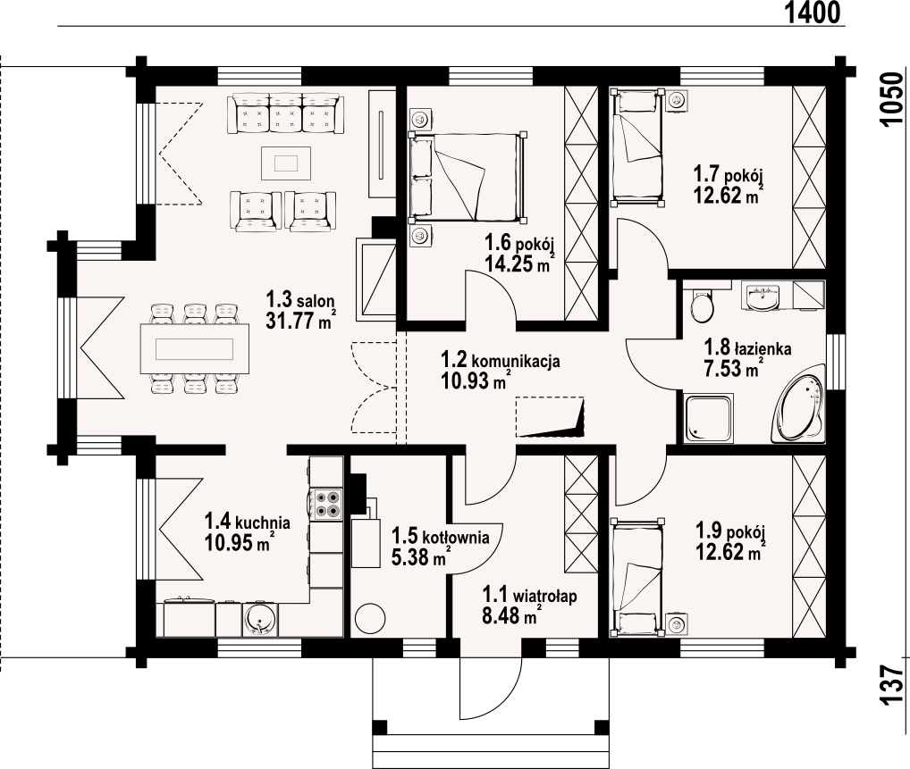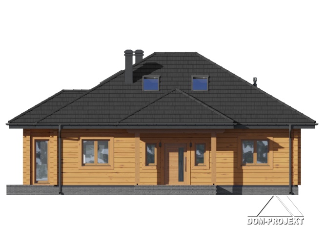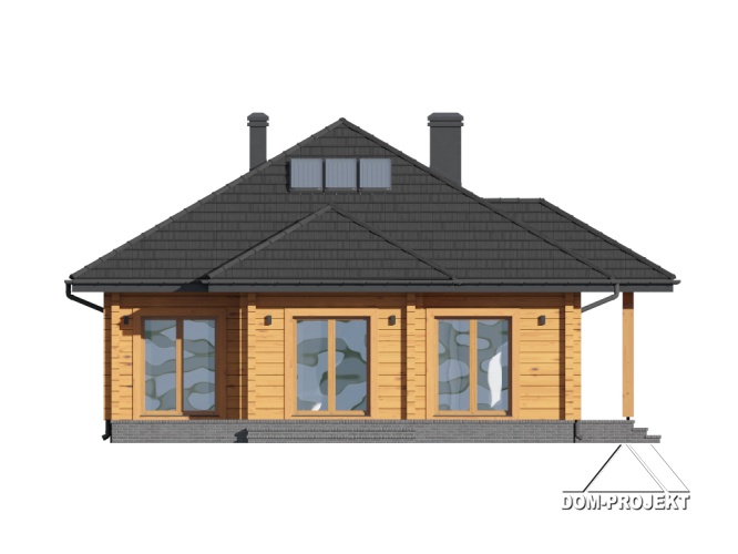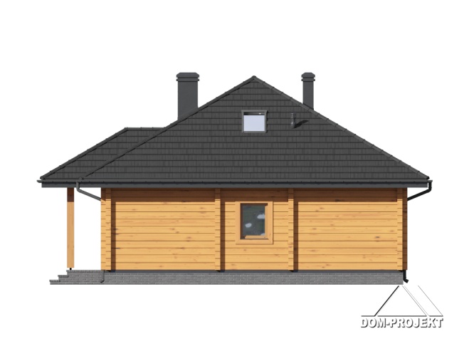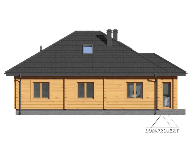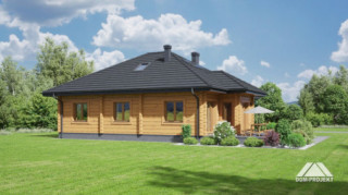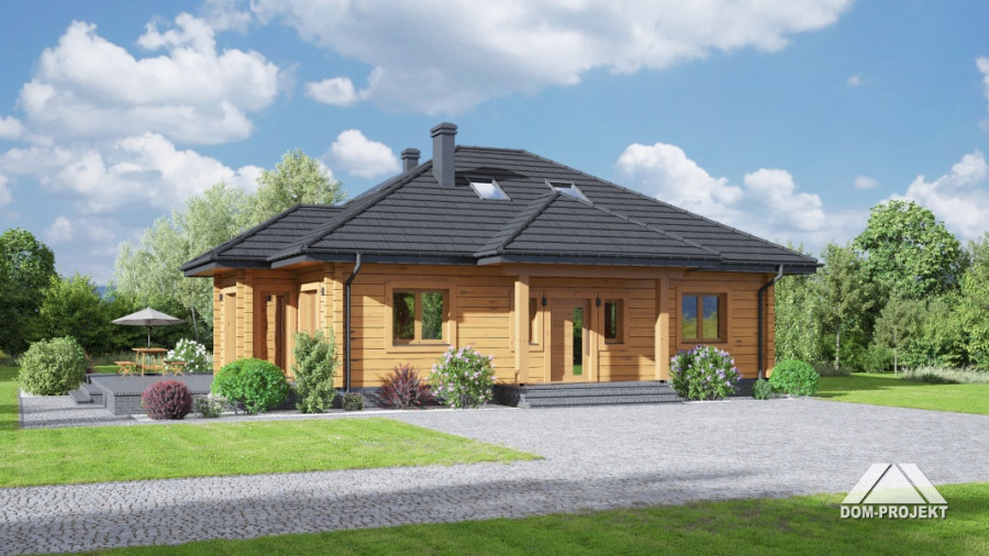 Dom z bali. Parterowy. Duży salon z kominkiem, wyjściami na taras i przejściem do wygodnie umeblowanej kuchni. Trzy pokoje, łazienka, kotłownia, wiatrołap i komunikacja. Poddasze nieużytkowe. Wyjście na poddasze schodami strychowymi rozkładanymi.