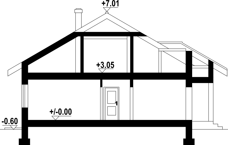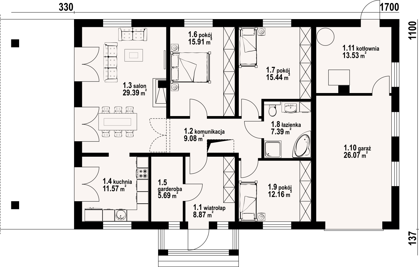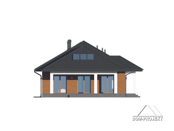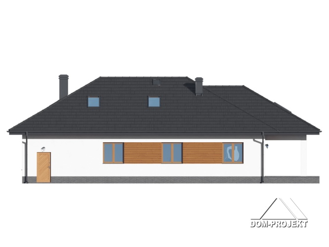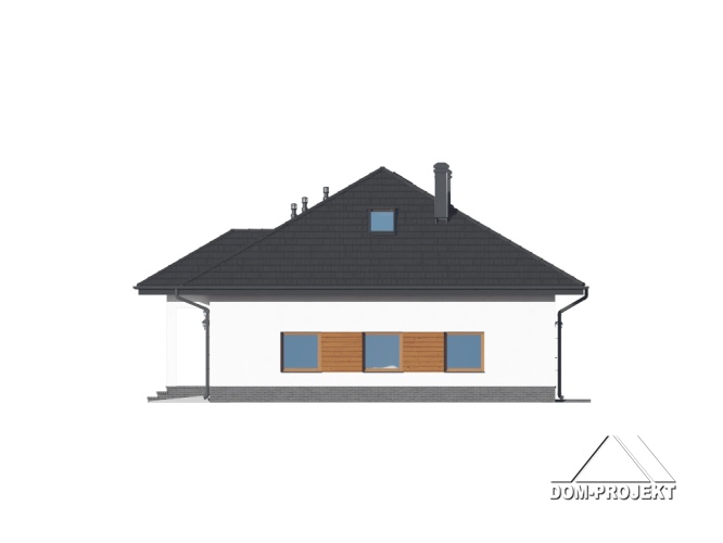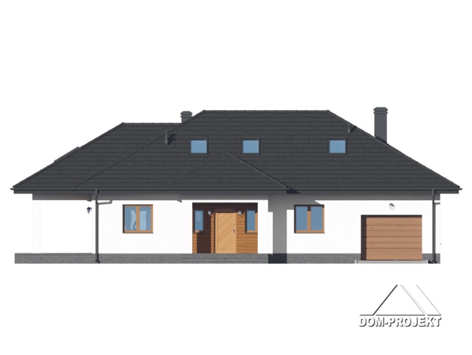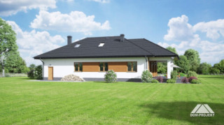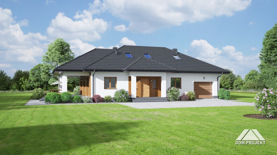 Parterowy dom z garażem. Duży salon z kominkiem, wyjściami na zadaszony taras oraz przejściem do kuchni. Trzy pokoje, łazienka, garderoba, wiatrołap, komunikacja, garaż, kotłownia. Wyjście na poddasze nieużytkowe schodami strychowymi rozkładanymi.