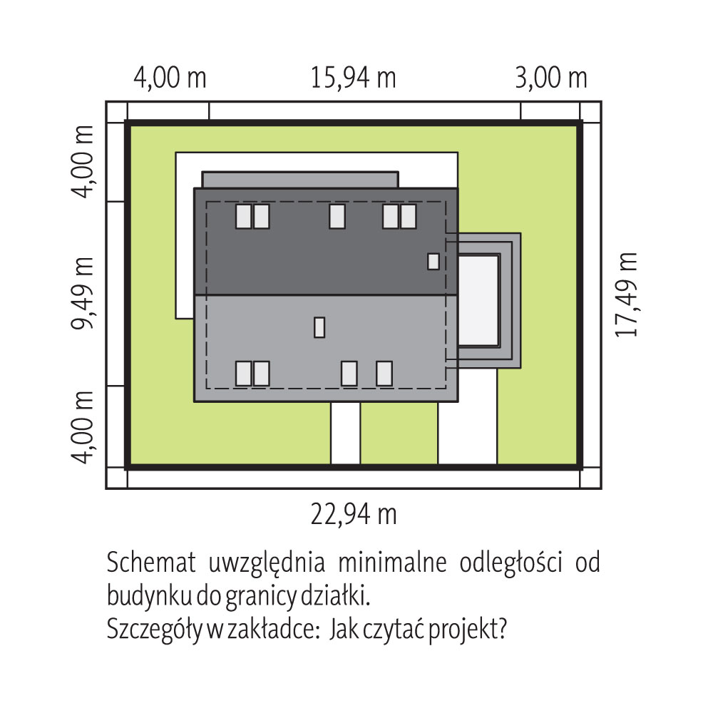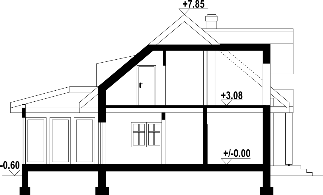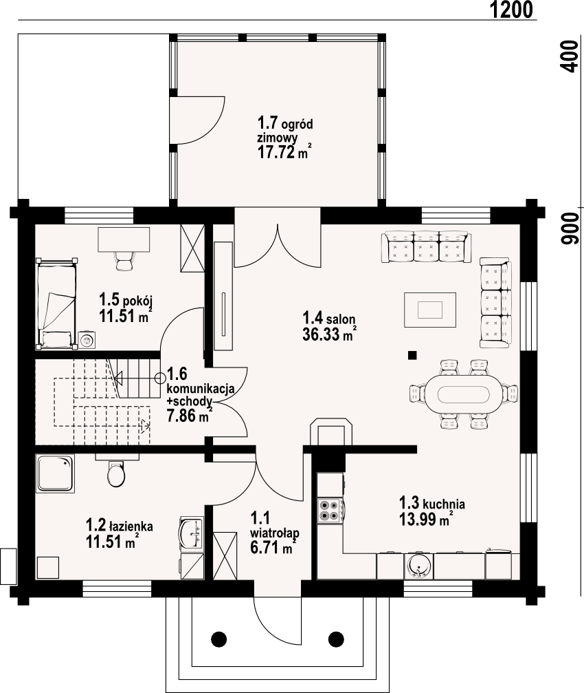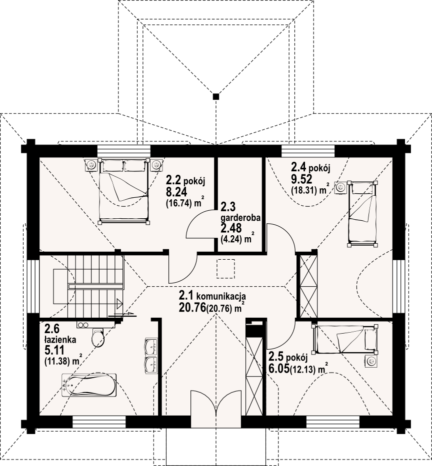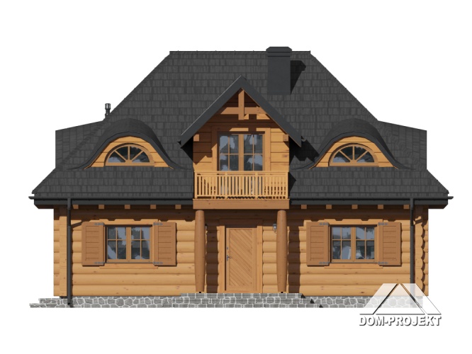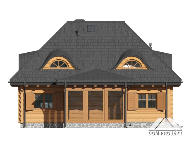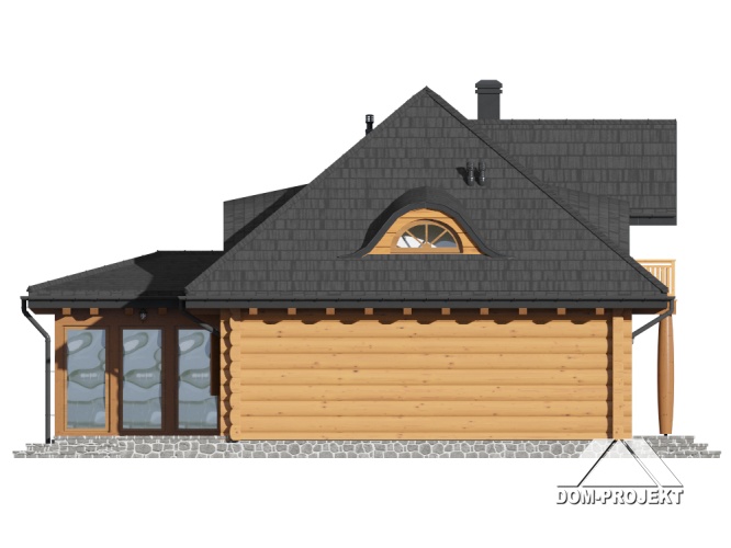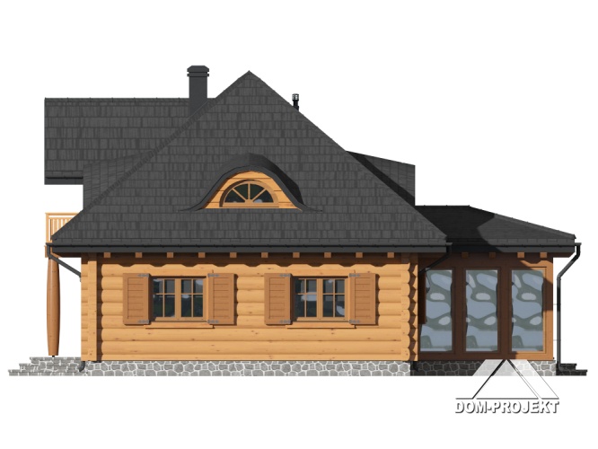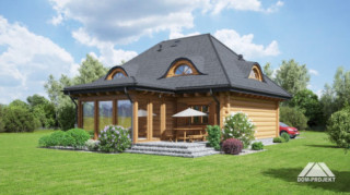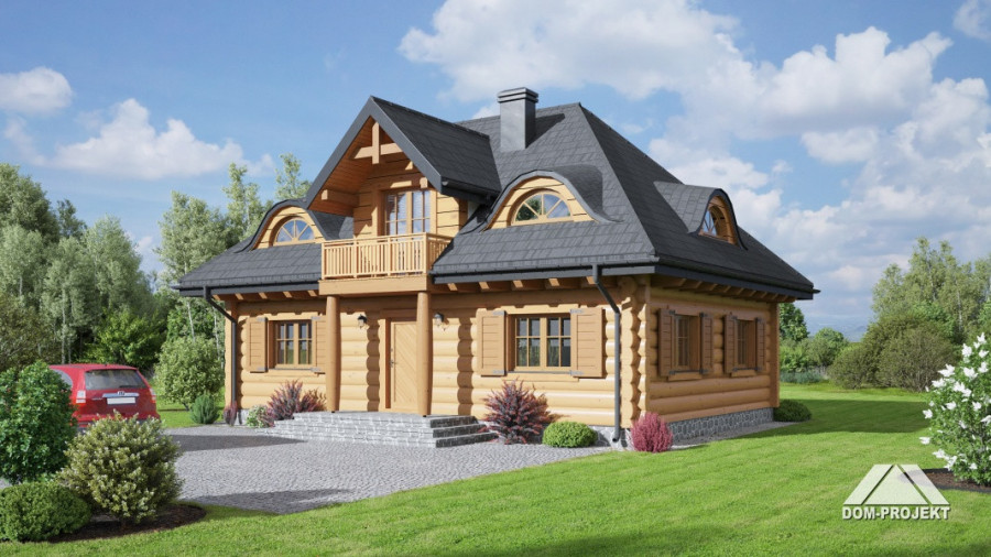 Dom z bali. Na parterze duży salon z kuchnią, kominkiem i wyjściem do ogrodu przez ogród zimowy. Pokój, łazienka, komunikacja i wiatrołap. Na poddaszu trzy pokoje, łazienka, komunikacja, garderoba i balkon.