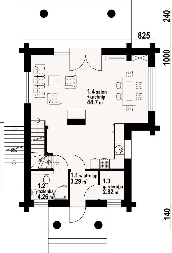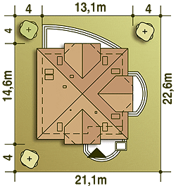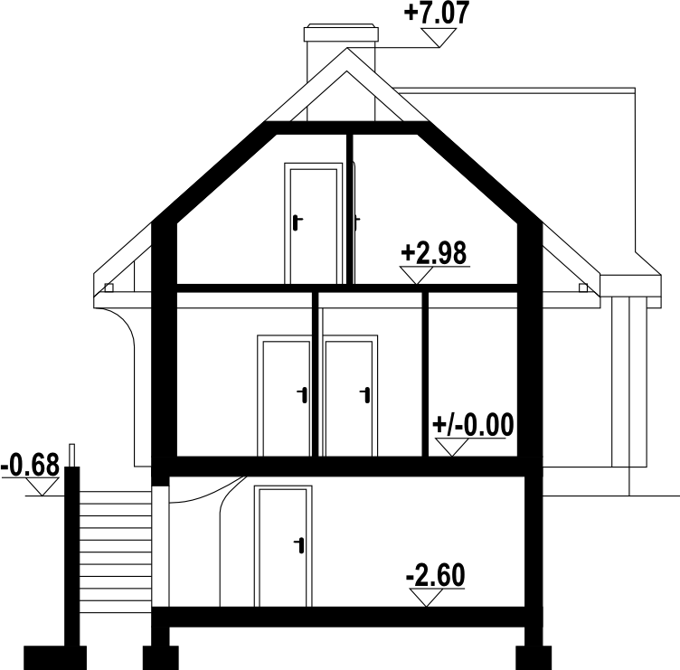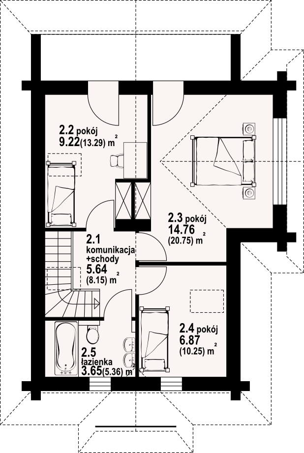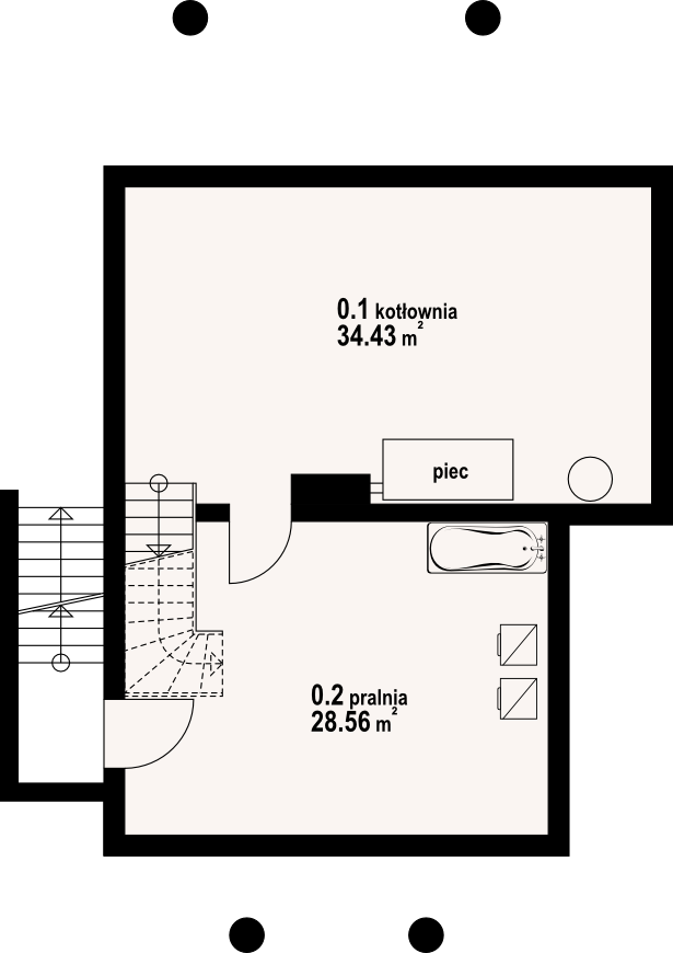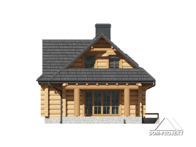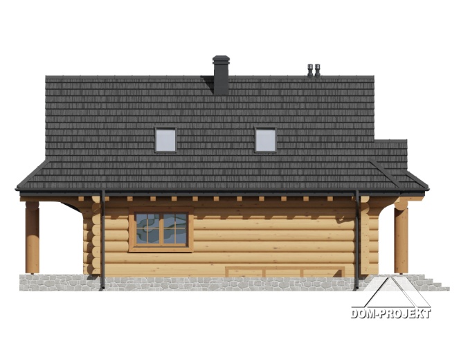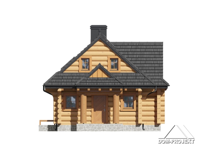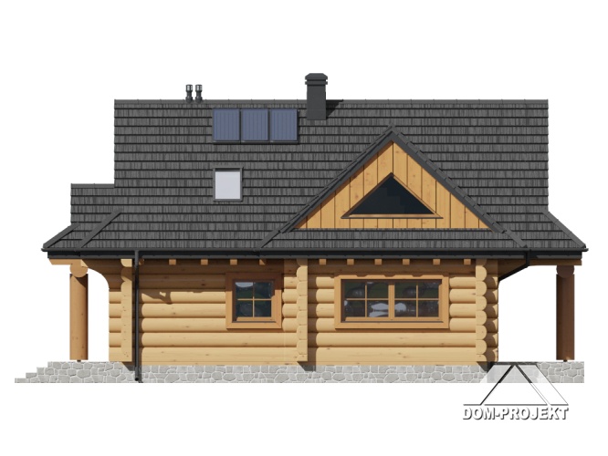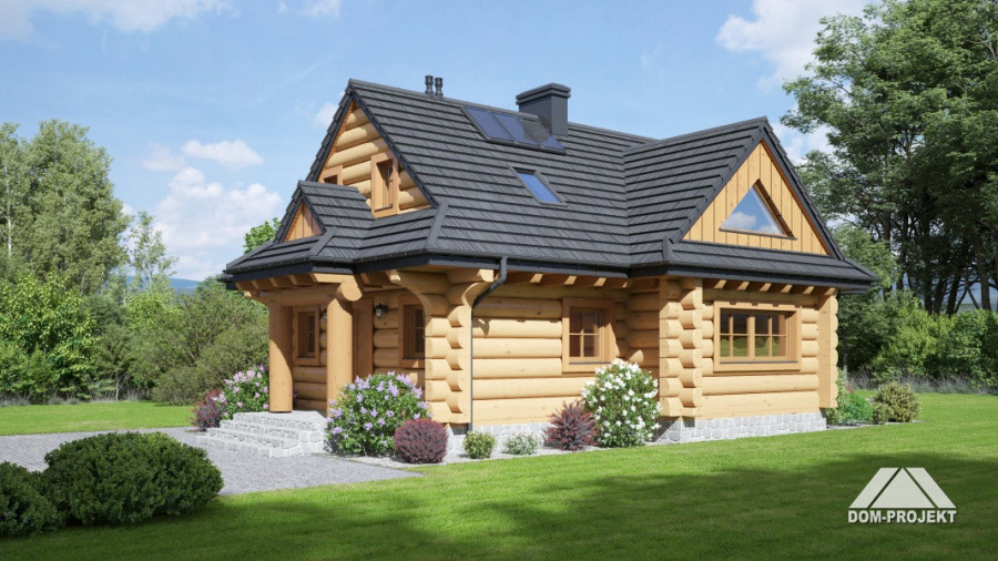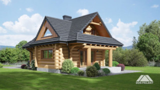 Dom z bali. Podpiwniczony. Parter: duży salon z aneksem kuchennym, kominkiem, schodami na poddasze i wyjściem na zadaszony taras. Łazienka, wiatrołap i garderoba. Na poddaszu trzy pokoje, łazienka, komunikacja i balkon.Poddasze: trzy pokoje, łazienka, komunikacja i balkon. Piwnice: pralnia, kotłownia i schody na parter. Zwarta bryła budynku i dach dwuspadowy sprzyjają szybkiej i taniej budowie i niskim kosztom eksploatacji.