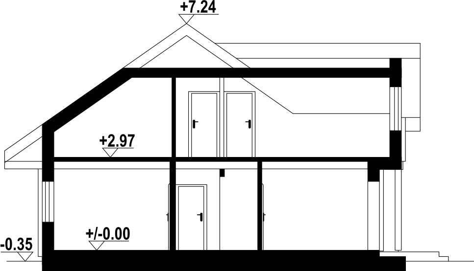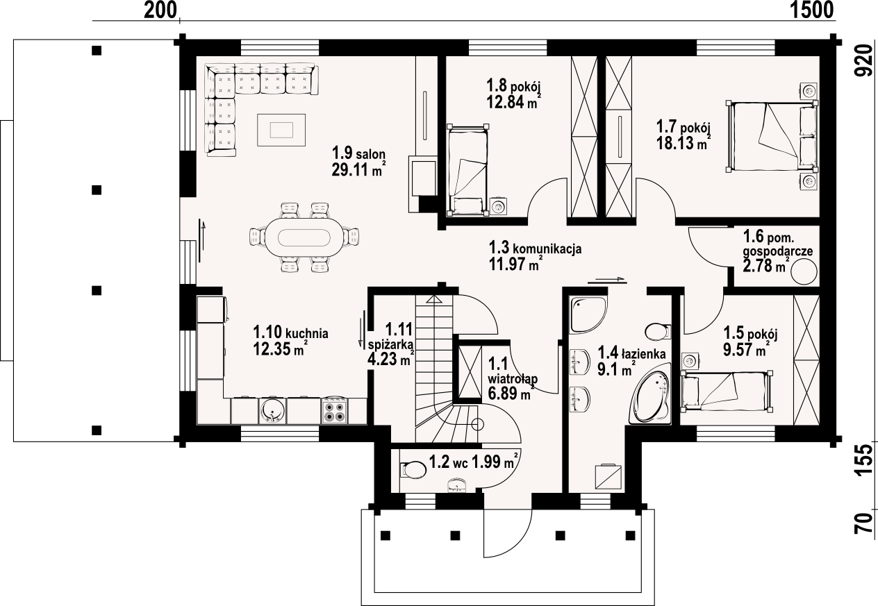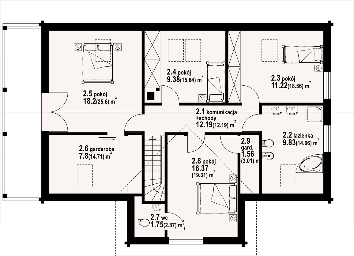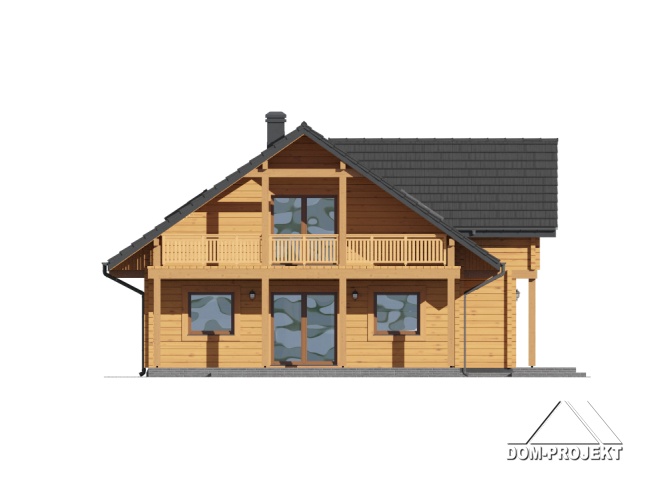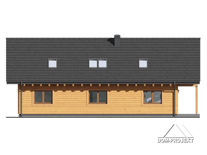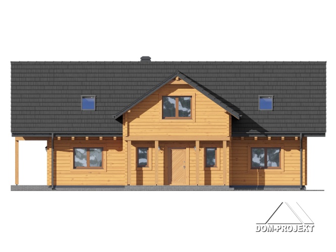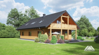 Dom w konstrukcji szkieletu drewnianego. Na parterze duży salon z kominkiem oraz wyjściem na częściowo zadaszony taras. Duża kuchnia otwarta na salon. Trzy pokoje, łazienka, wc, spiżarka, wiatrołap i pomieszczenie gospodarcze. Na poddaszu cztery pokoje, dwie garderoby, duża łazienka, wc, komunikacja i duży balkon przy największym pokoju. Zwarta bryła budynku i dach dwuspadowy sprzyjają szybkiej i taniej budowie i niskim kosztom eksploatacji.