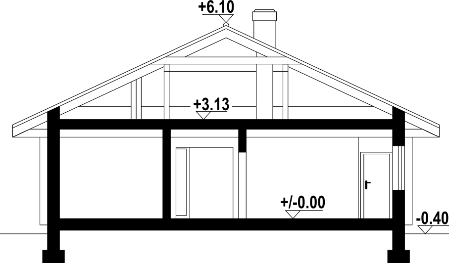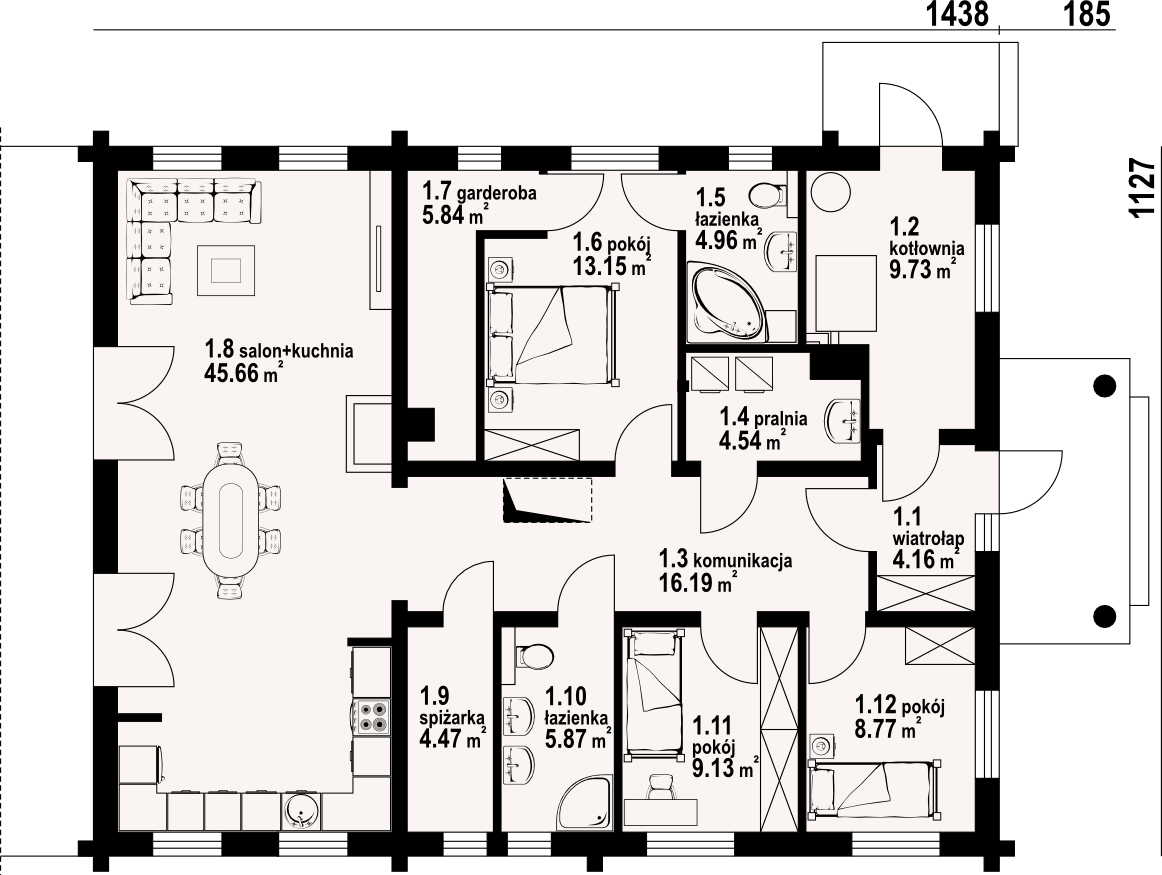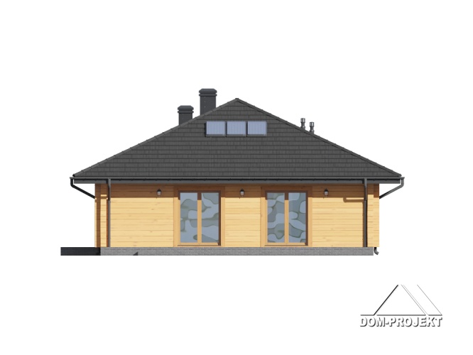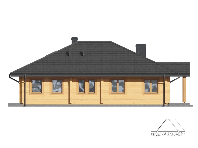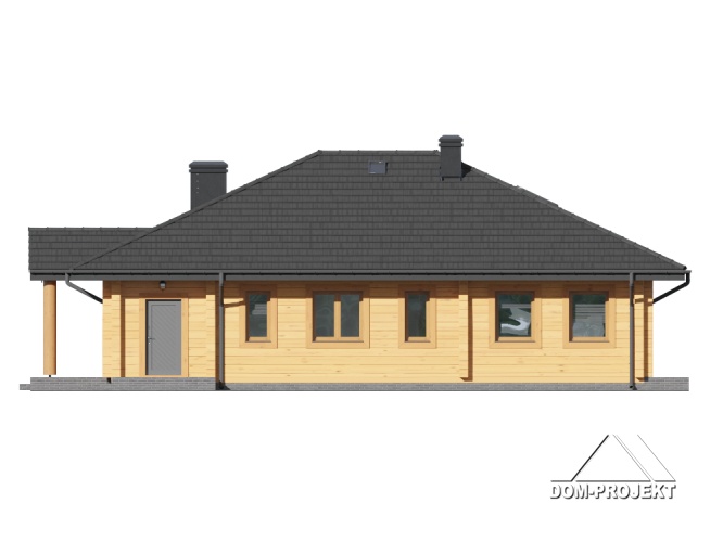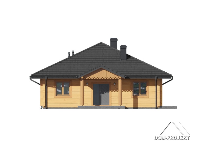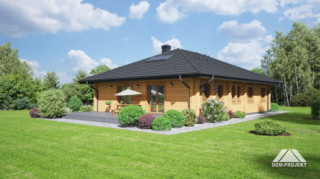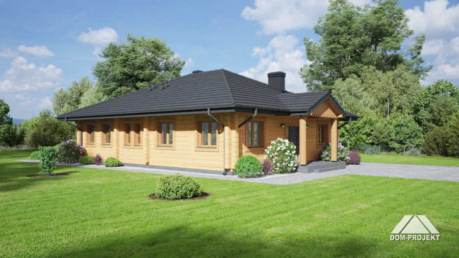 Parterowy dom z bali. Duży salon z kuchnią, kominkiem oraz wyjściami na taras. Trzy pokoje. Jeden pokój z własną łazienką oraz garderobą. Łazienka, pralnia, spiżarka, kotłownia, wiatrołap i komunikacja. Wejście na strych schodami strychowymi składanymi.
