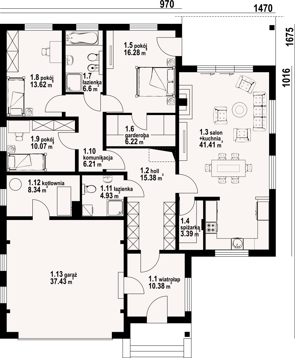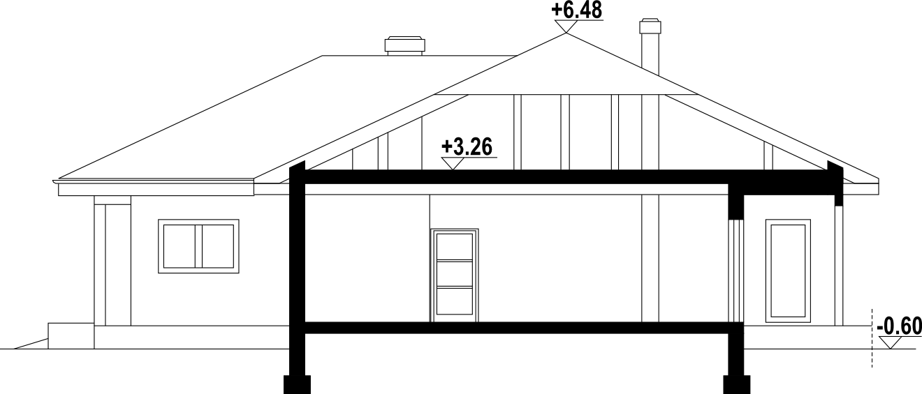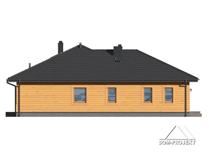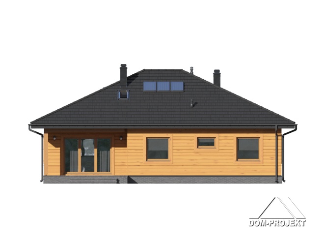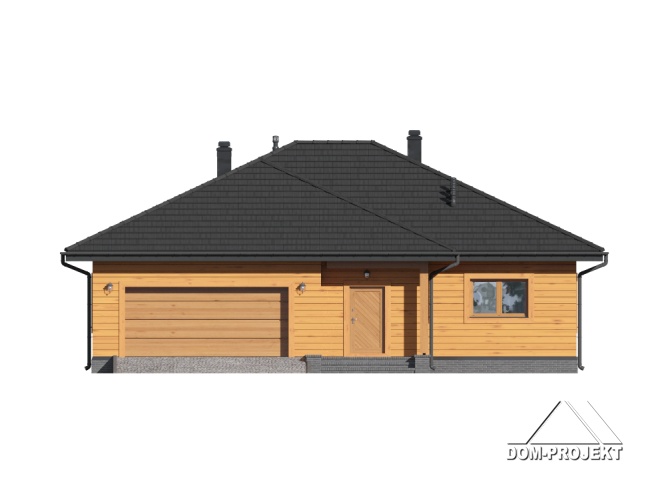 Dom parterowy w konstrukcji szkieletu drewnianego. Duży salon z aneksem kuchennym i wyjściem na taras. Trzy pokoje, dwie łazienki, garderoba, spiżarka, holl, wiatrołap, komunikacja, garaż na dwa samochody i kotłownia. Poddasze nieużytkowe. Wyjście na poddasze schodami rozkładanymi z holu. Zwarta bryła budynku sprzyja szybkiej i taniej budowie i niskim kosztom eksploatacji.