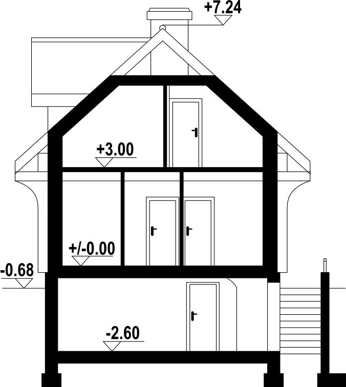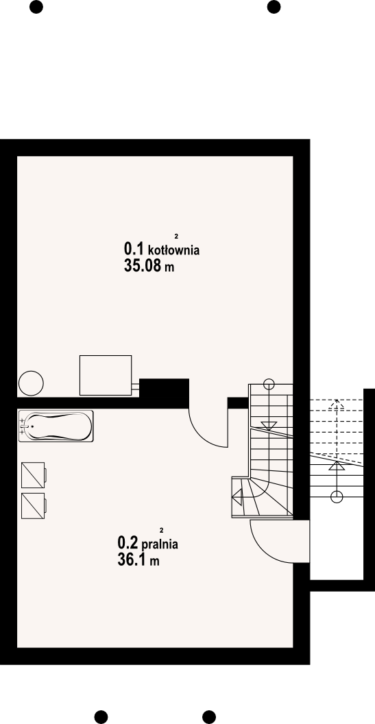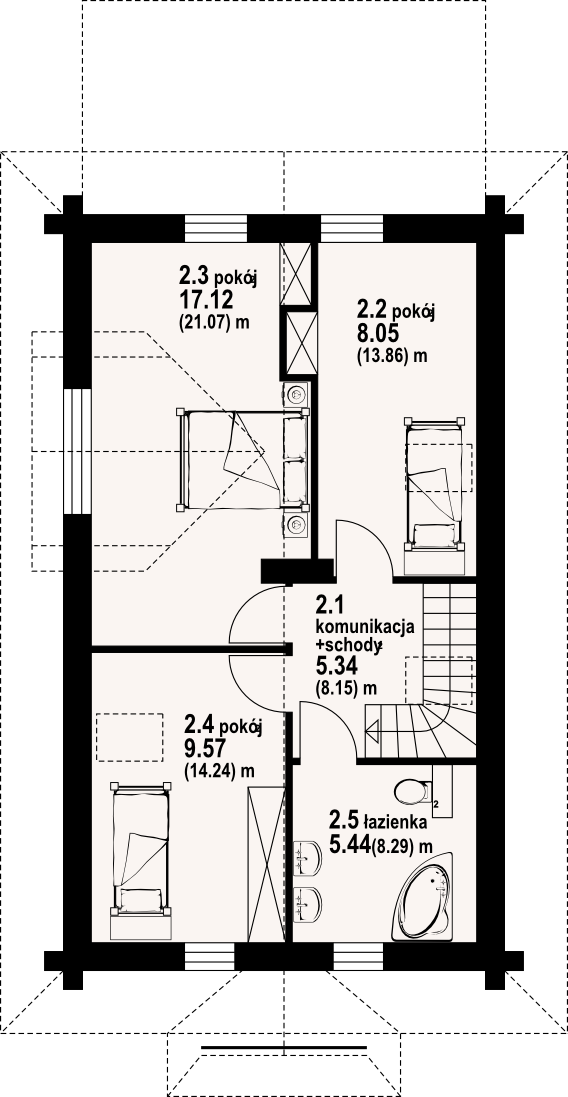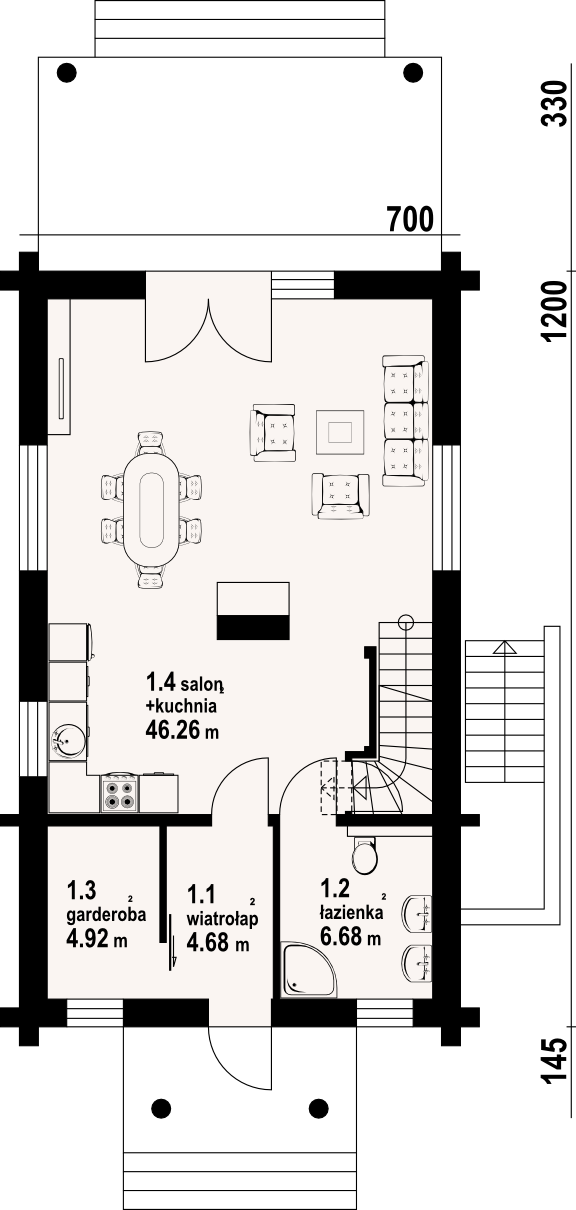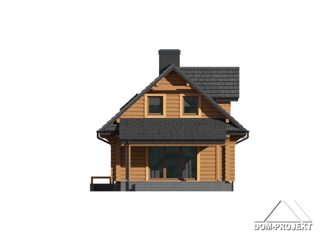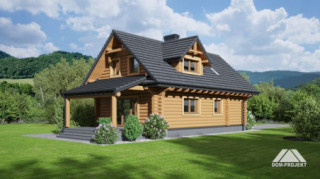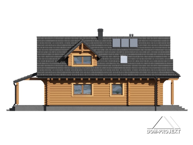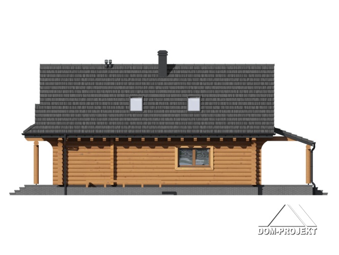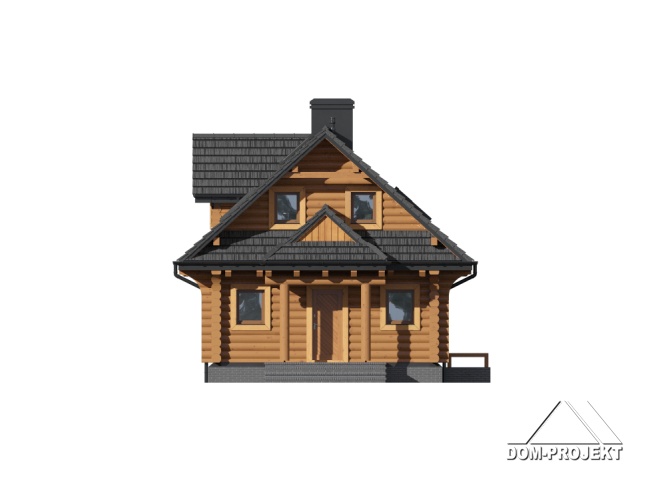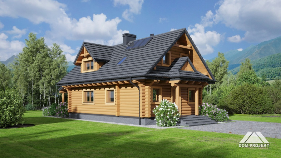 Dom z bali drewnianych. Podpiwniczony. Na parterze duży salon z kuchnią, kominkiem oraz wyjściem na zadaszony taras. Łazienka, garderoba, wiatrołap. Na poddaszu trzy pokoje, łazienka i komunikacja. W piwnicach kotłownia i pralnia. Zwarta bryła budynku i dach dwuspadowy sprzyjają szybkiej i taniej budowie i niskim kosztom eksploatacji.