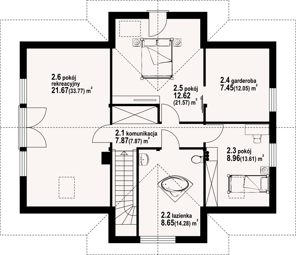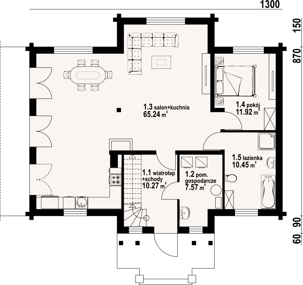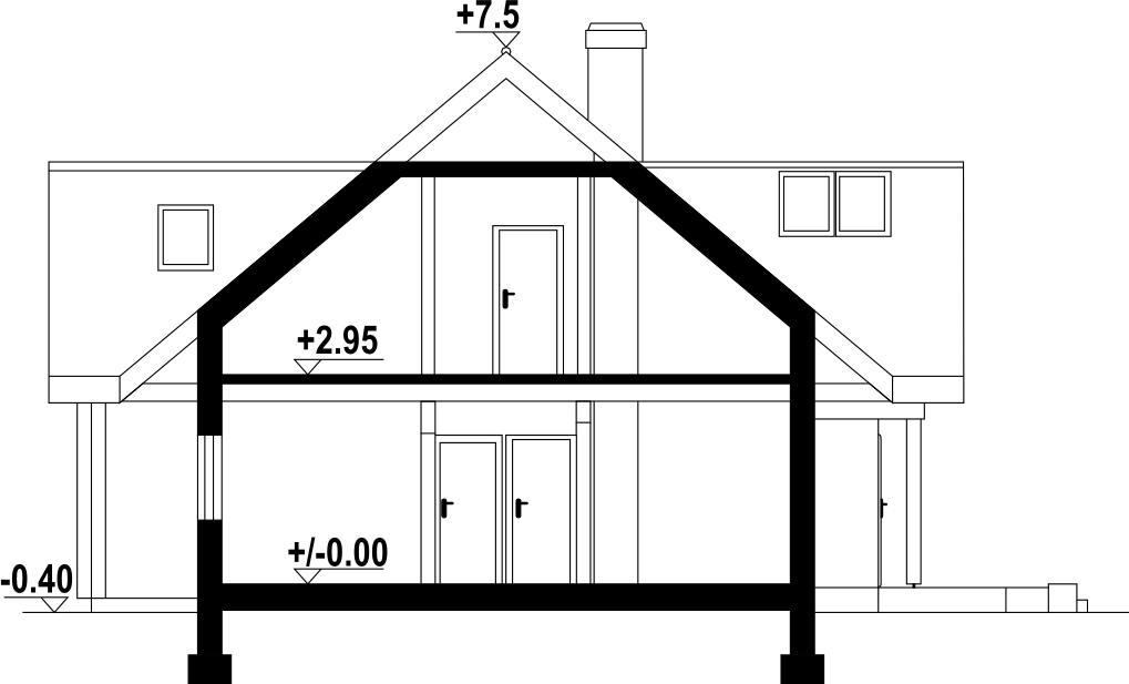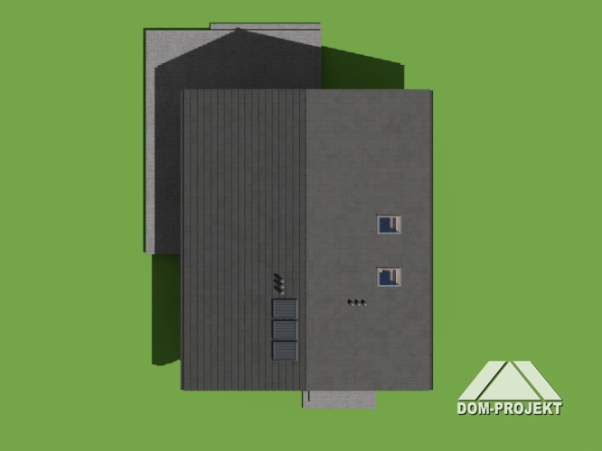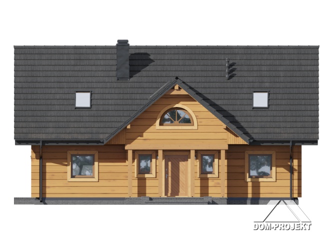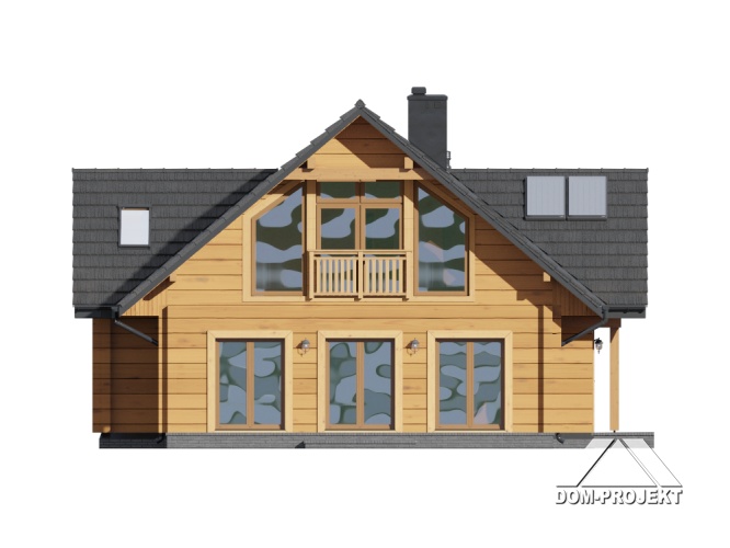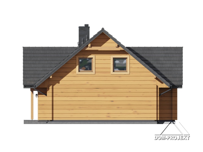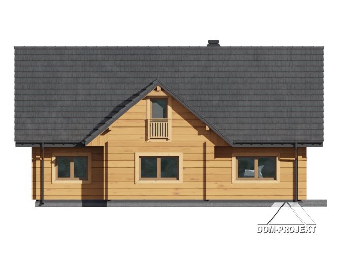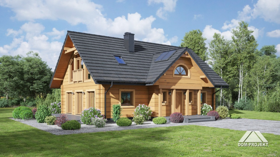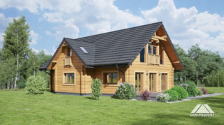 Dom z bali z poddaszem użytkowym. Na parterze duży salon z aneksem kuchennym, kominkiem i wyjściami na taras. Pokój, łazienka, pomieszczenie gospodarcze, wiatrołap ze schodami na poddasze. Na poddaszu trzy pokoje, garderoba, łazienka i komunikacja.