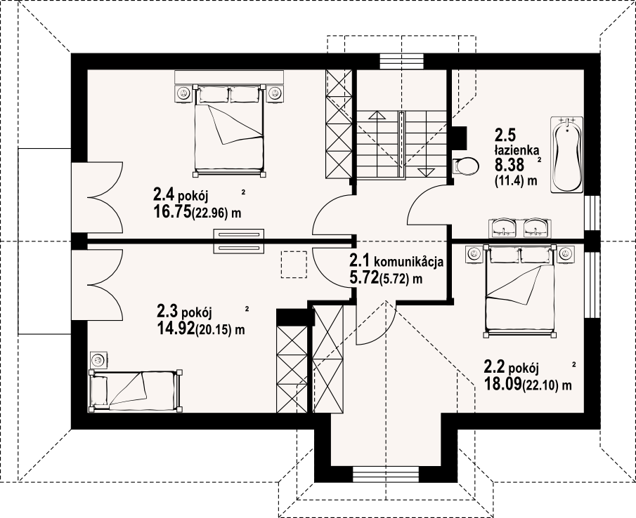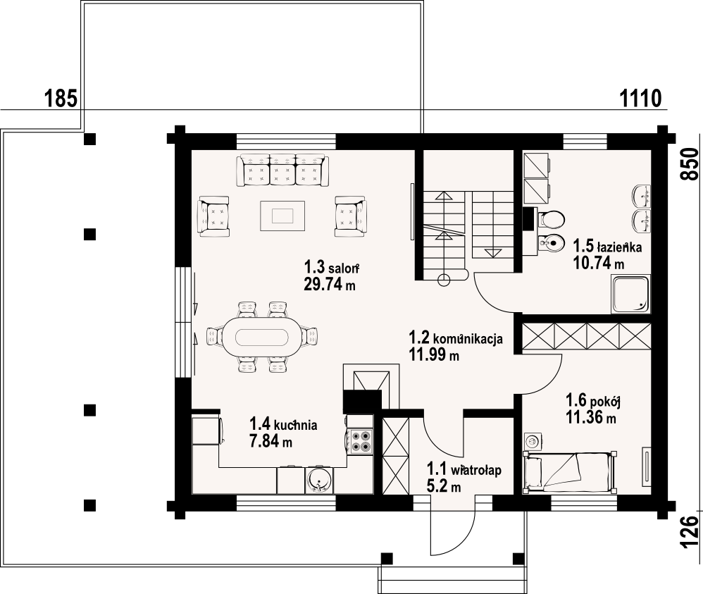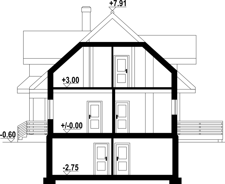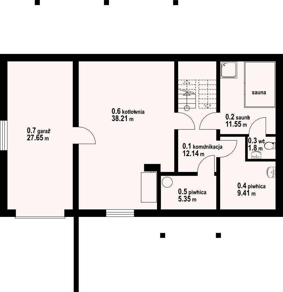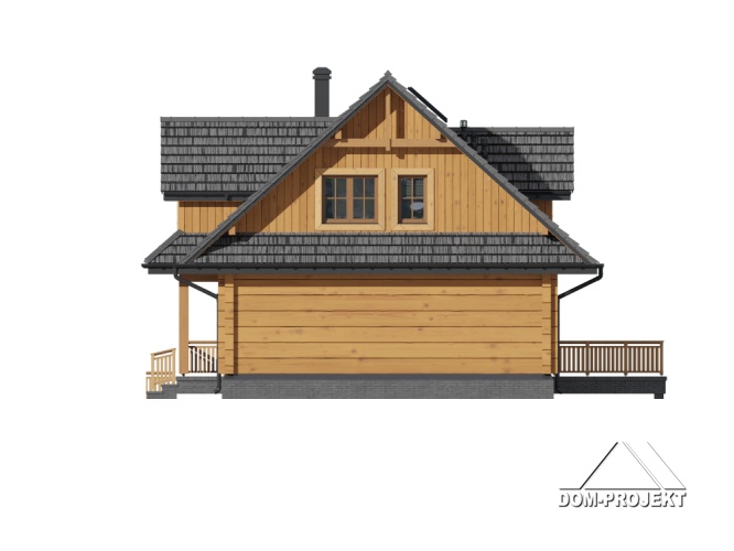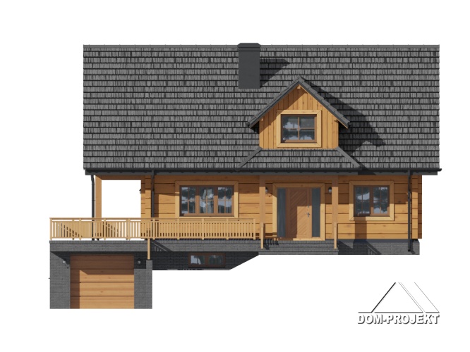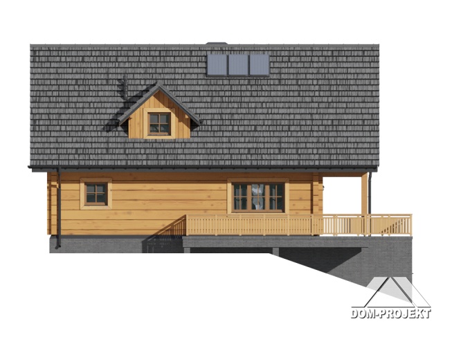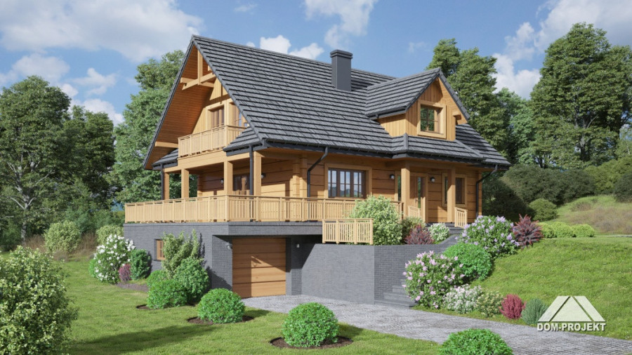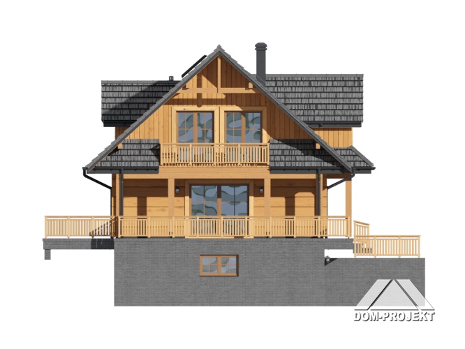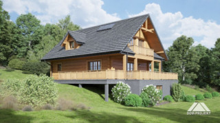 Dom z bali drewnianych. Podpiwniczony. Na parterze salon z kuchnią, kominkiem oraz wyjściem na częściowo zadaszony taras. Pokój, łazienka, wiatrołap, komunikacja. Na poddaszu trzy pokoje, w tym dwa z wyjściem na balkon, łazienka i komunikacja. W podpiwniczeniu garaż, kotłownia, komunikacja, dwie piwnice, sauna oraz wc.
