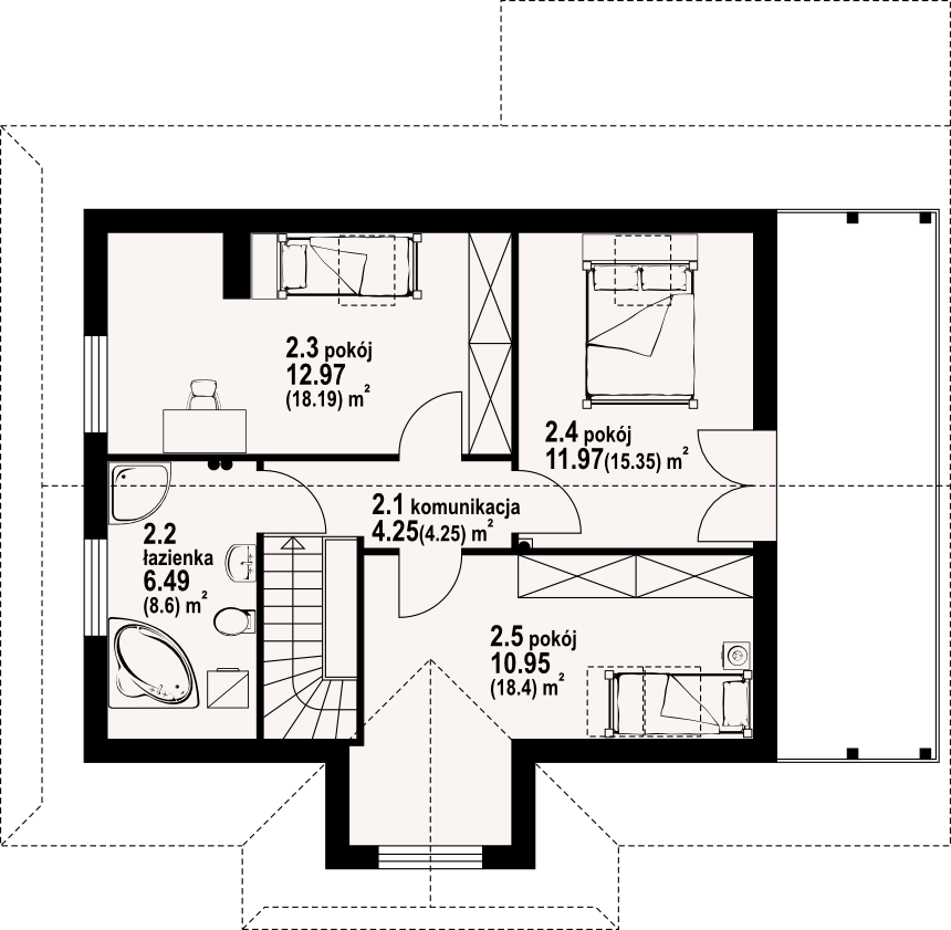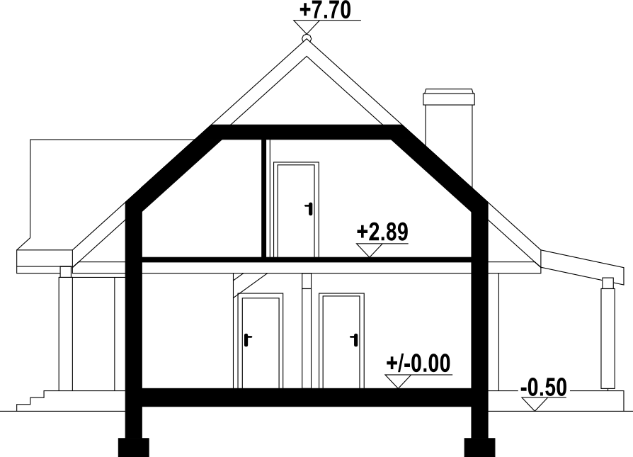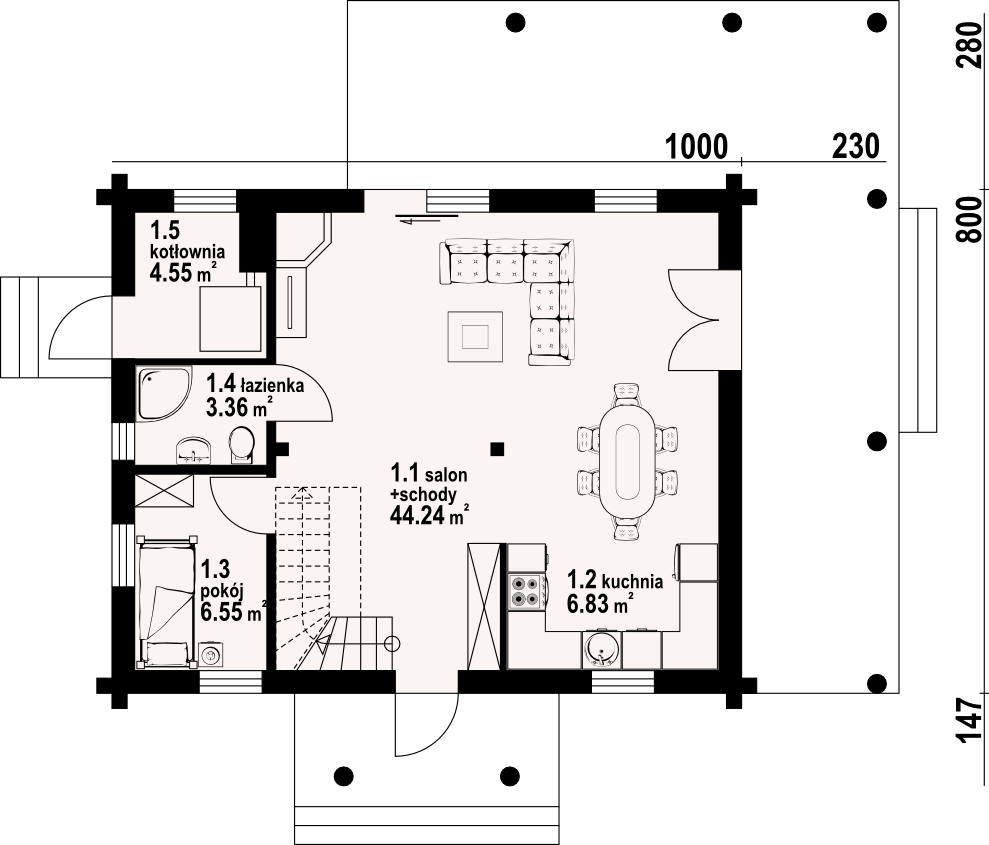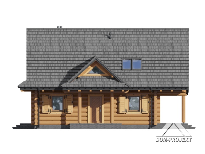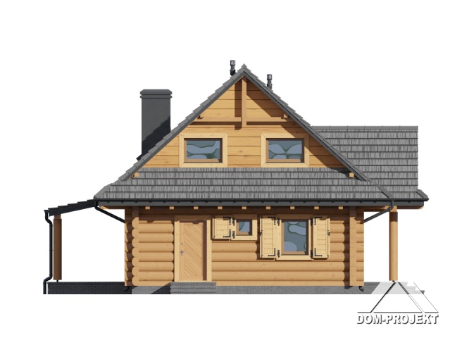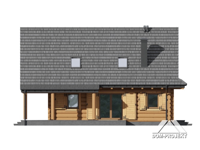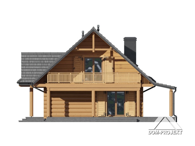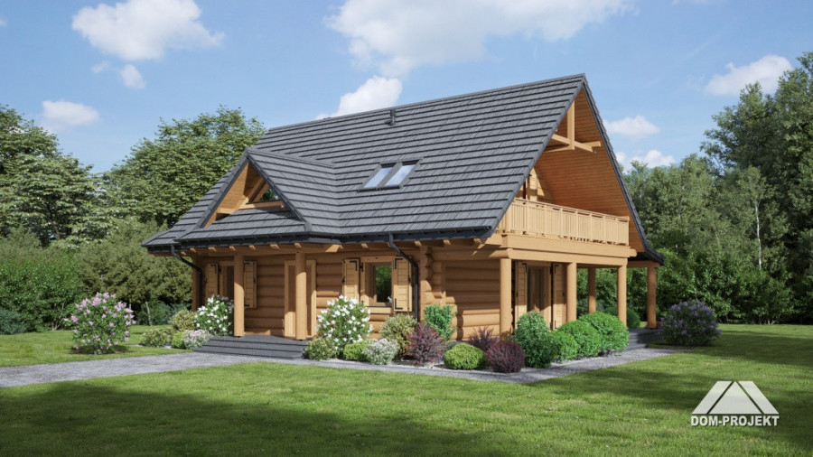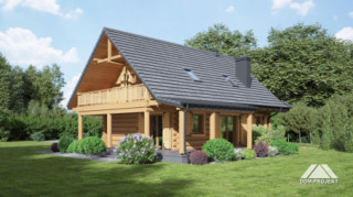 Dom z bali drewnianych. Duży salon z aneksem kuchennym, kominkiem, wyjściem na zadaszony taras i schodami na poddasze. Kotłownia, łazienka i pokój. Na poddaszu trzy pokoje, łazienka, komunikacja i balkon. Zwarta bryła budynku i dach dwuspadowy sprzyjają taniej i szybkiej budowie i niskim kosztom eksploatacji.