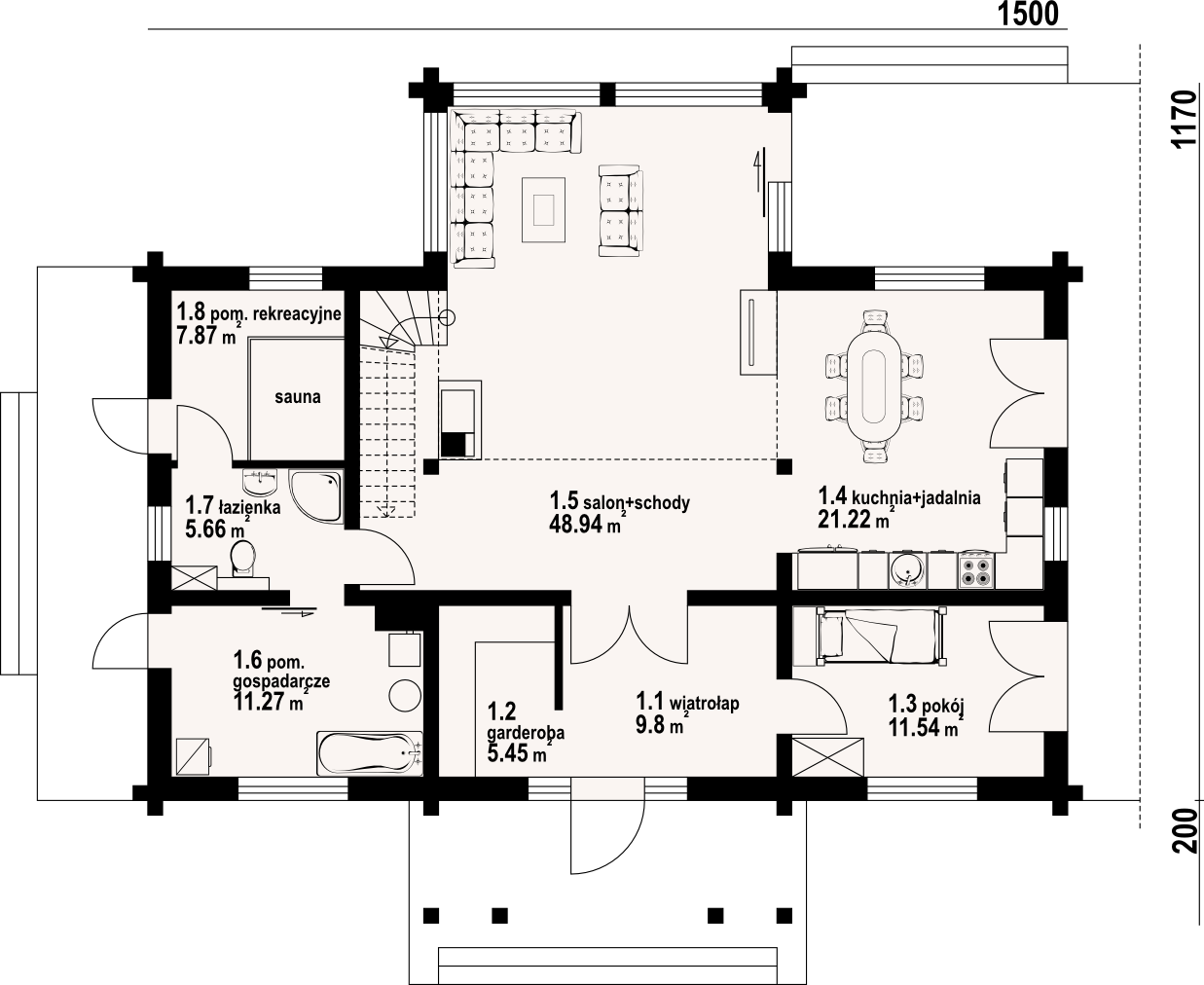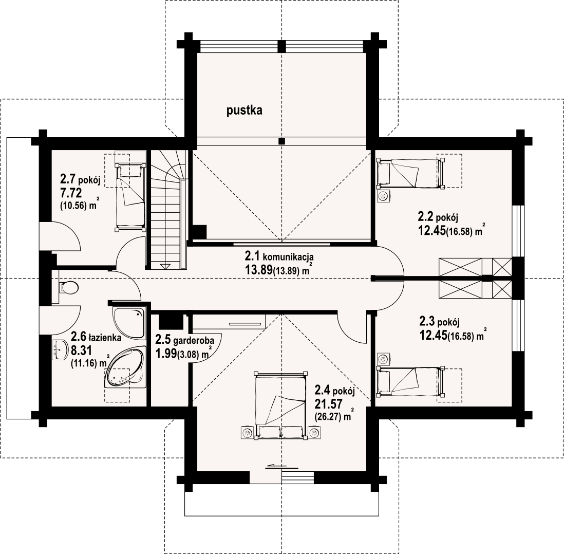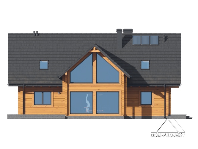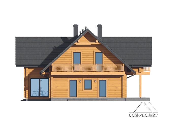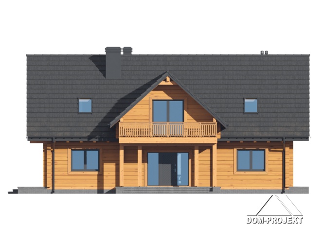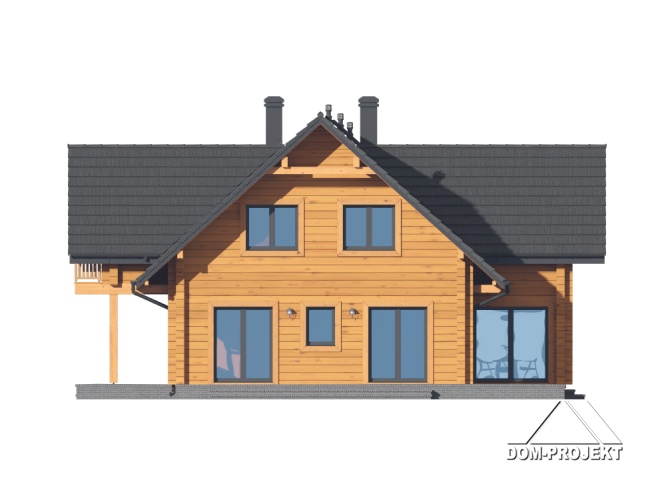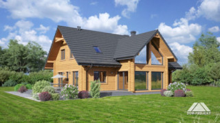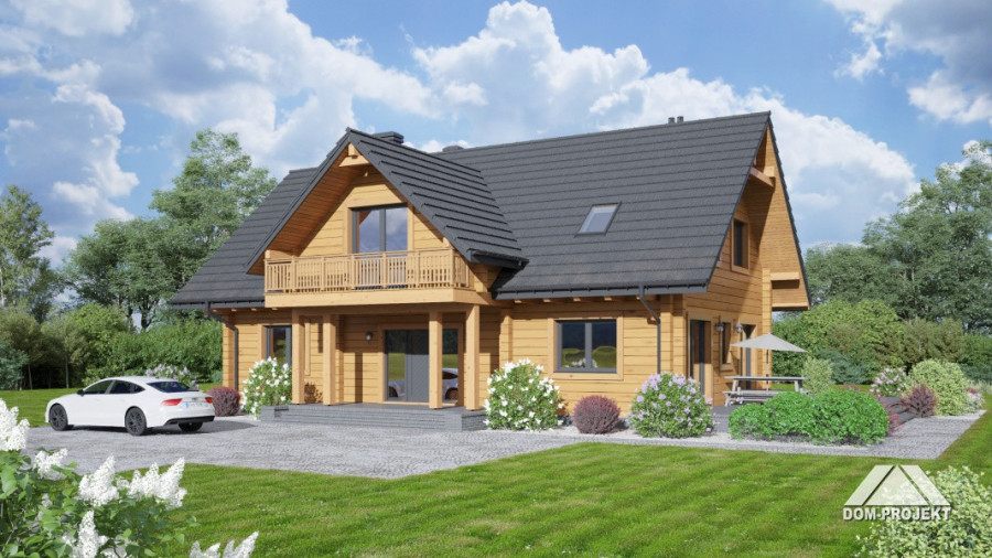 Dom z bali. Na parterze duży salon z kominkiem , wyjściem na taras i schodami na poddasze. Obok salonu duża otwarta kuchnia i jadalnia. Nad dużą częścią salonu otwarta przestrzeń. Pokój, łazienka, pomieszczenie gospodarcze, pomieszczenie rekreacyjne z sauną, wiatrołap i garderoba. Na poddaszu cztery pokoje, łazienka, komunikacja, pustka nad częścią salonu i dwa balkony.