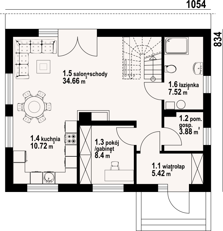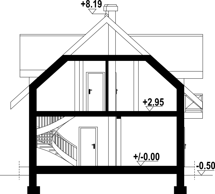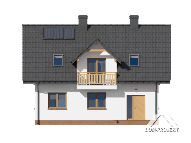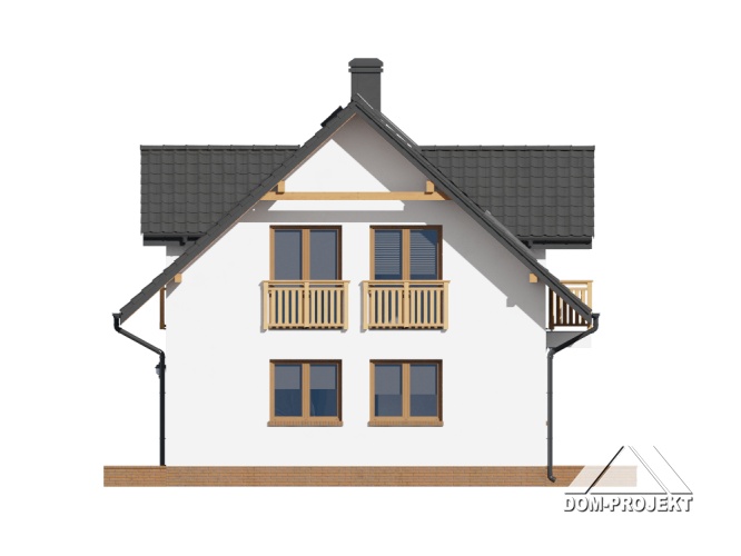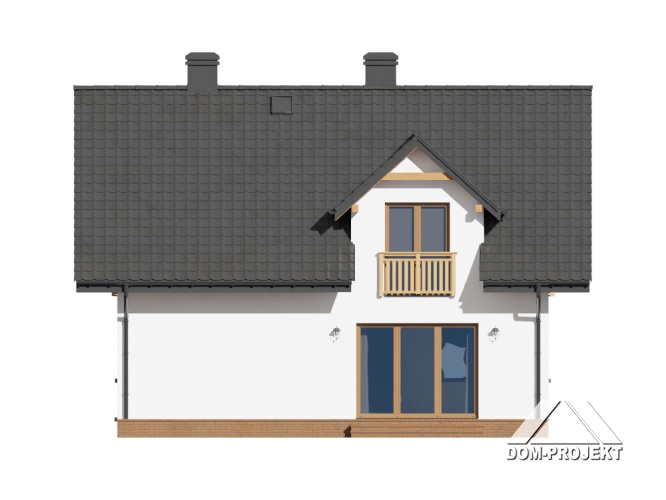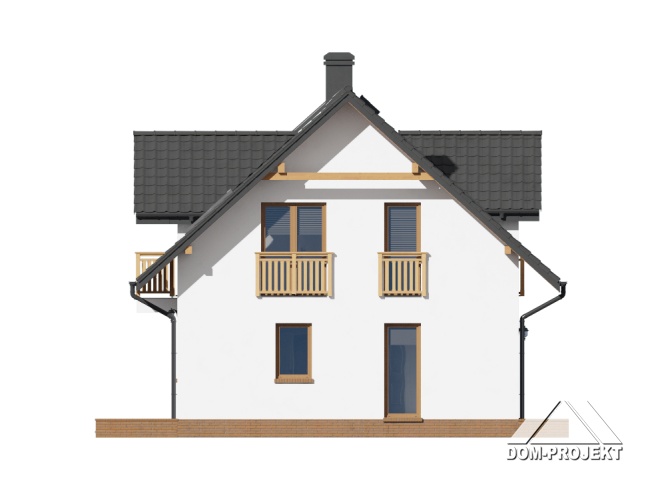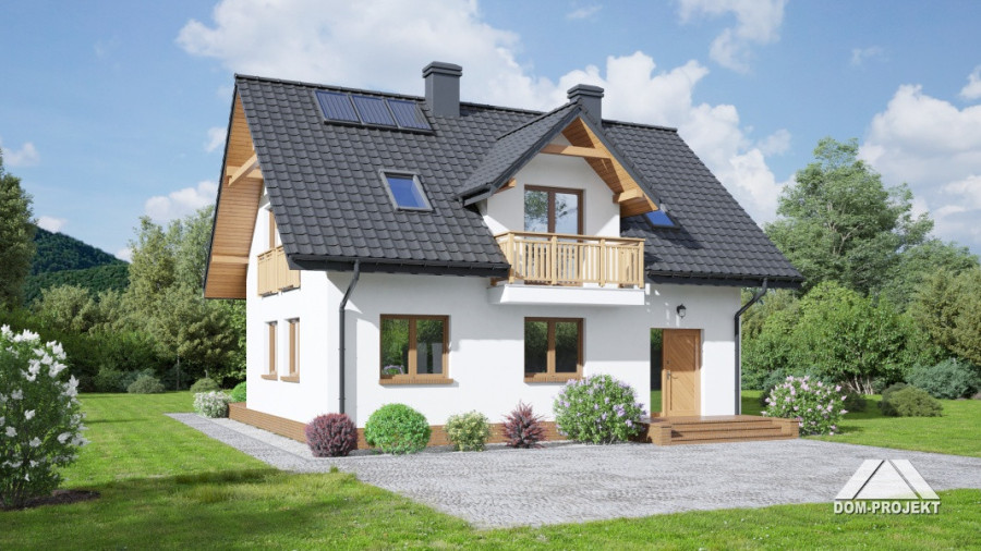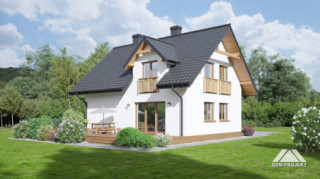Dom z poddaszem. Na parterze duży salon z dużym aneksem kuchennym, kominkiem, wyjściem na taras i schodami na poddasze. Pokój - gabinet, łazienka, pomieszczenie gospodarcze i wiatrołap. Na poddaszu trzy pokoje, w tym jeden z balkonem, łazienka, komunikacja. Zwarta bryła budynku i dach dwuspadowy sprzyjają szybkiej i taniej budowie oraz niskim kosztom eksploatacji.