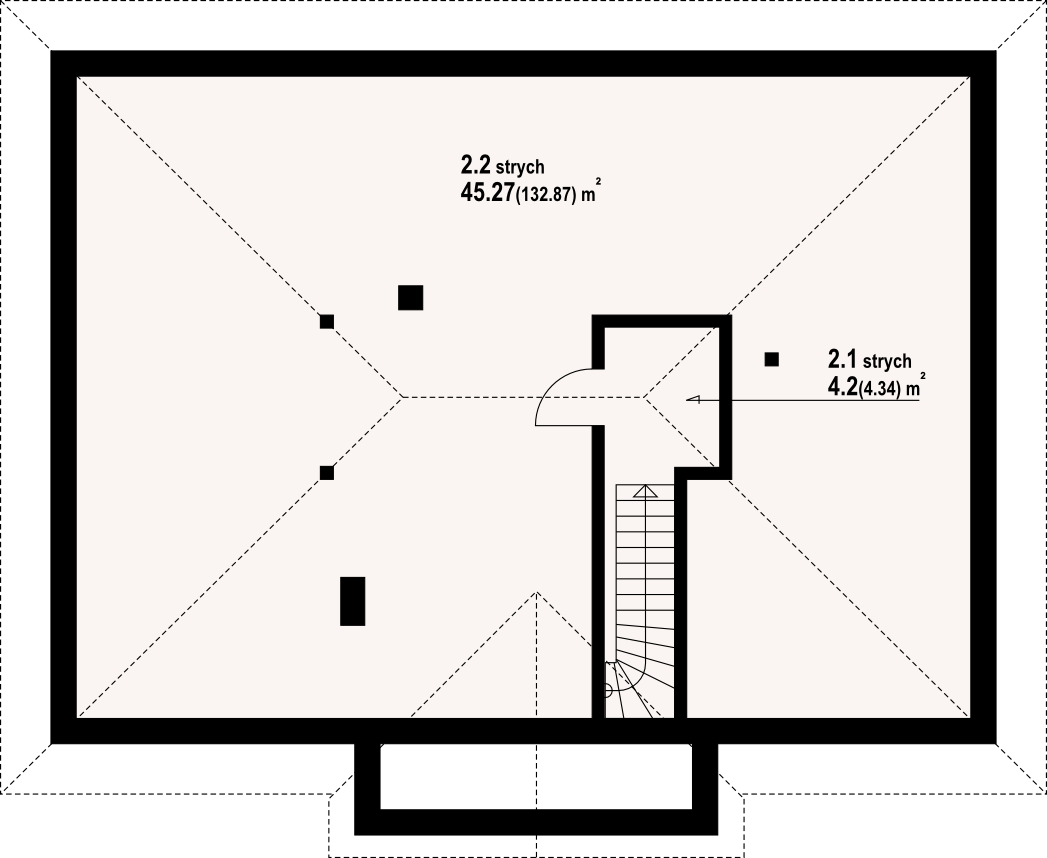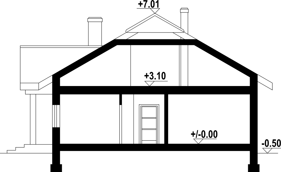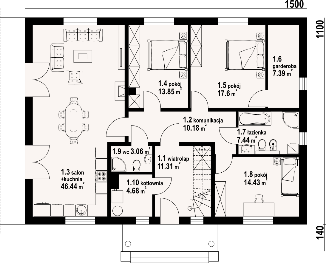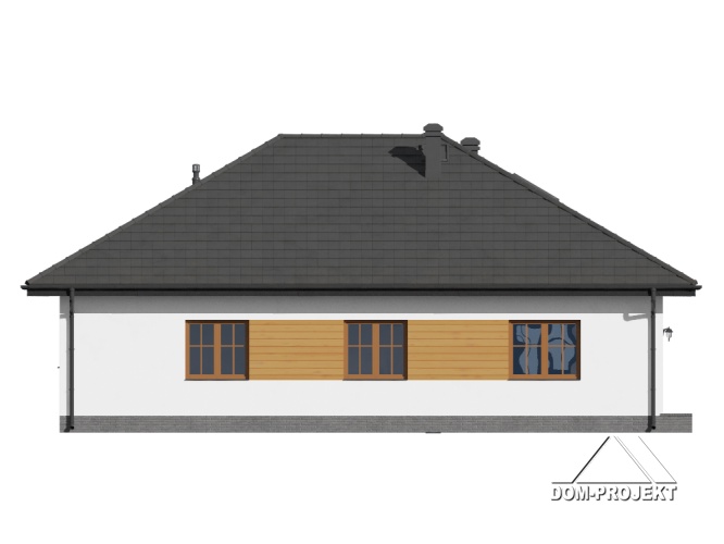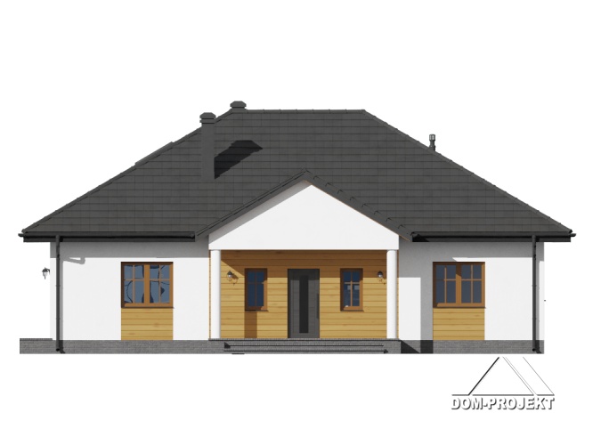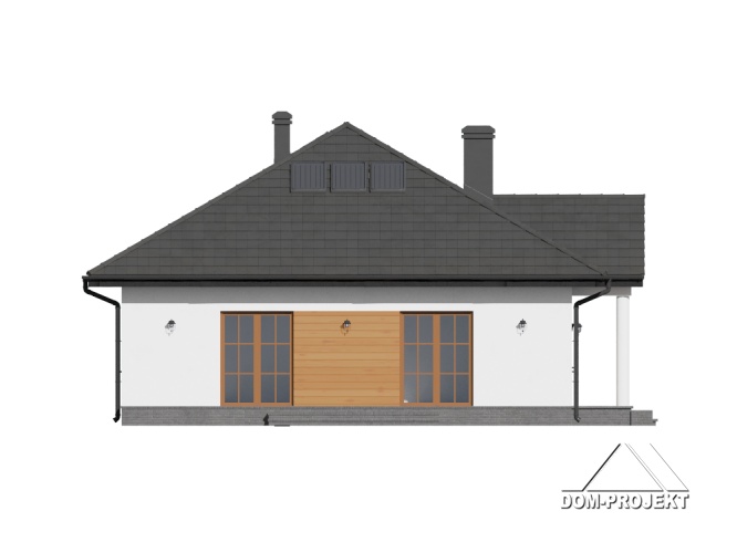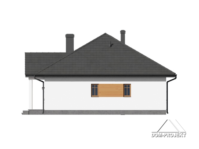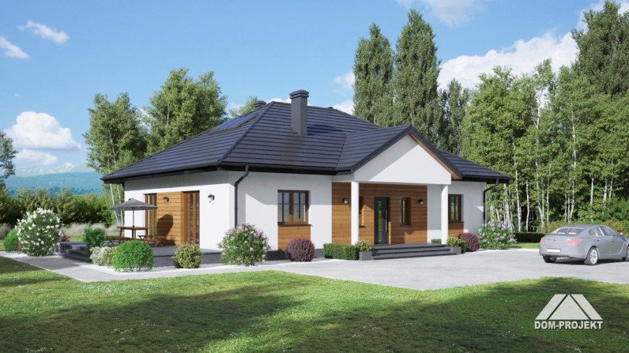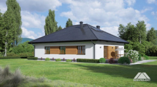 Dom parterowy. Duży salon z aneksem kuchennym, kominkiem i wyjściami na taras. Trzy pokoje- w tym jeden z własną garderobą. Łazienka, wc, kotłownia, wiatrołap, komunikacja. Wejście na strych schodami z wiatrołapu.