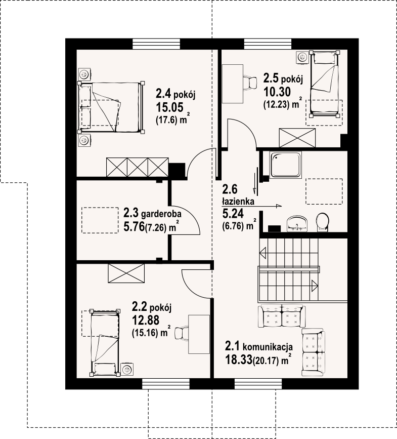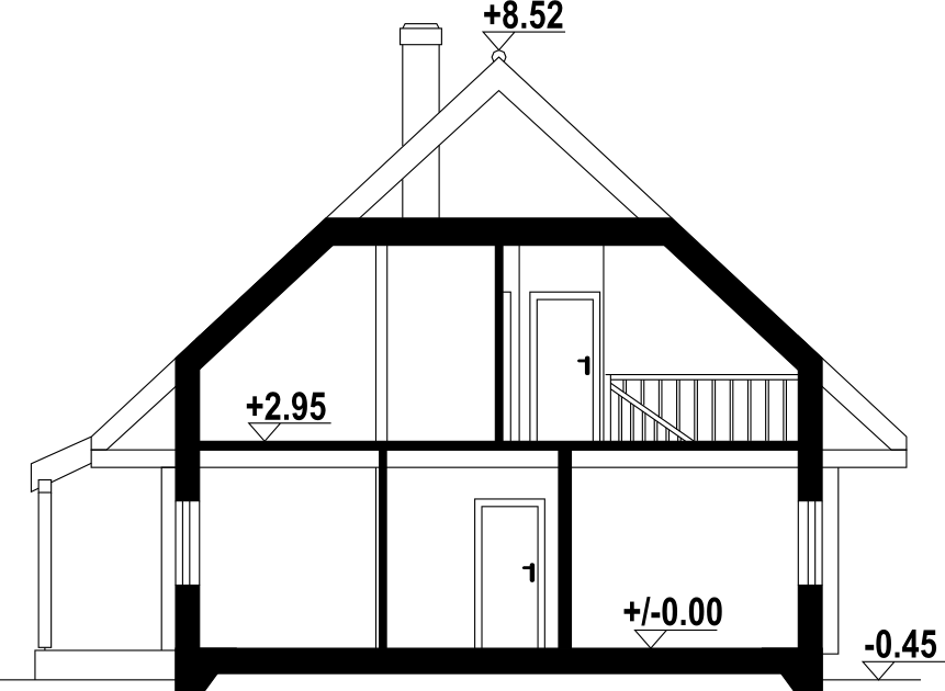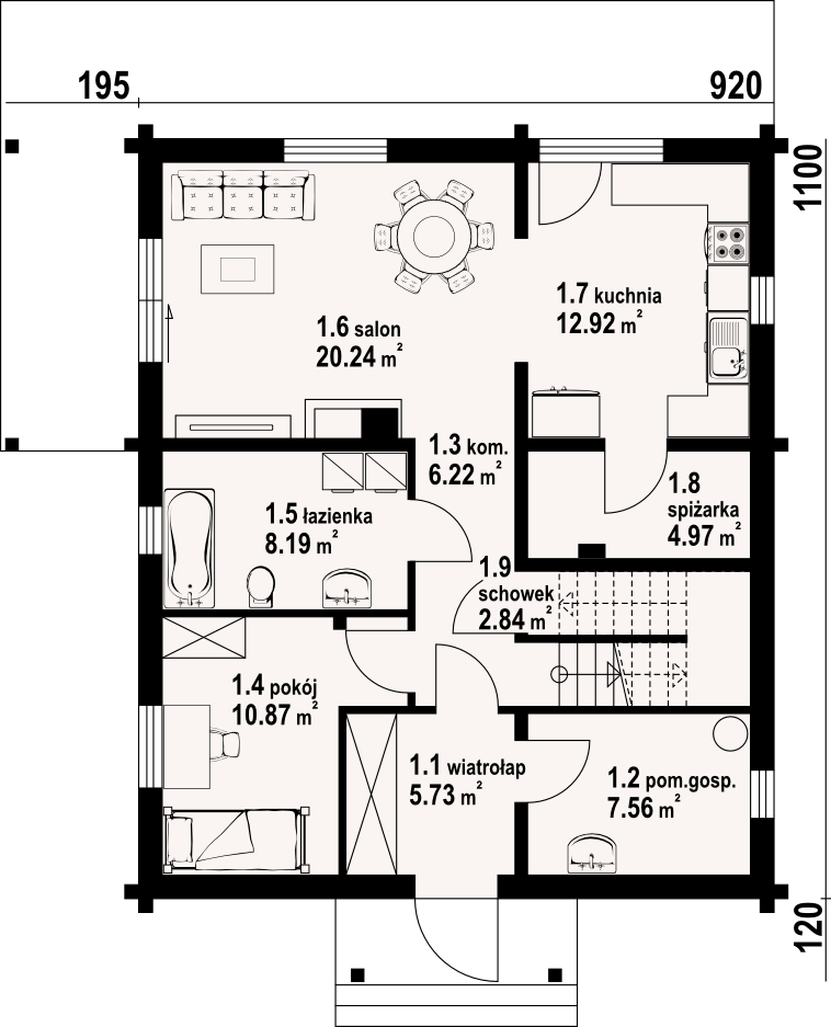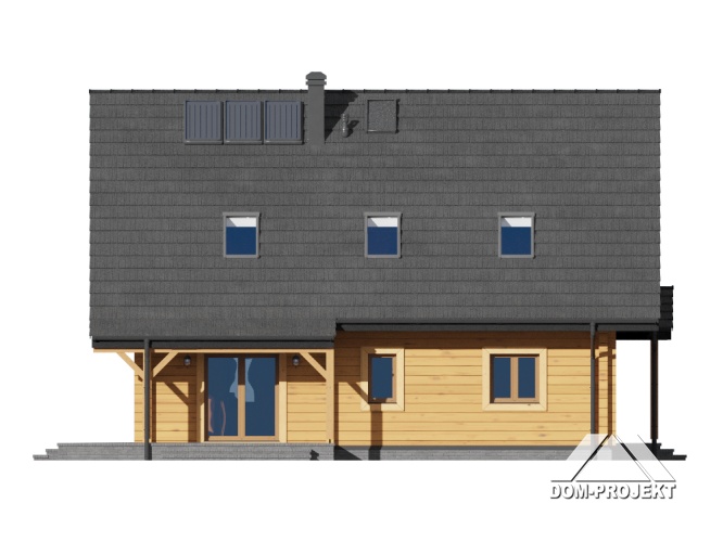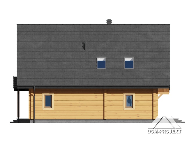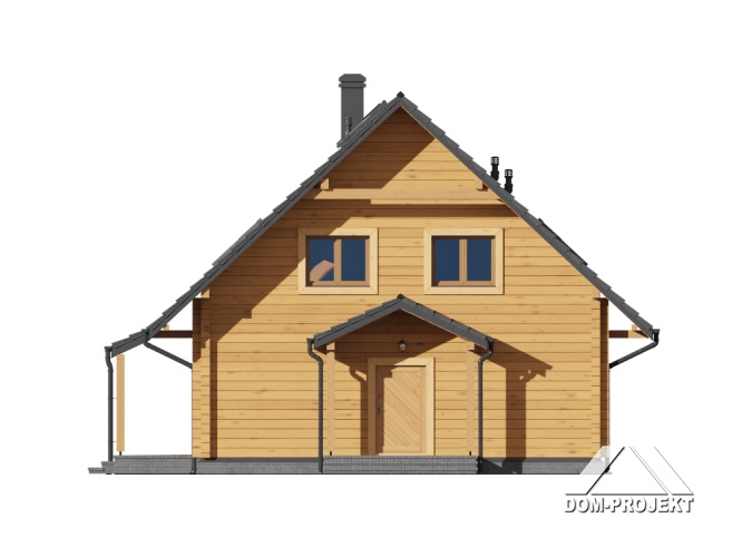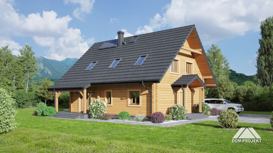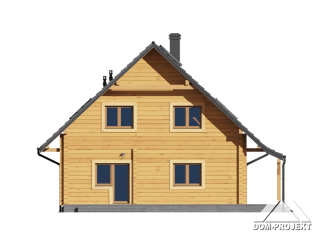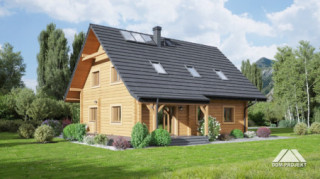Dom z bali z poddaszem użytkowym. Na parterze salon z kominkiem oraz wyjściem na zadaszony taras. Obok salonu duża, częściowo otwarta kuchnia. Spiżarka, pokój, łazienka, pomieszczenie gospodarcze, schowek, wiatrołap i komunikacja. Na poddaszu trzy pokoje, łazienka, garderoba oraz komunikacja. Zwarta bryła budynku i dach dwuspadowy sprzyjają szybkiej i taniej budowie i niskim kosztom eksploatacji.