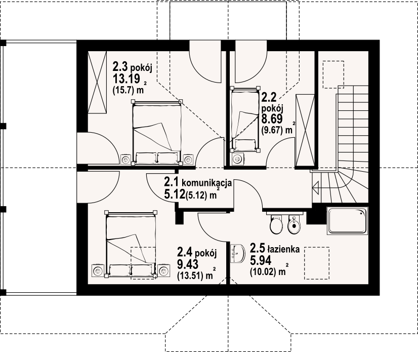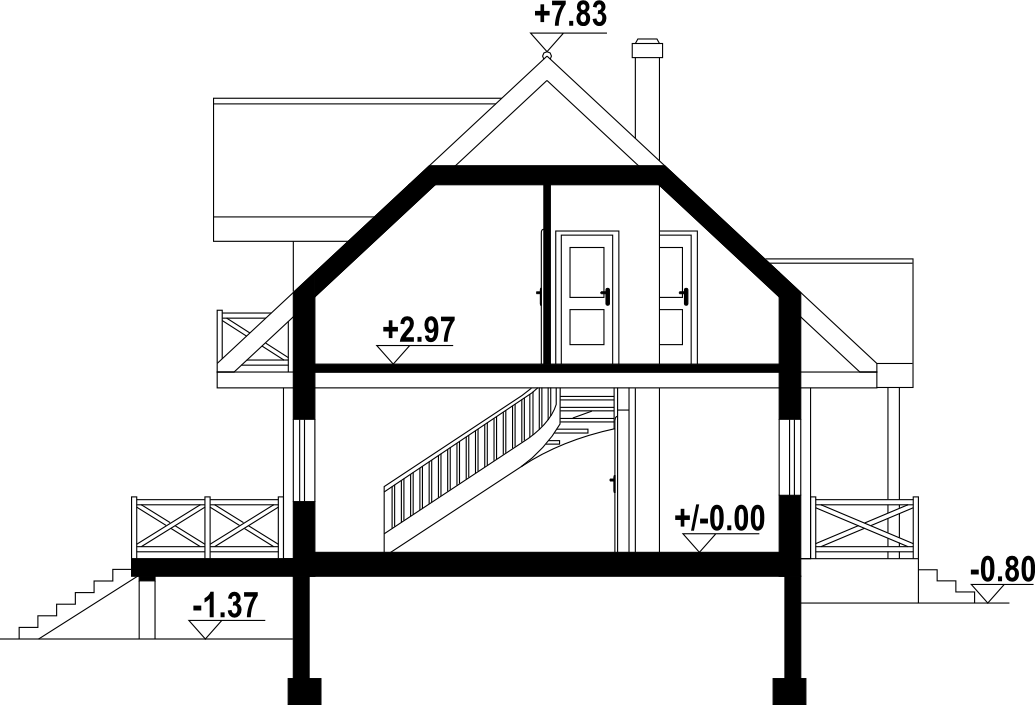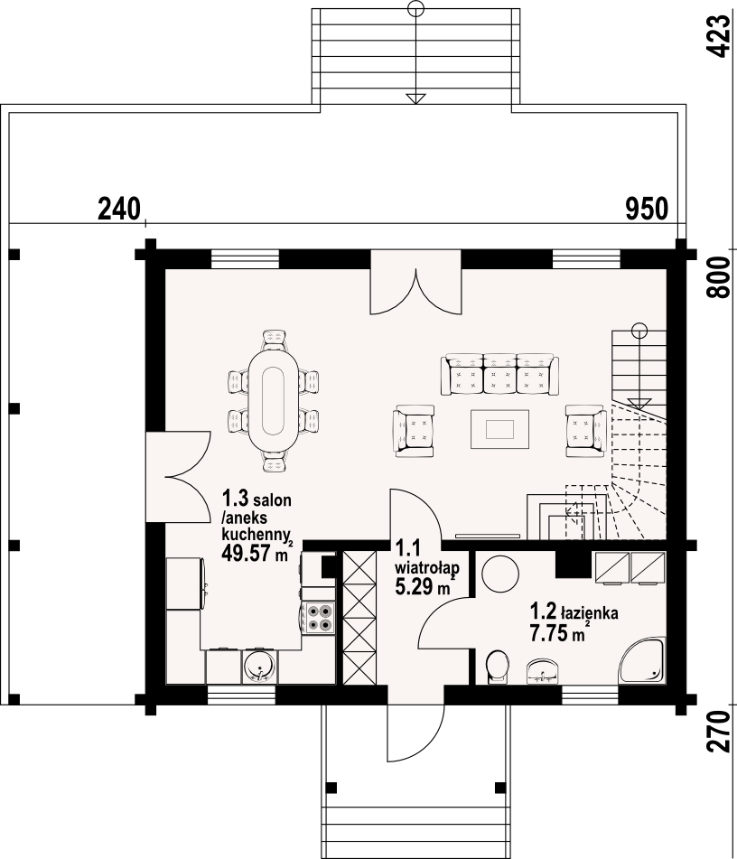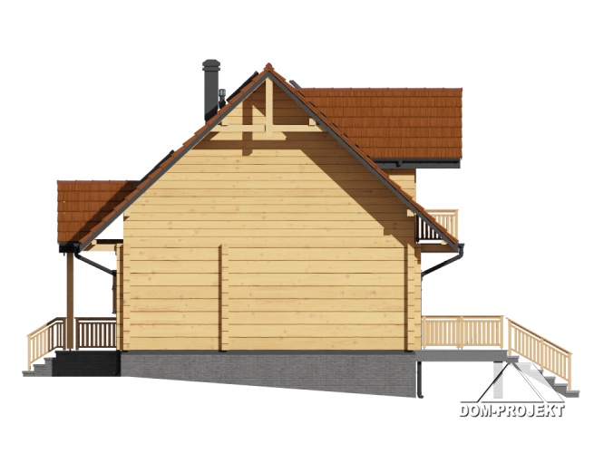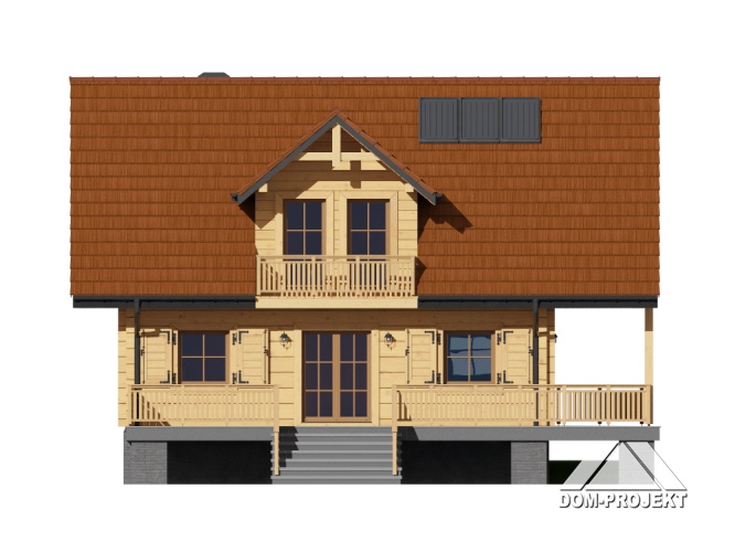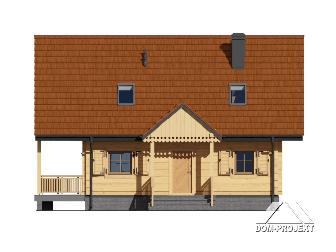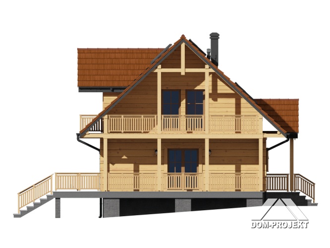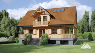 Dom z bali. Na parterze duży salon z aneksem kuchennym, kominkiem, schodami na poddasze i wyjściami na częściowo zadaszony taras, łazienka, wiatrołap. Na poddaszu trzy pokoje, łazienka, komunikacja. Dwa balkony. Zwarta bryła budynku i dach dwuspadowy sprzyjają szybkiej i taniej budowie oraz niskim kosztom eksploatacji.