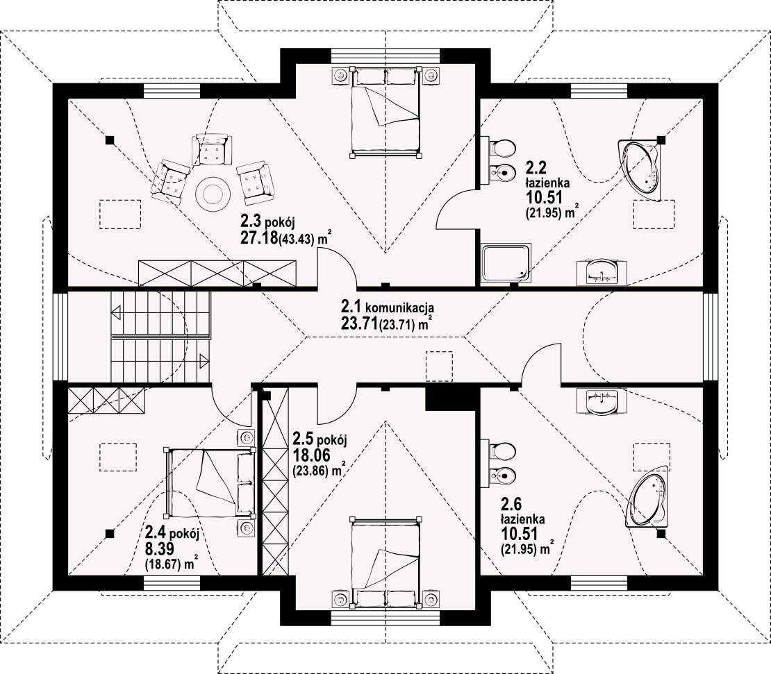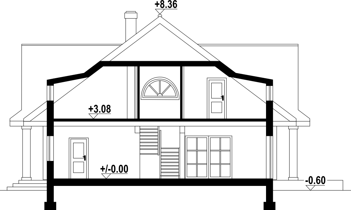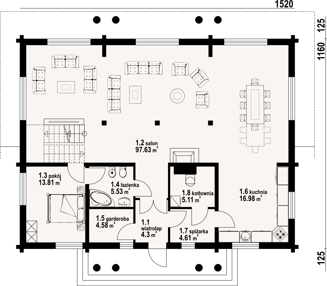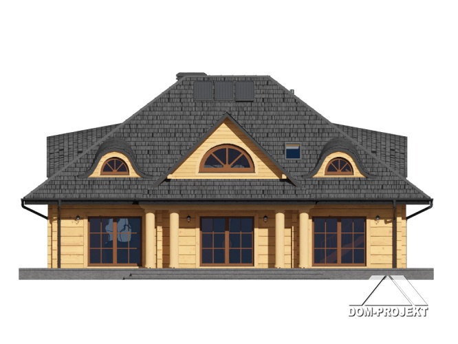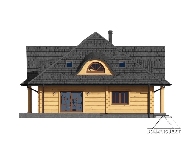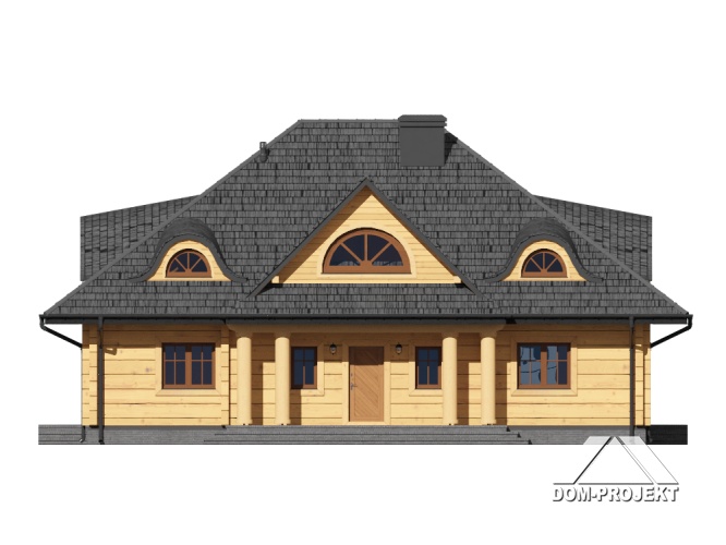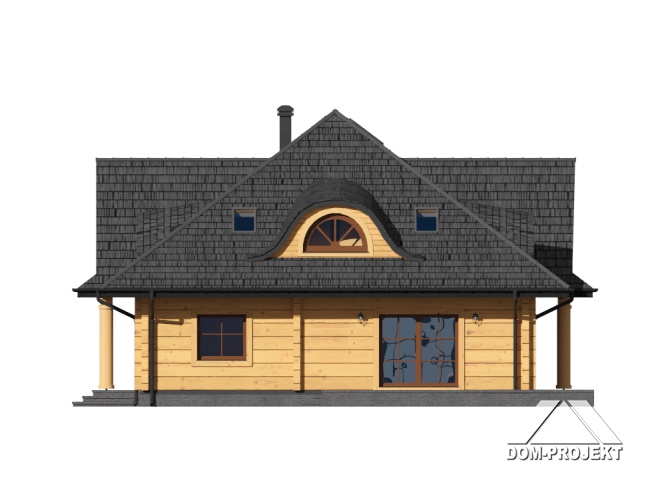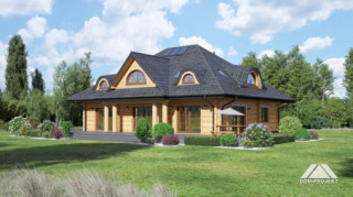Dom z bali drewnianych. Na parterze bardzo duży salon z kominkiem oraz wyjściami na taras. Duża i otwarta na salon kuchnia. Pokój, łazienka, garderoba, wiatrołap, spiżarka, kotłownia. Na poddaszu trzy pokoje, dwie duże łazienki i komunikacja.