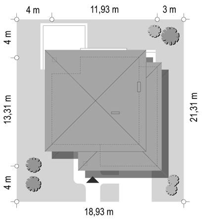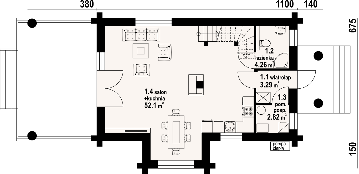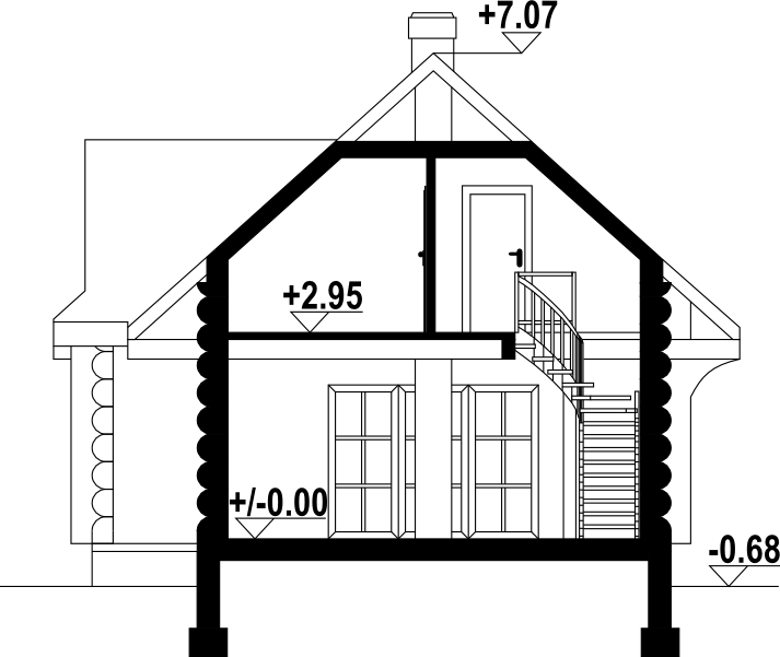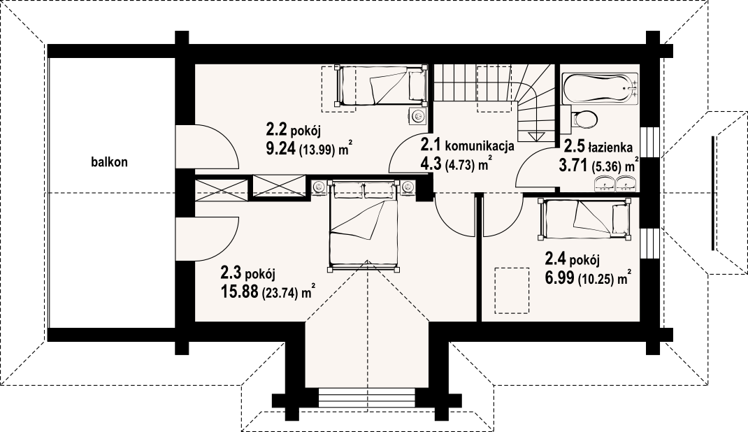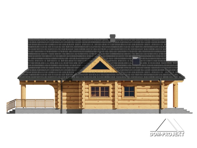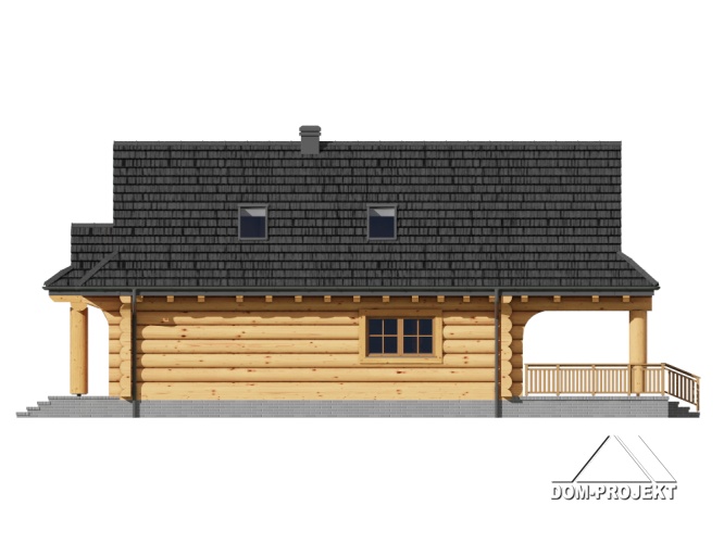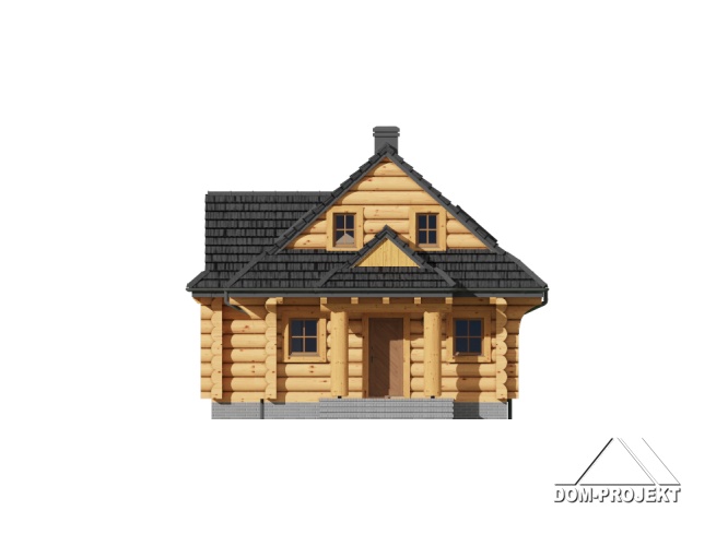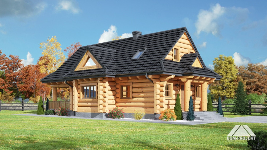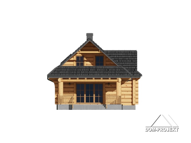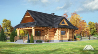 Dom z bali z poddaszem mieszkalnym. Na parterze duży salon z aneksem kuchennym, kominkiem oraz wyjściem na duży zadaszony taras. Łazienka, wiatrołap, pomieszczenie gospodarcze. Na poddaszu trzy pokoje, komunikacja oraz łazienka. Duży balkon dostępny z dwóch pokoi. Zwarta bryła budynku i dach dwuspadowy sprzyjają szybkiej i taniej budowie i niskim kosztom eksploatacji.