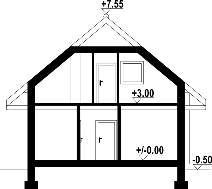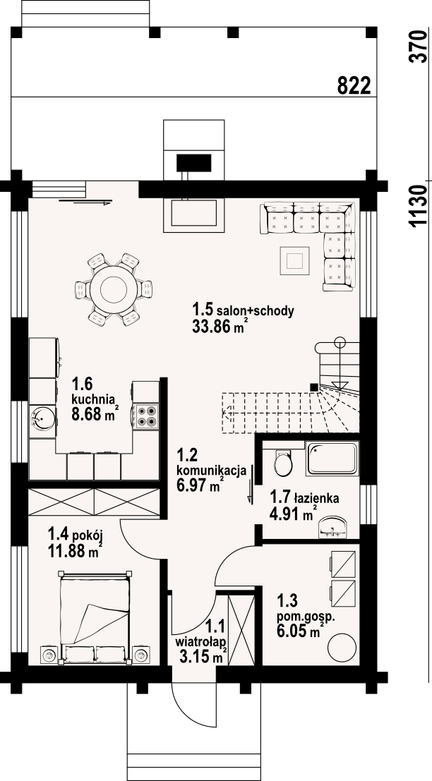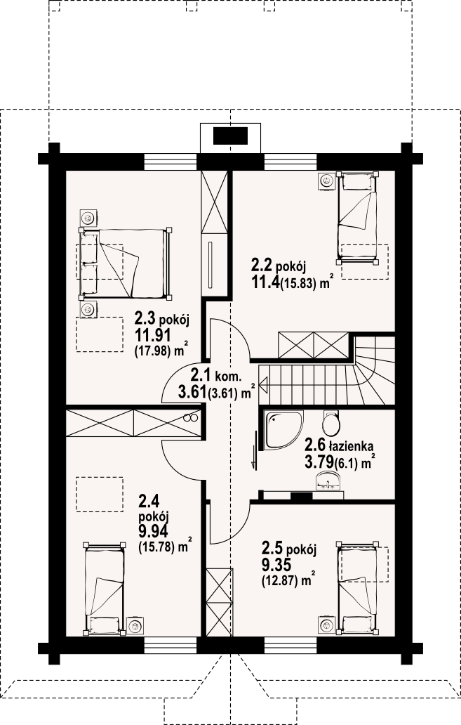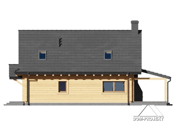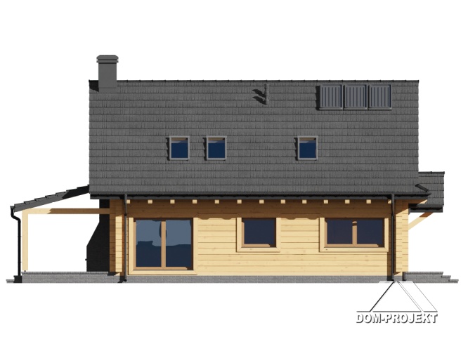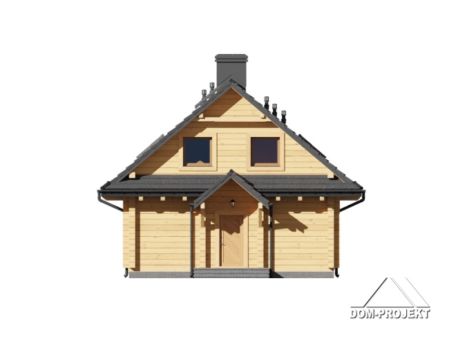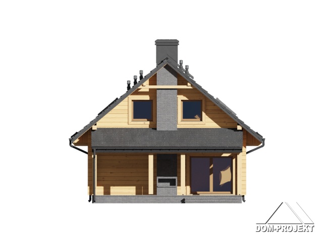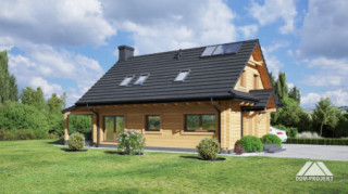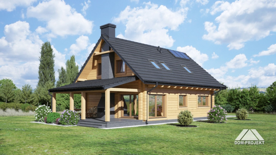 Dom z bali drewnianych. Na parterze duży salon z kuchnią, kominkiem, schodami na poddasze i wyjściem na zadaszony taras. Na tarasie kominek. Pokój, łazienka, pomieszczenie gospodarcze, wiatrołap, komunikacja. Na poddaszu cztery pokoje, łazienka i komunikacja. Zwarta bryła budynku i dach dwuspadowy sprzyjają szybkiej i taniej budowie i niskim kosztom eksploatacji.