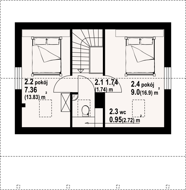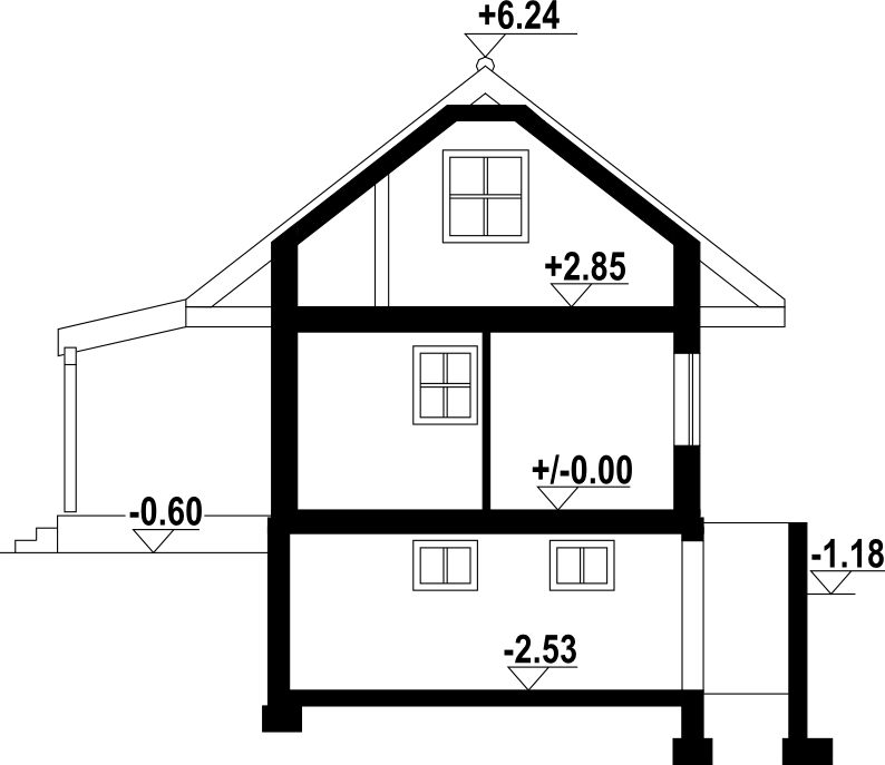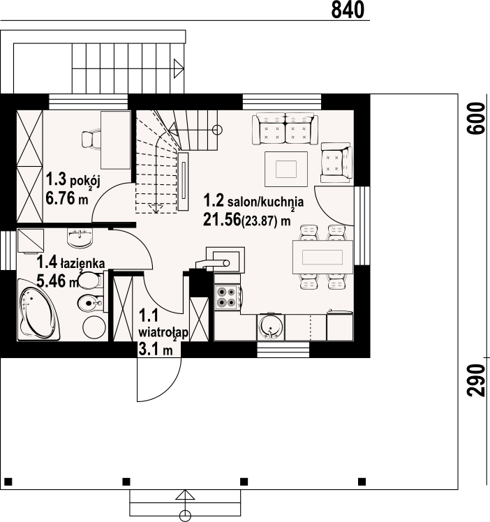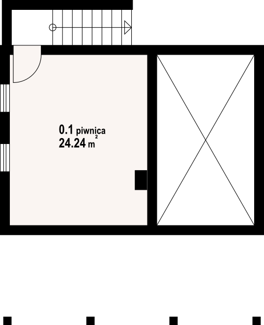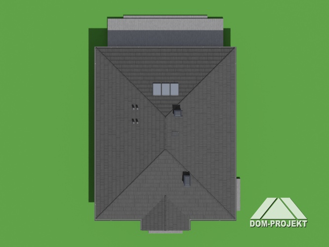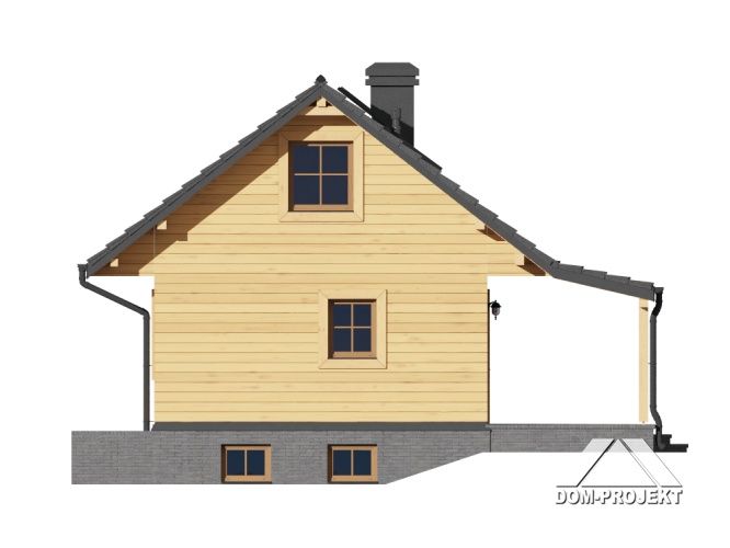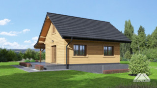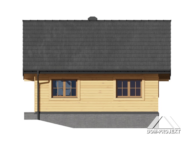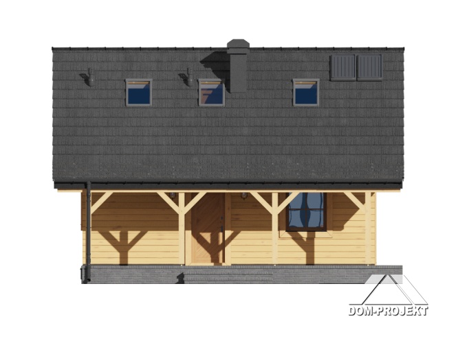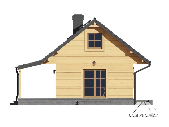 Nieduży dom w konstrukcji szkieletu drewnianego. Częściowo podpiwniczony. Na parterze salon z aneksem kuchennym, kominkiem oraz wyjściem na taras. Pokój, łazienka oraz wiatrołap. Na poddaszu dwa pokoje, wc i komunikacja. Zwarta bryła budynku i dach dwuspadowy sprzyjają szybkiej i taniej budowie oraz niskim kosztom eksploatacji.
