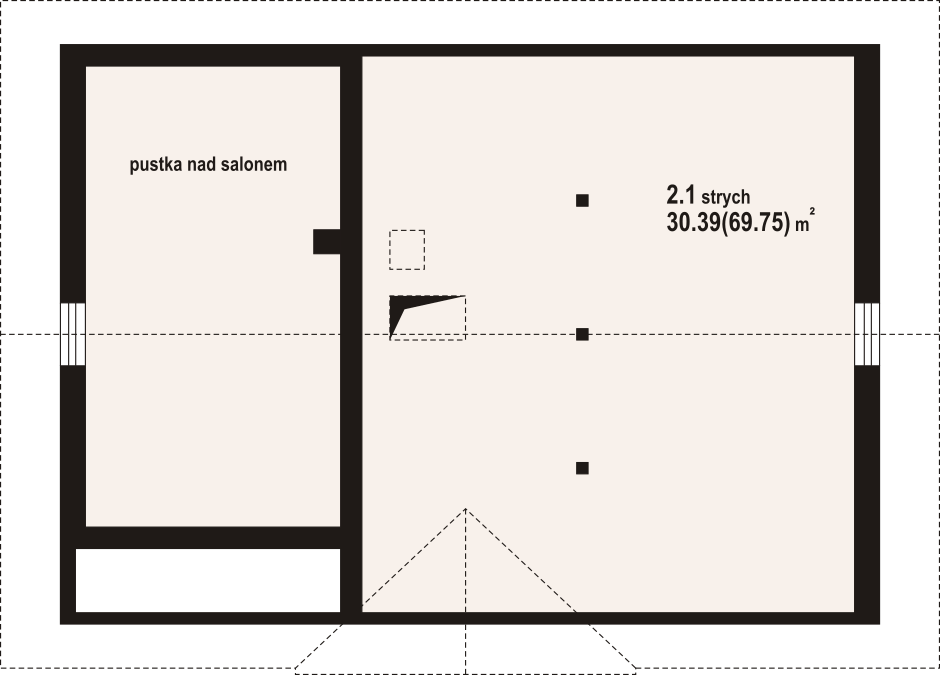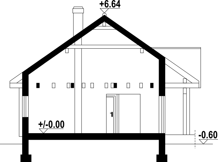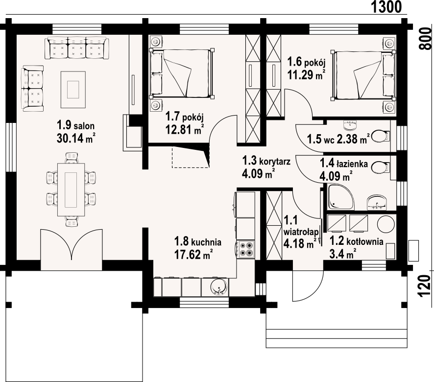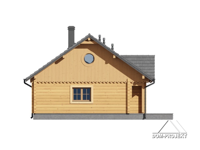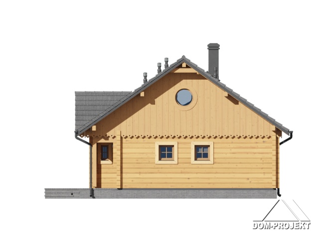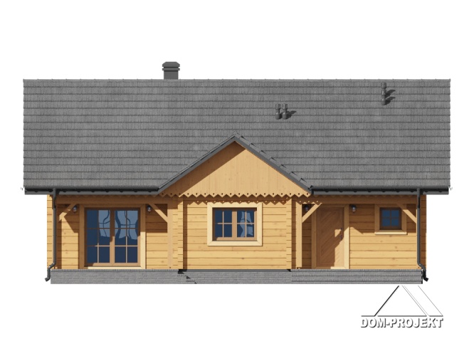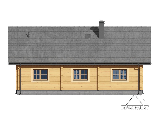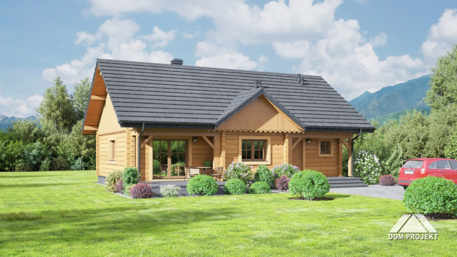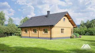 Parterowy dom z bali. Duży salon z kominkiem oraz wyjściem na częściowo zadaszony taras. Duża otwarta kuchnia, dwa pokoje, łazienka, wc, kotłownia, wiatrołap i korytarz. Zwarta bryła budynku oraz dach dwuspadowy sprzyjają szybkiej i taniej budowie i niskim kosztom eksploatacji.