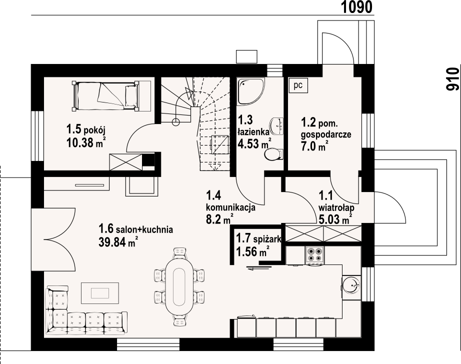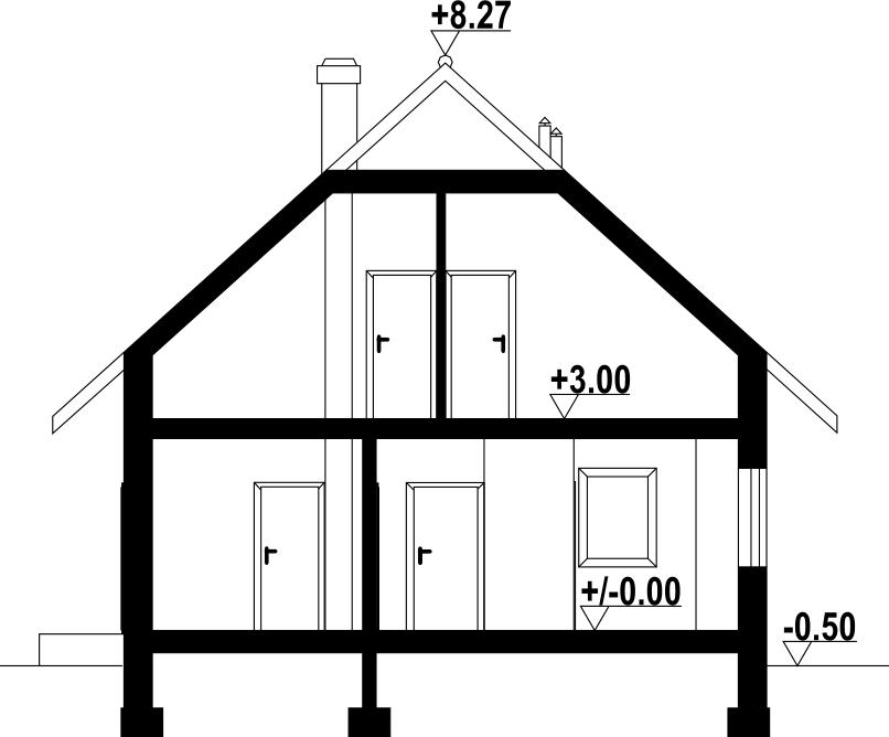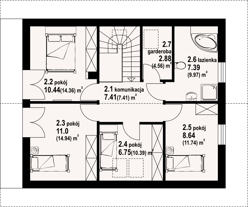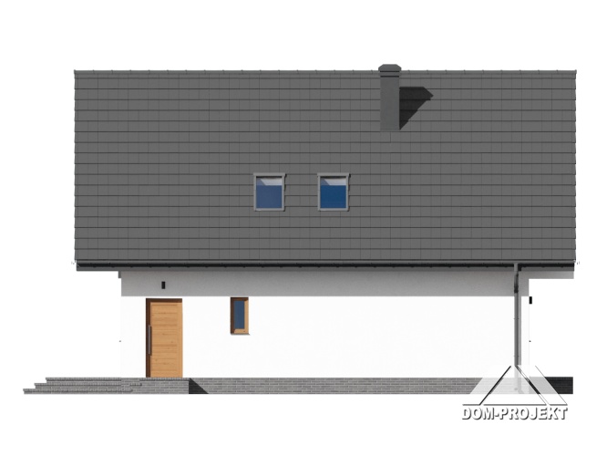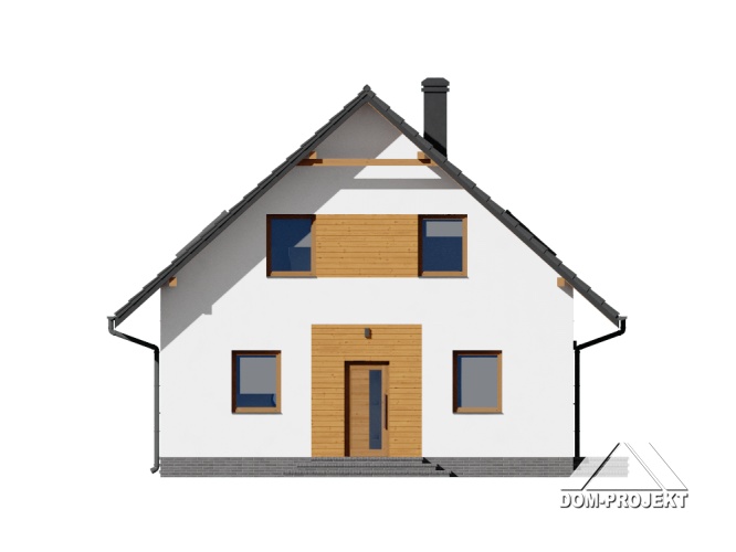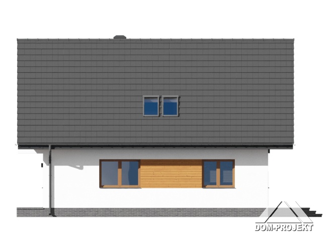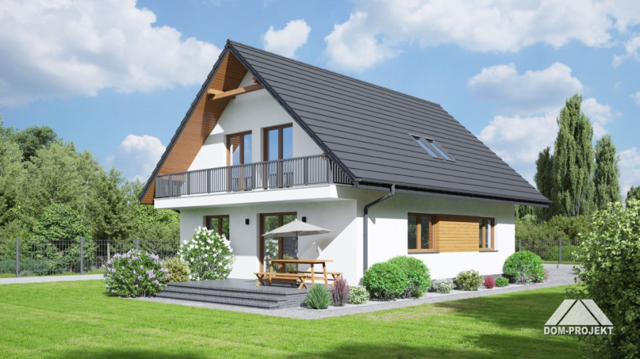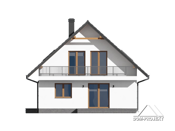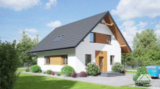 Dom z poddaszem użytkowym. Na parterze duży salon z aneksem kuchennym, kominkiem i wyjściem na taras. Pokój, łazienka, pomieszczenie gospodarcze, spiżarka, komunikacja oraz wiatrołap. Na poddaszu cztery pokoje, łazienka, komunikacja oraz garderoba. Balkon dostępny z dwóch pokoi. Zwarta bryła budynku oraz dach dwuspadowy sprzyjają szybkiej i taniej budowie oraz niskim kosztom eksploatacji.