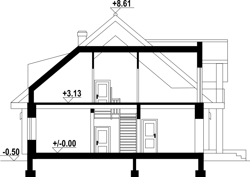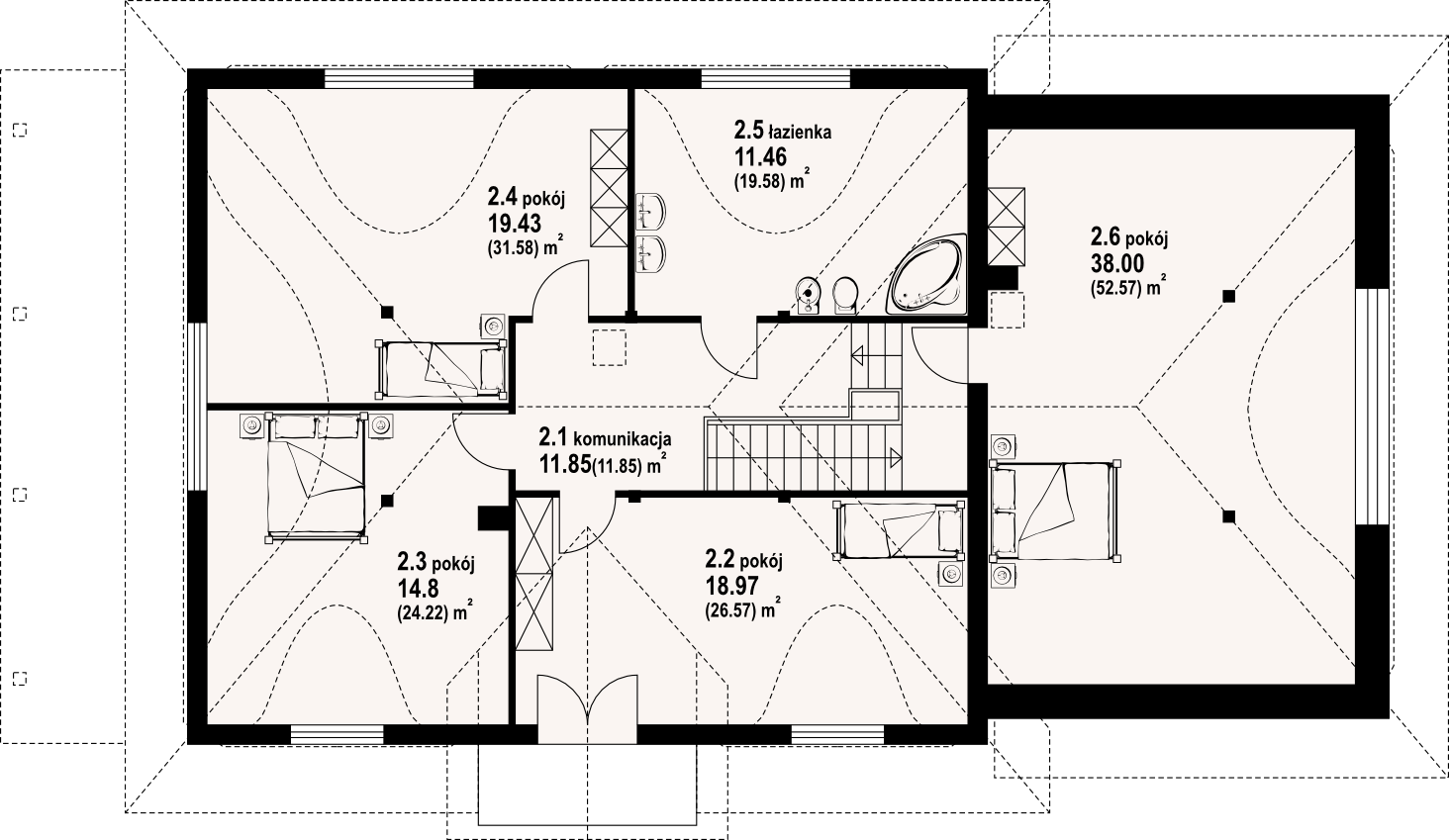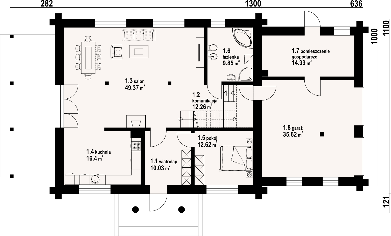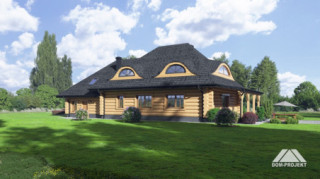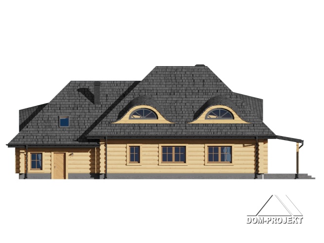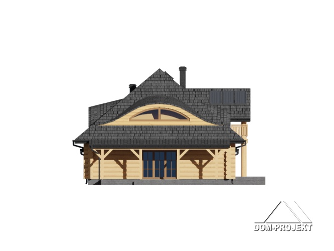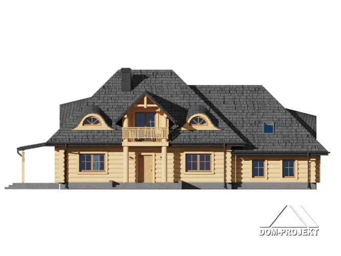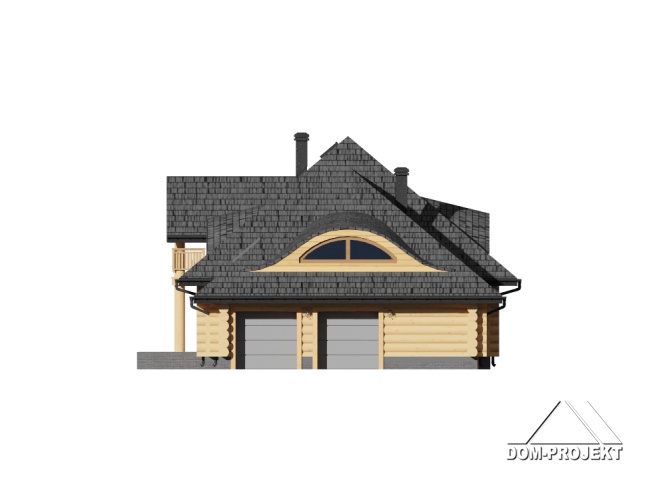 Dom z bali z poddaszem użytkowym. Na parterze duży salon z kominkiem oraz wyjściem na zadaszony taras. Duża kuchnia, pokój, łazienka, wiatrołap, komunikacja, garaż na dwa samochody oraz pomieszczenie gospodarcze. Na poddaszu cztery pokoje, łazienka, komunikacja.