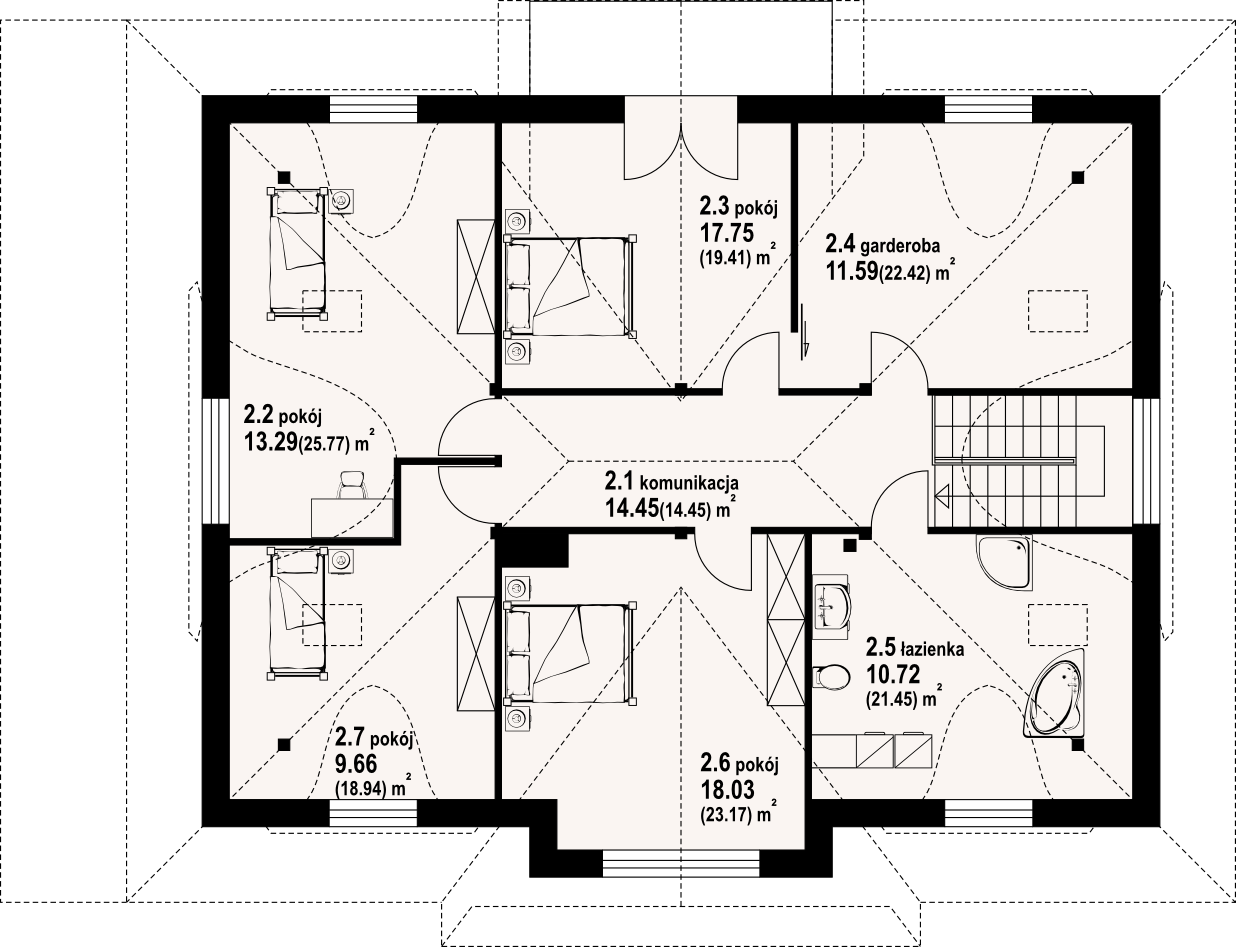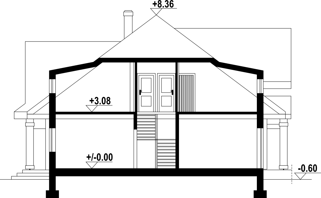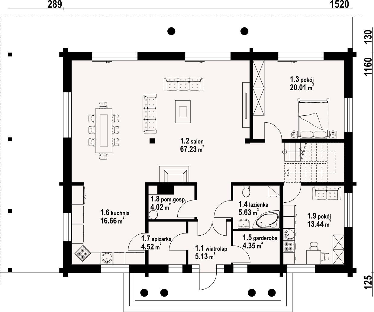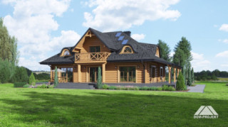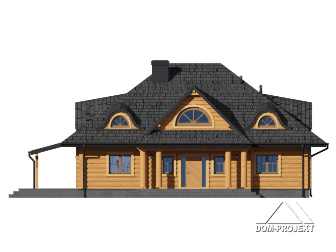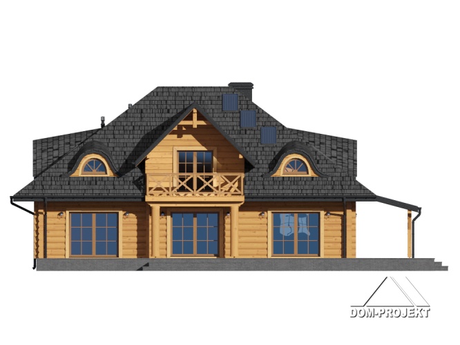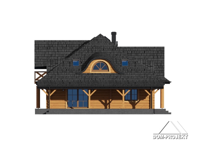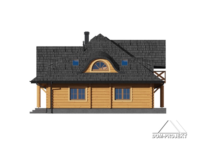Dom z bali z poddaszem użytkowym. Na parterze duży salon z kominkiem oraz wyjściami na zadaszony taras. Duża, częściowo wydzielona kuchnia, dwa pokoje, łazienka, garderoba, pomieszczenie gospodarcze, spiżarka oraz wiatrołap. Na poddaszu cztery pokoje, łazienka, garderoba i komunikacja.