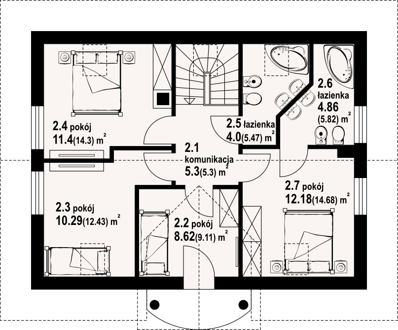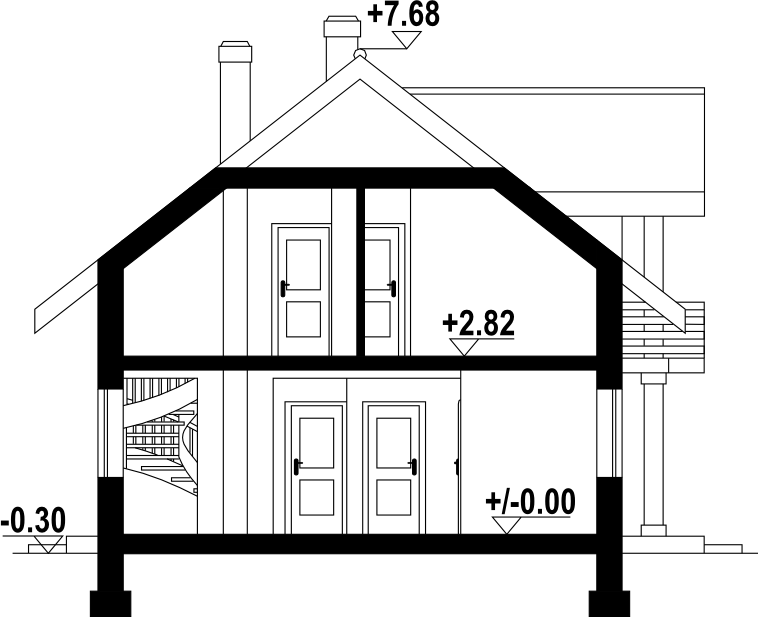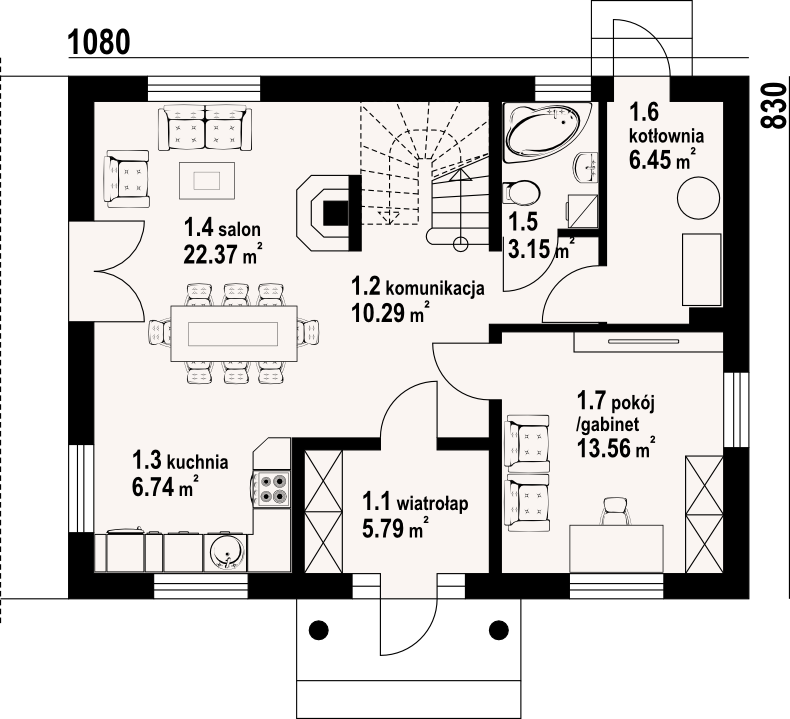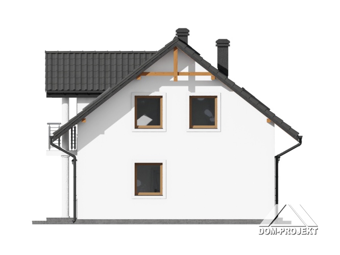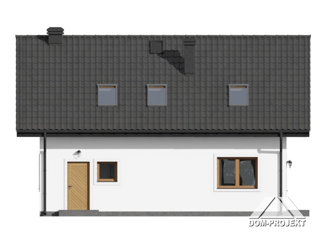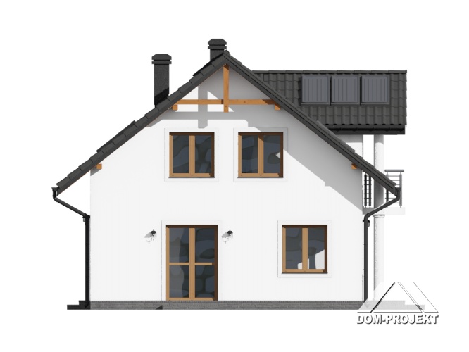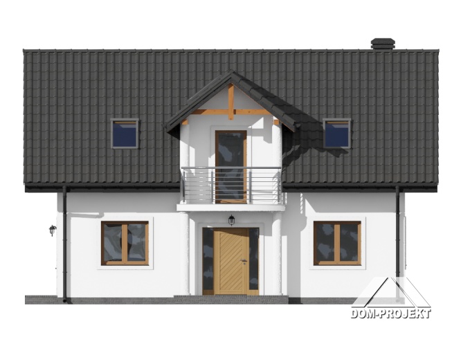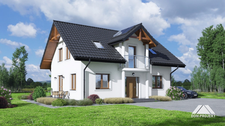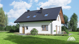 Dom z poddaszem użytkowym. Na parterze salon z aneksem kuchennym, kominkiem oraz wyjściem na taras. Pokój-gabinet, łazienka, kotłownia, wiatrołap i komunikacja. Na poddaszu cztery pokoje, dwie łazienki, komunikacja oraz balkon. Zwarta bryła budynku oraz dach dwuspadowy sprzyjają szybkiej i taniej budowie oraz niskim kosztom eksploatacji.