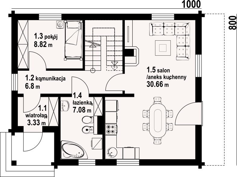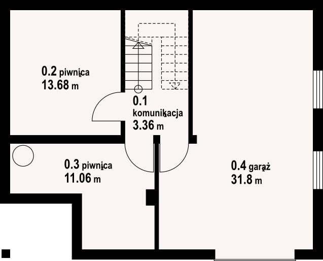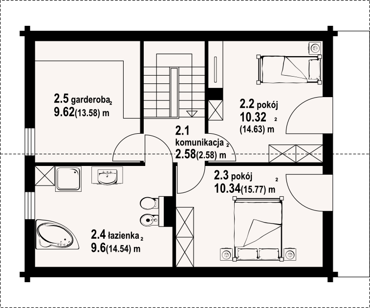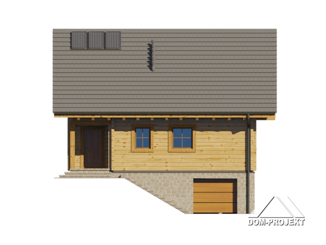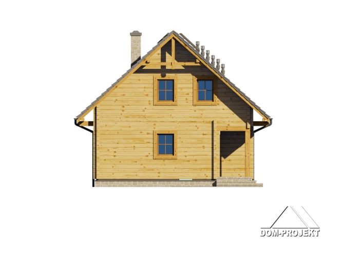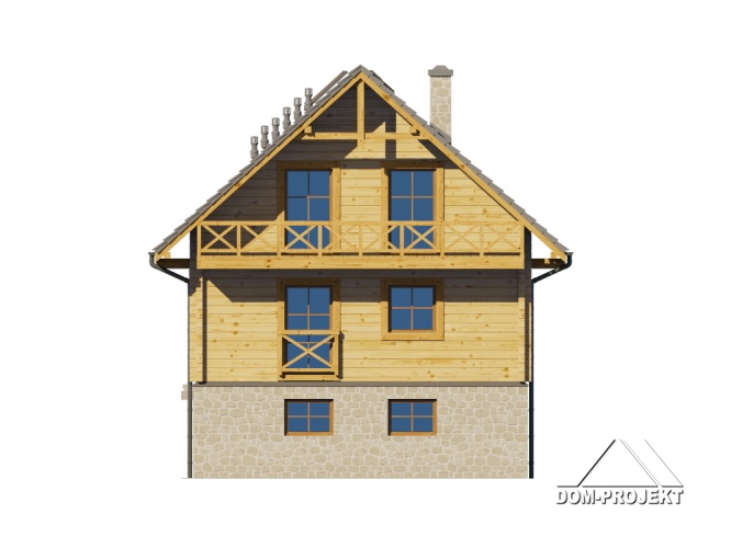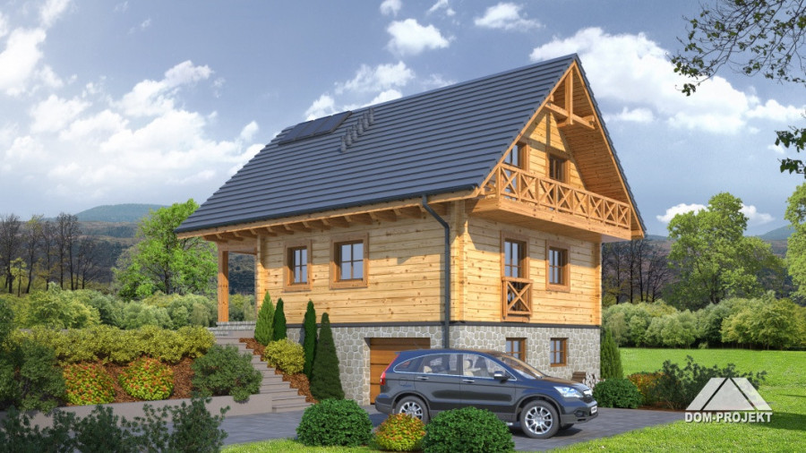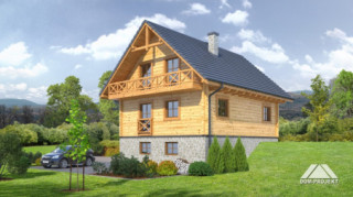 Dom z bali drewnianych. Podpiwniczony. Na parterze duży salon z aneksem kuchennym oraz kominkiem. Pokój, łazienka, komunikacja, wiatrołap. Na poddaszu dwa wygodne pokoje,duża łazienka, garderoba, komunikacja oraz balkon. W podpiwniczeniu garaż, dwie piwnice oraz komunikacja. Zwarta bryła budynku oraz dach dwuspadowy sprzyjają szybkiej i taniej budowie oraz niskim kosztom eksploatacji.
