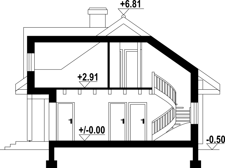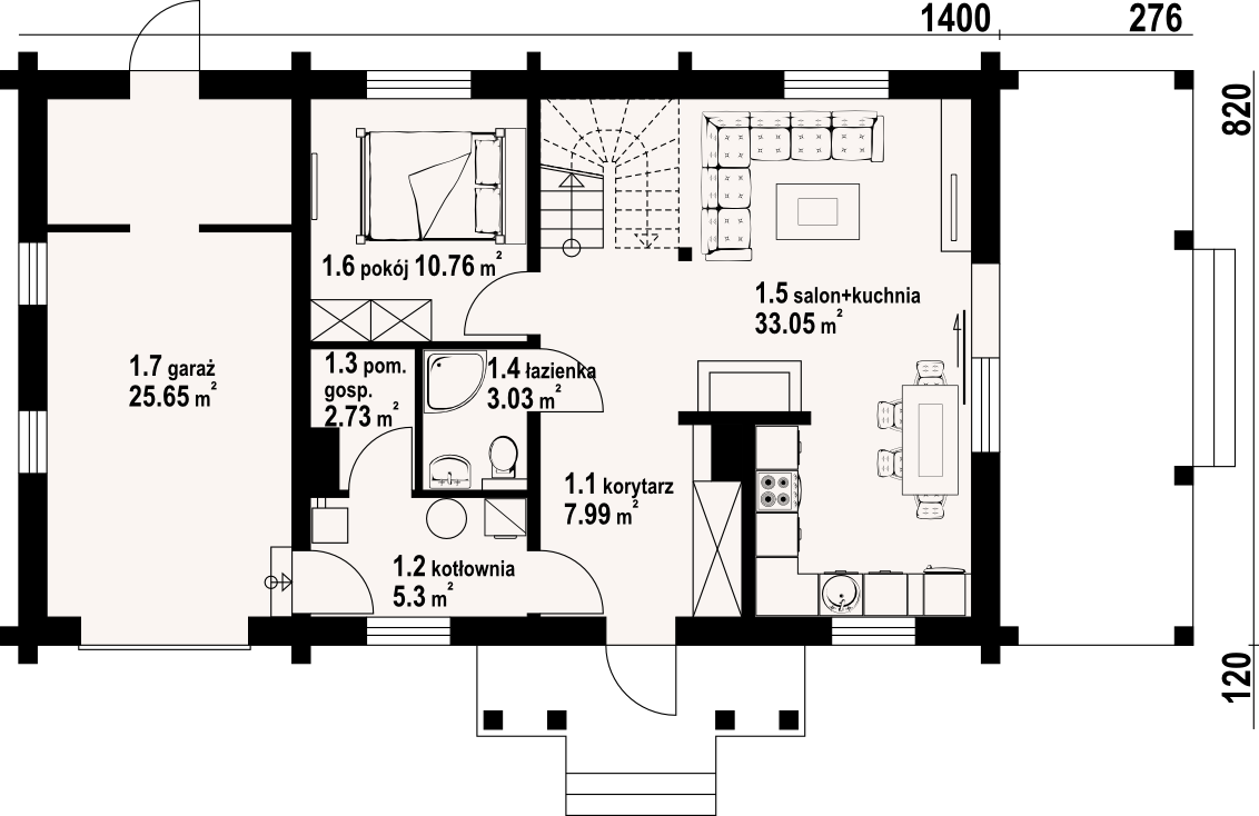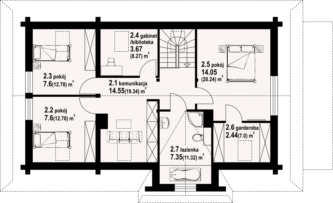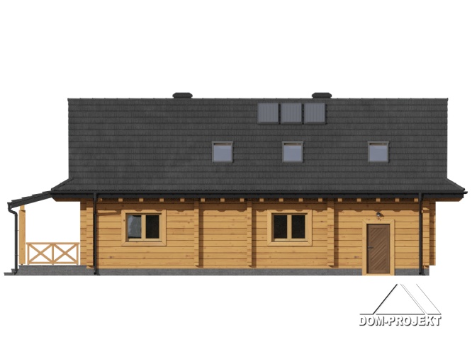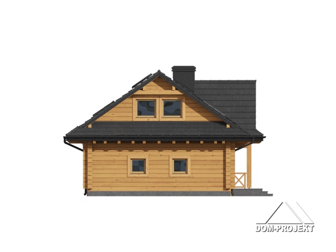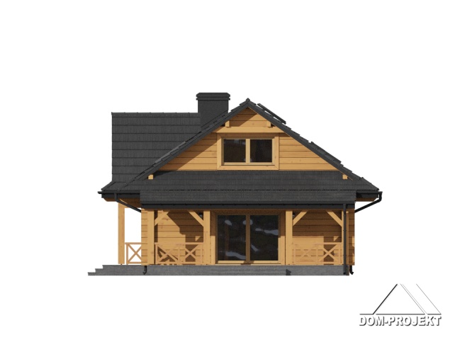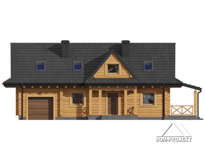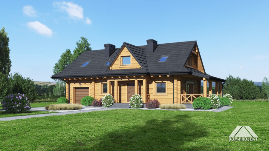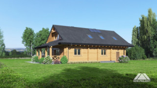 Dom z bali. Na parterze duży salon z kuchnią, kominkiem, schodami na poddasze oraz wyjściem na zadaszony taras. Pokój, łazienka, kotłownia, pomieszczenie gospodarcze, korytarz oraz garaż. Na poddaszu cztery wygodne pokoje, garderoba, łazienka oraz komunikacja. Zwarta bryła budynku oraz dach dwuspadowy sprzyjają szybkiej i taniej budowie oraz niskim kosztom eksploatacji.